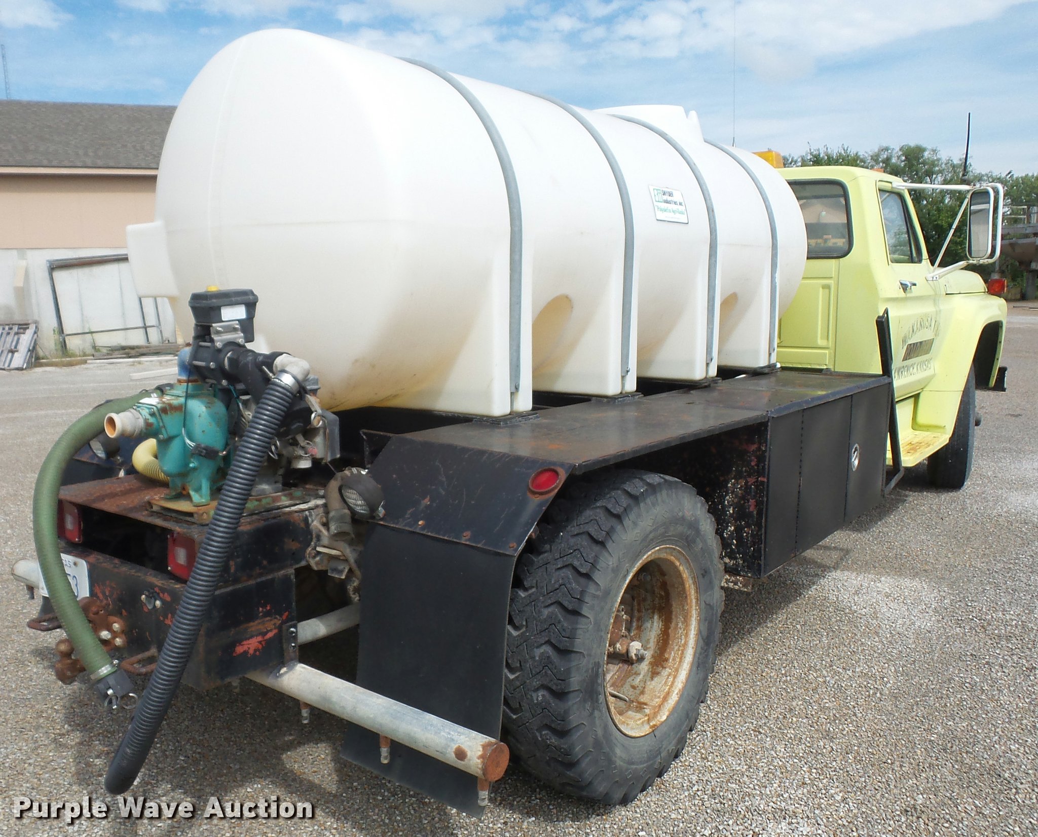 Purple Wave is selling a used Tank Truck or Water Truck in Kansas. This item is a 1978 Ford F700 tank truck with the following: 14,840 miles on odometer, Actual mileage unknown, Ford V8 gas engine, Five speed manual transmission, Two speed rear end, Single axle, Heat, PTO, 13'L tank bed, 1,025 gallon capacity, Pintle hitch, 8' rear spray bar, (2) toolboxes, Electric valve, 2" pump, Tecumseh gas engine, 5HP, Additional filters included, Single fuel tank, Spring suspension, Hydraulic brakes, GVWR 24,000 lbs