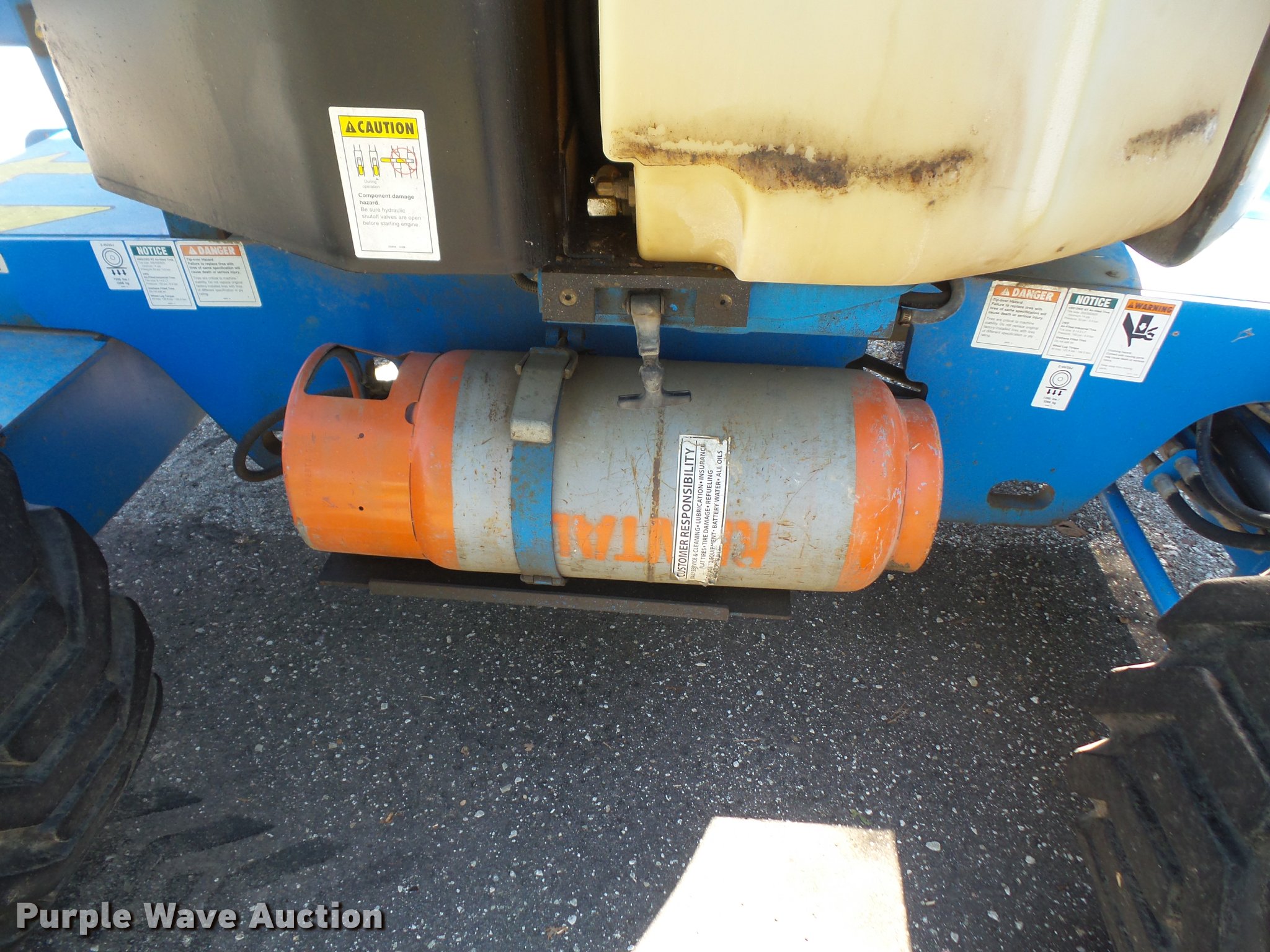 Purple Wave is selling a used Boom Lift in Kansas. This item is a 2005 Genie Z45/25J boom lift with the following: 1,994 hours on meter, Four cylinder dual fuel engine, Propane or gas capable, 82 HP, Four wheel drive, 500 lbs max lift capacity, 25'3" max reach length, 45.6' max lift height, Hydraulic leveling, Platform and ground controls, 6'L x 30"W platform, AC power outlet, Hydraulic platform rotation, 355/55D625 NHS tires, Serial Z452505-24845