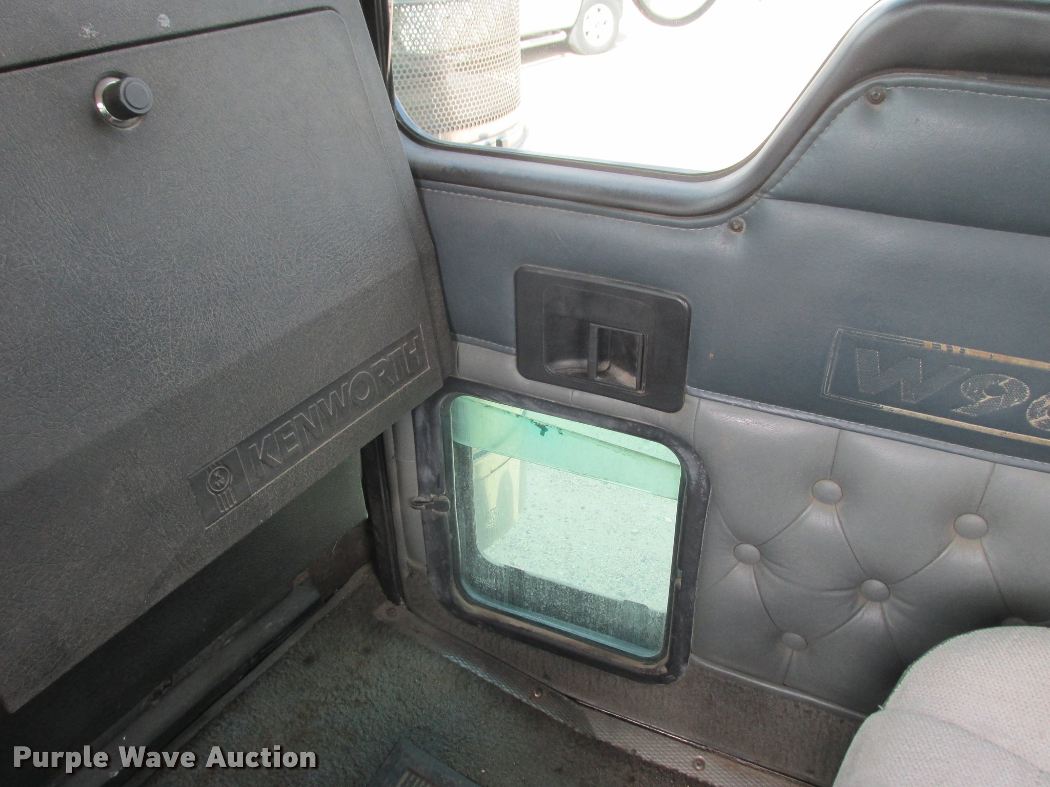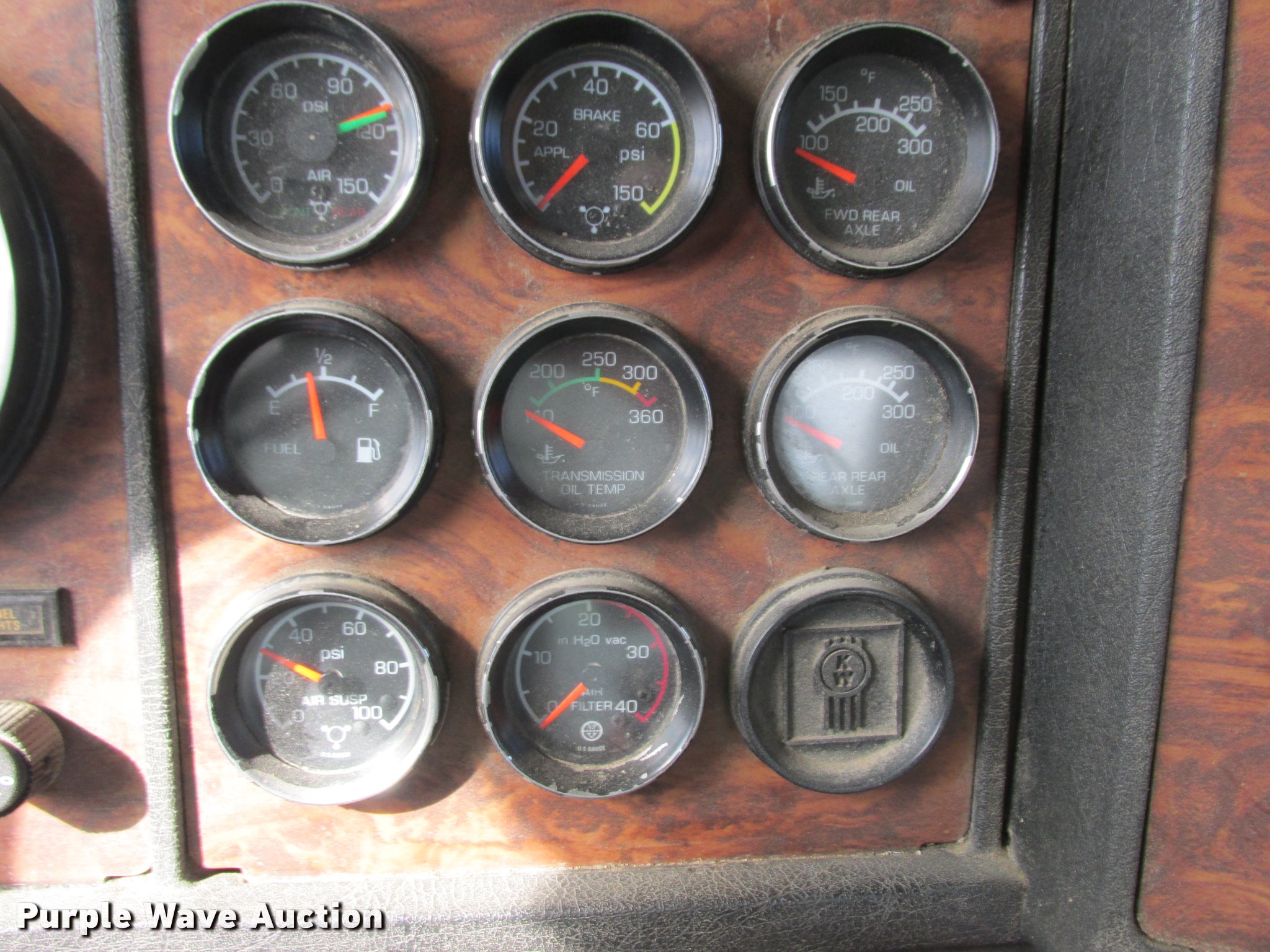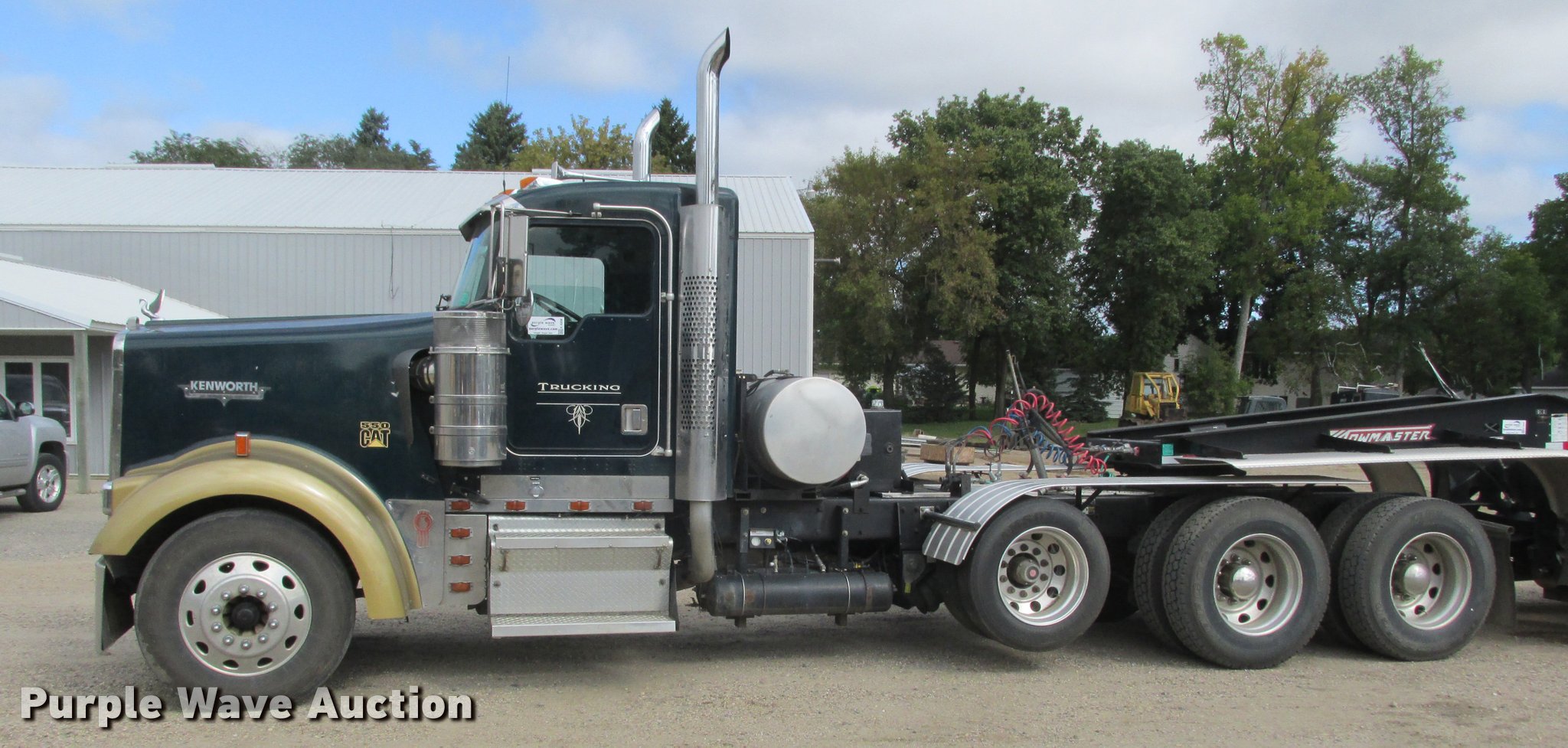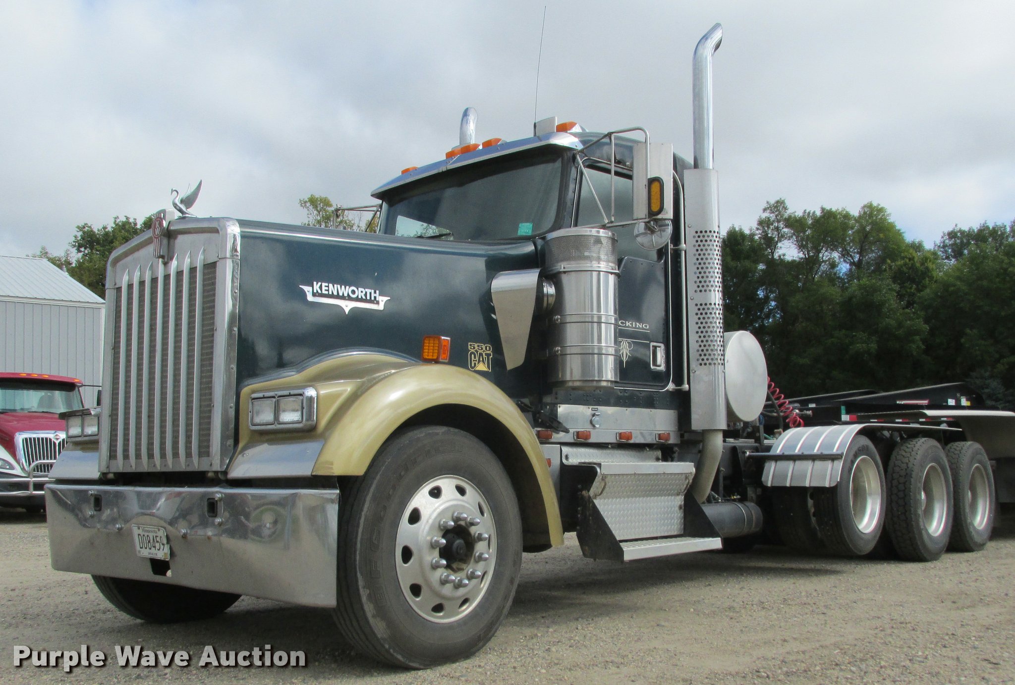 Purple Wave is selling a used Truck Tractor in Minnesota. This item is a 2000 Kenworth W900L semi truck with the following: 850,012 miles on odometer, Caterpillar C15 14.6L L6 turbo diesel engine, Eaton Fuller 15 speed manual transmission, Triple axle, Inter-axle differential lock, AC and heat, Tilt, Cruise, Power passenger window, Heated mirrors, Air suspension seat, Air ride cab, Tarp controls, Side dump controls, Backup alarm, Block heater, Exterior visor, Wet kit, Aluminum deck plate, Air operated sliding fifth wheel plate, Dual rear exhaust stacks, Single fuel tank, Aluminum full fenders, Mud flaps, 260" wheelbase, Air suspension, Air brakes, Engine brake, Aluminum wheels, 11R24.5 tires, 255/70R22.5 pusher axle tires, GVWR 48,000 lbs, FAWR 12,000 lbs, PAWR 20,000 lbs, DAWR 34,000 lbs, Unused front bumper installed Oct. 2016