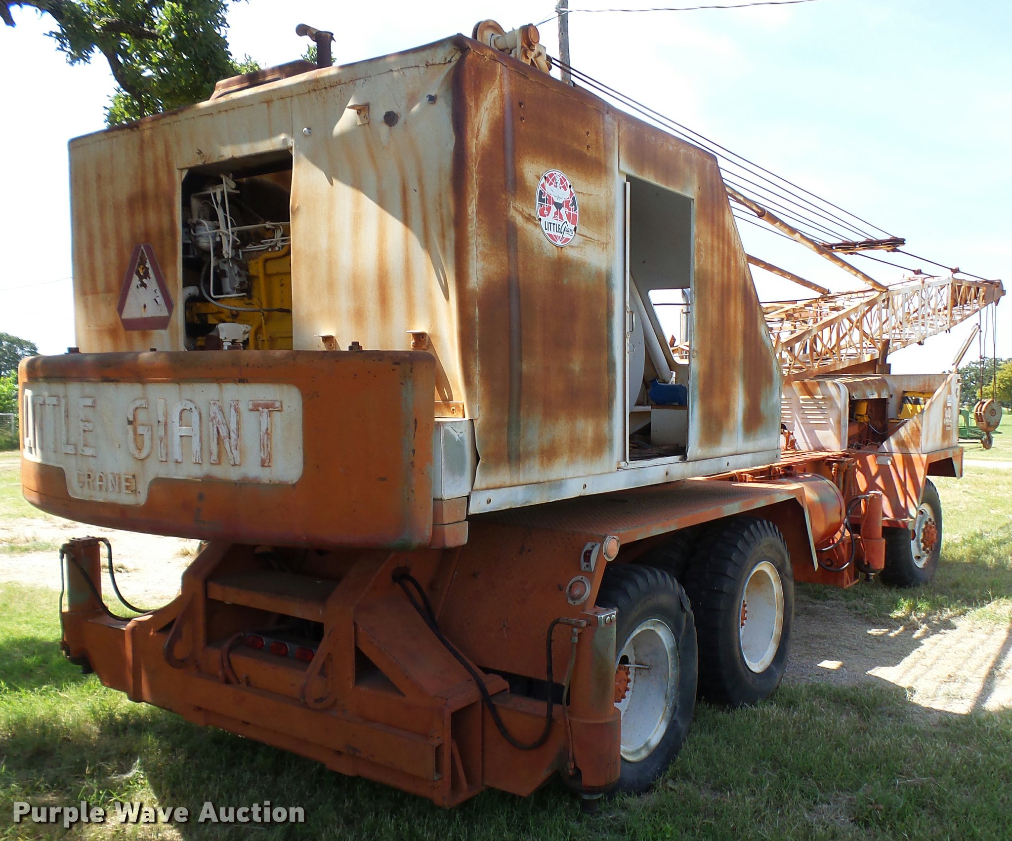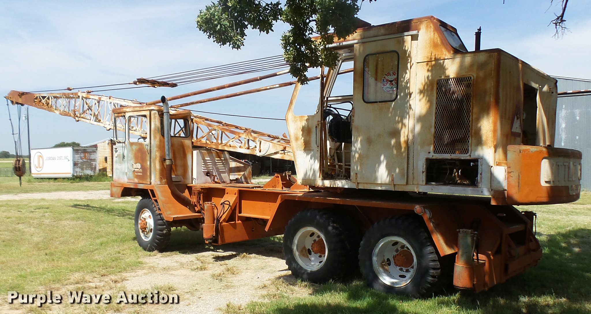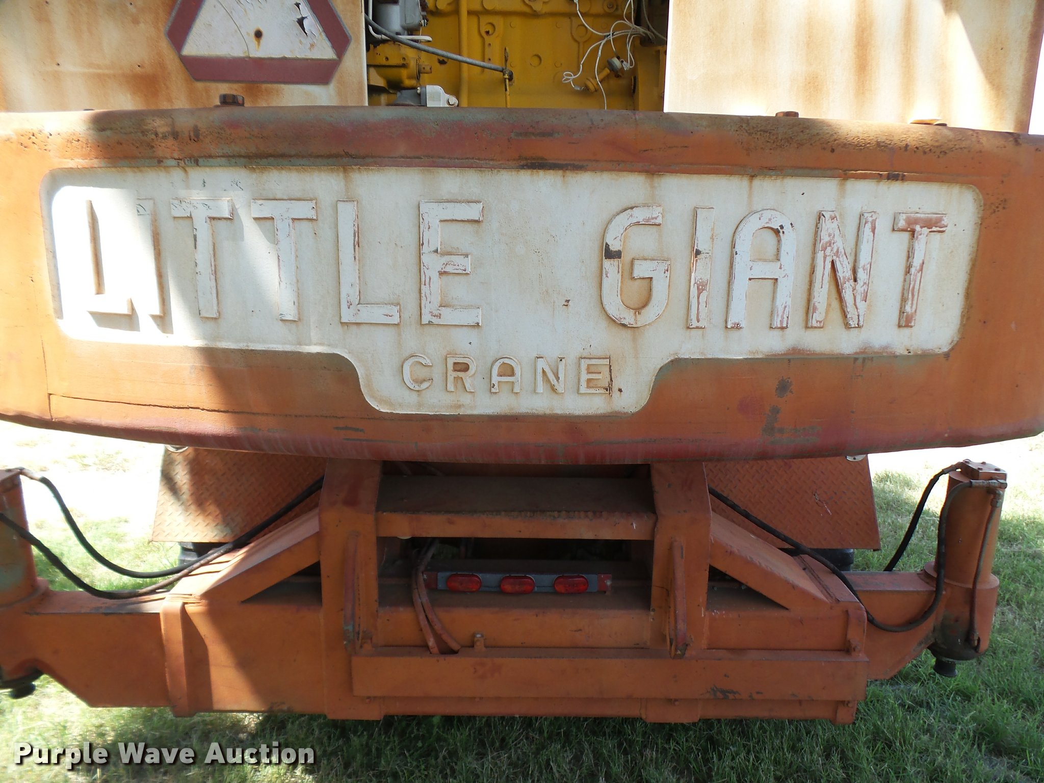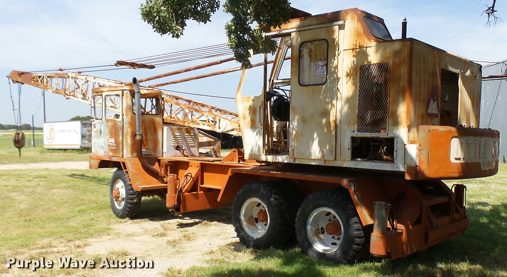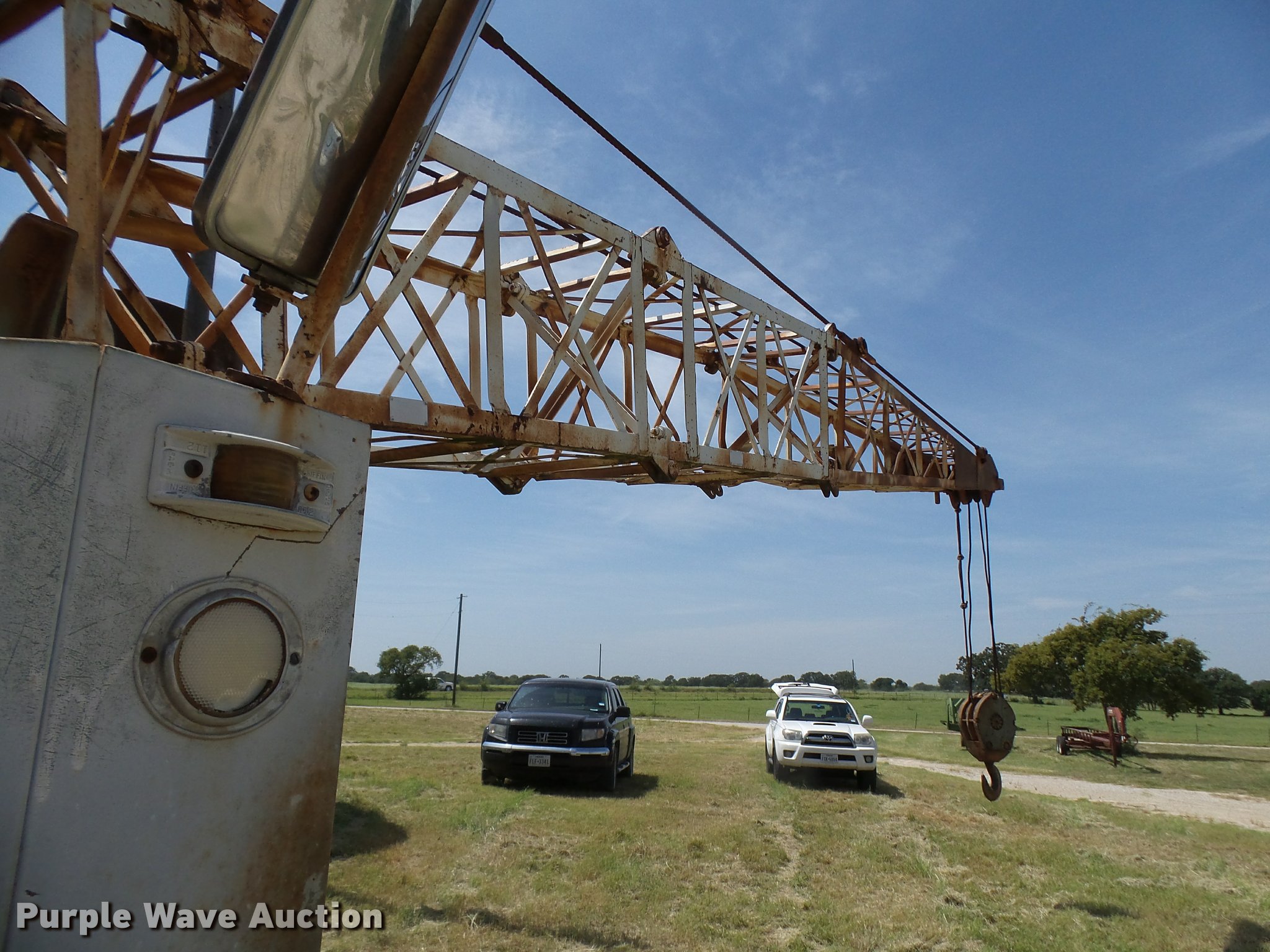 Purple Wave is selling a used Truck Crane in Texas. This item is a Little Giant truck crane with the following: International DV550BLGLQ2 eight cylinder lower diesel engine, Serial 19426, Manual transmission, John Deere six cylinder upper diesel engine, Stick crane controls, Lattice boom, (4) stabilizers, 50' boom length, Three sections, 25 ton max lift capacity, In-cab boom controls, Crane ball and hook, Hydraulic brakes, Triple axle, 11.00x20 tires, Needs battery, Crane does not raise