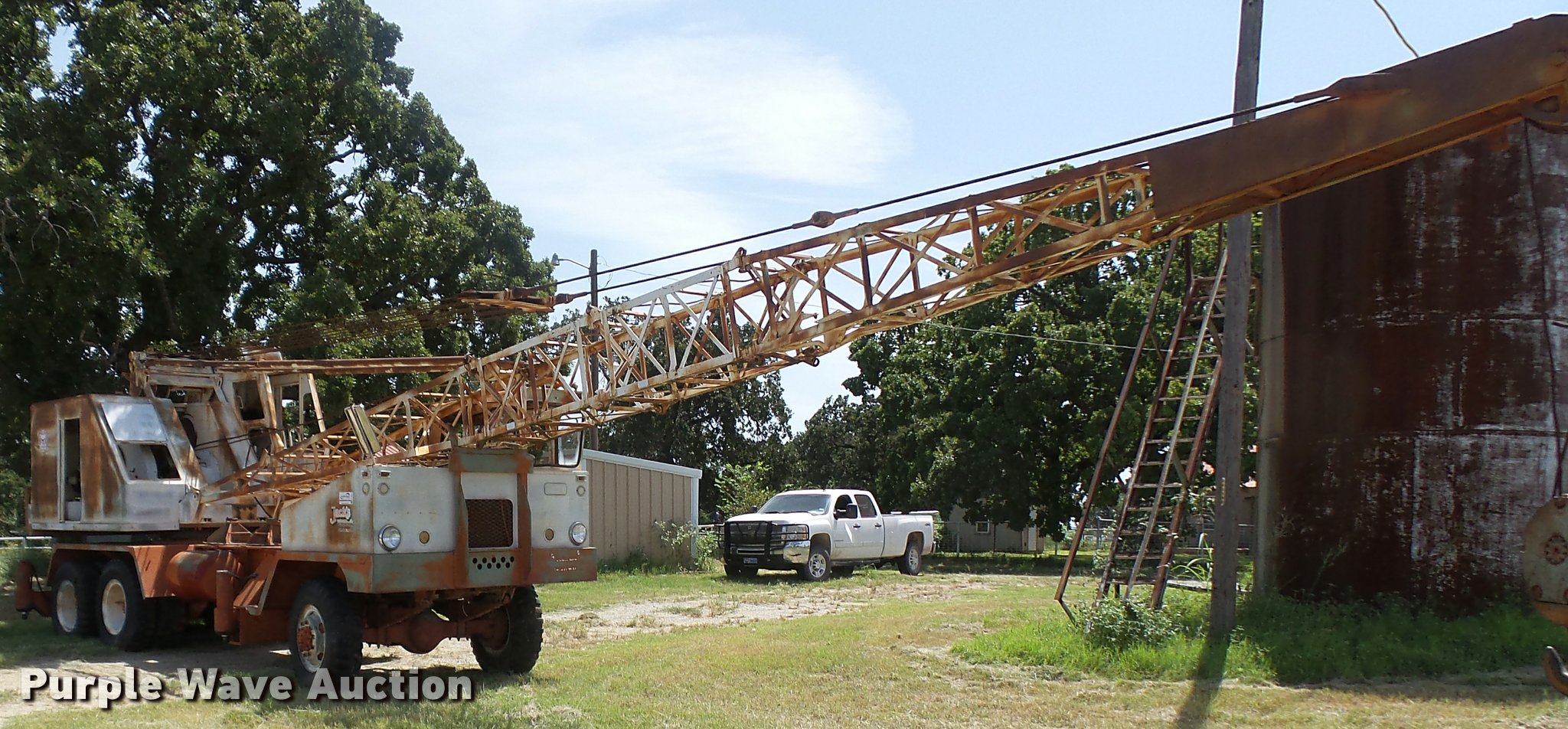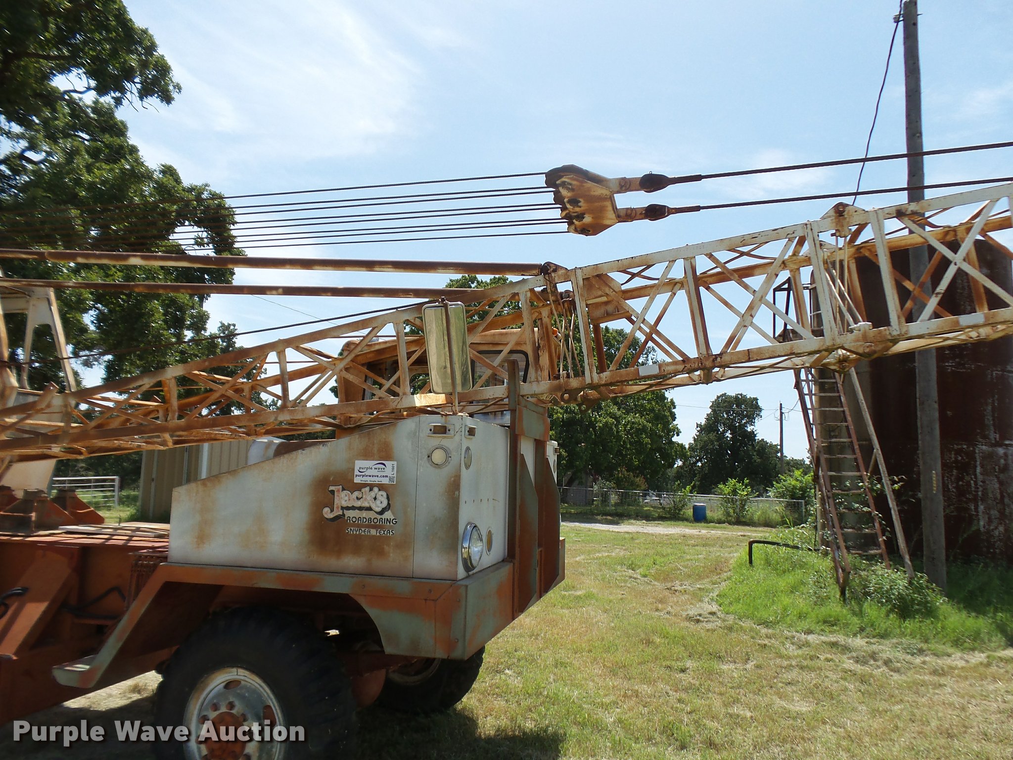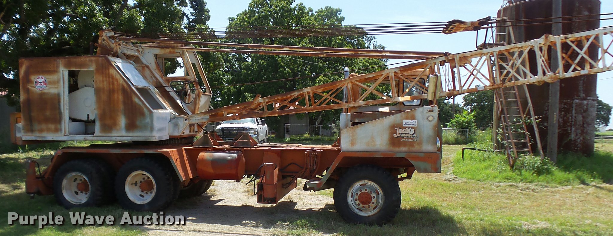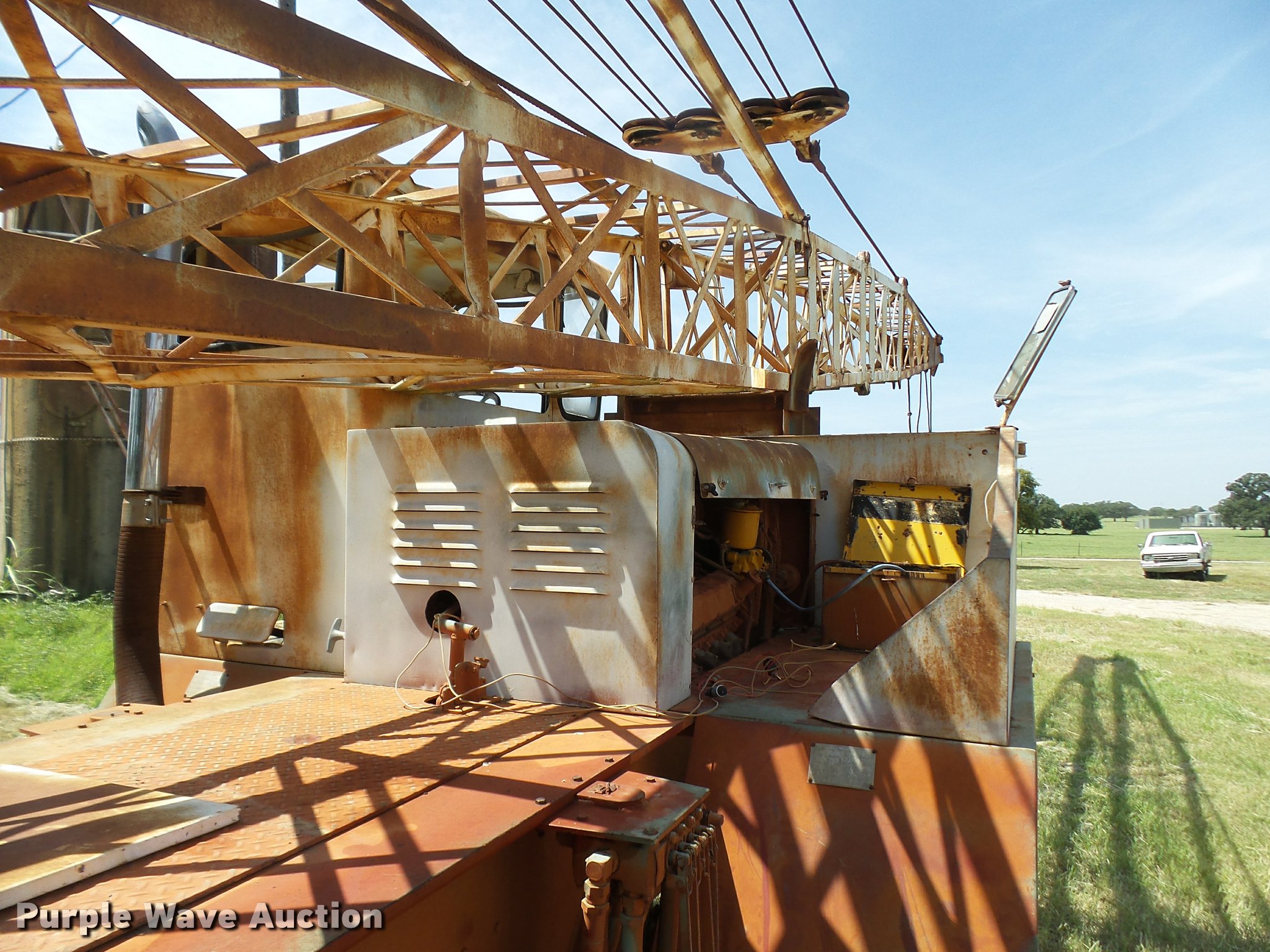 Purple Wave is selling a used Truck Crane in Texas. This item is a Little Giant truck crane with the following: International DV550BLGLQ2 eight cylinder lower diesel engine, Serial 19426, Manual transmission, John Deere six cylinder upper diesel engine, Stick crane controls, Lattice boom, (4) stabilizers, 50' boom length, Three sections, 25 ton max lift capacity, In-cab boom controls, Crane ball and hook, Hydraulic brakes, Triple axle, 11.00x20 tires, Needs battery, Crane does not raise