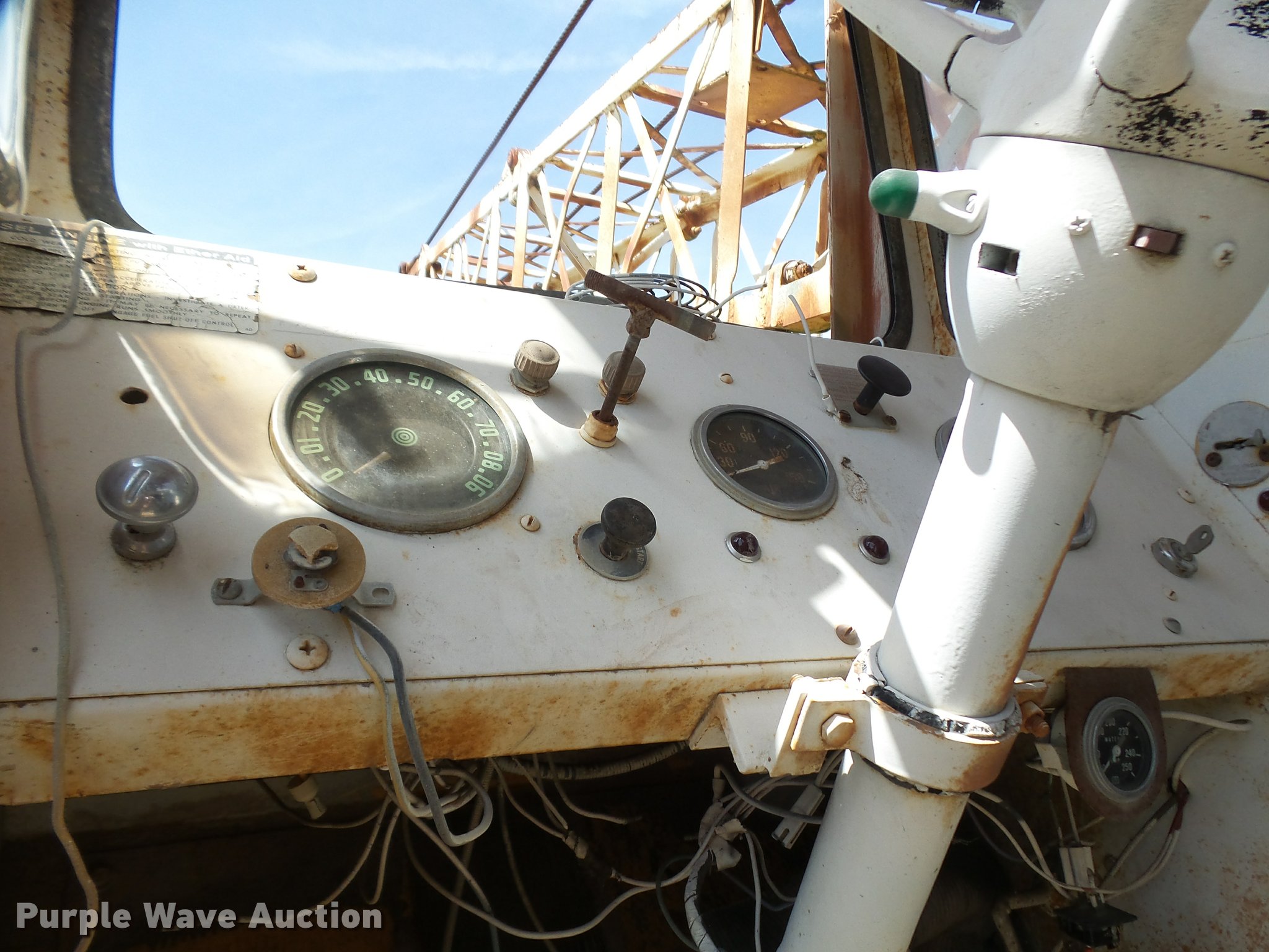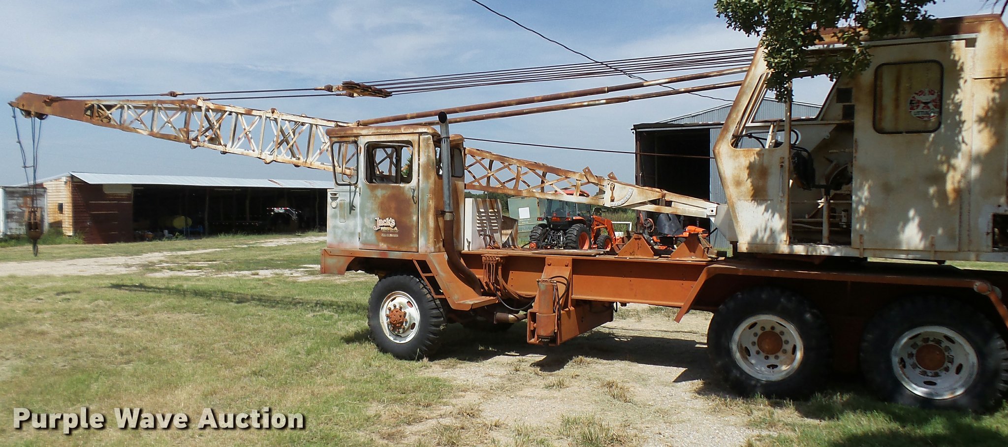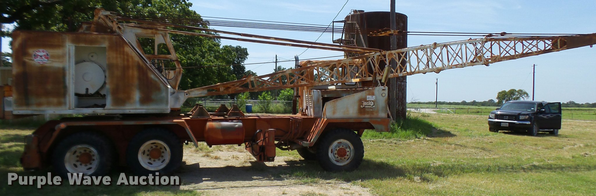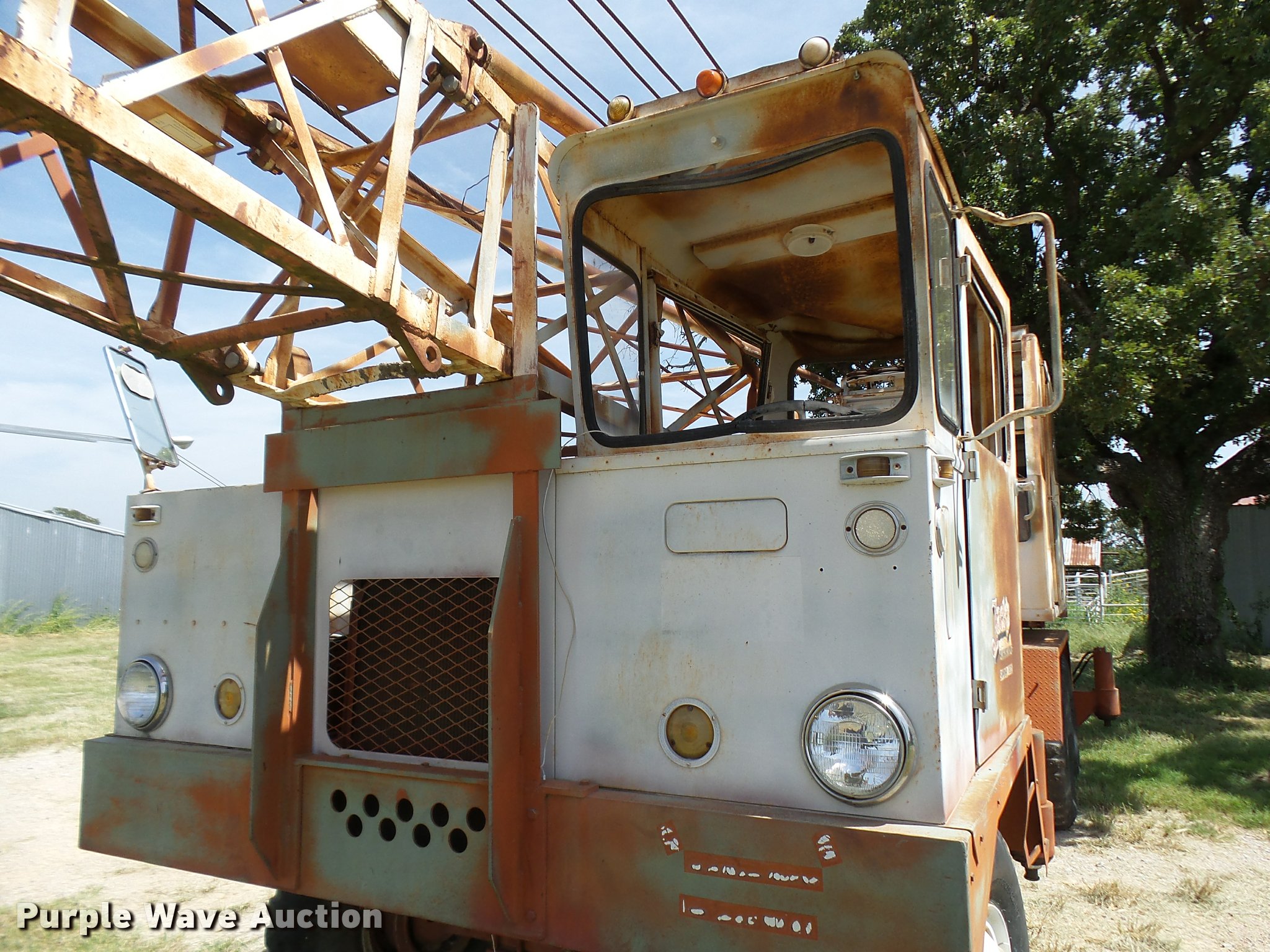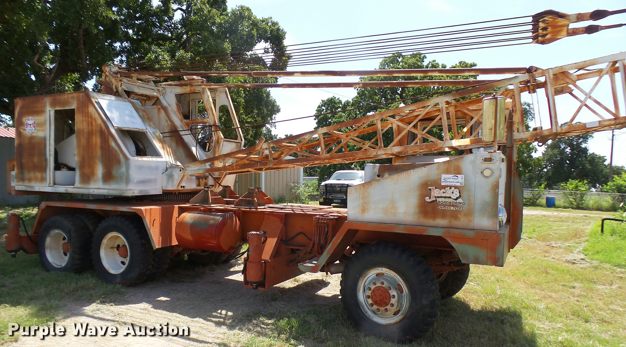 Purple Wave is selling a used Truck Crane in Texas. This item is a Little Giant truck crane with the following: International DV550BLGLQ2 eight cylinder lower diesel engine, Serial 19426, Manual transmission, John Deere six cylinder upper diesel engine, Stick crane controls, Lattice boom, (4) stabilizers, 50' boom length, Three sections, 25 ton max lift capacity, In-cab boom controls, Crane ball and hook, Hydraulic brakes, Triple axle, 11.00x20 tires, Needs battery, Crane does not raise
