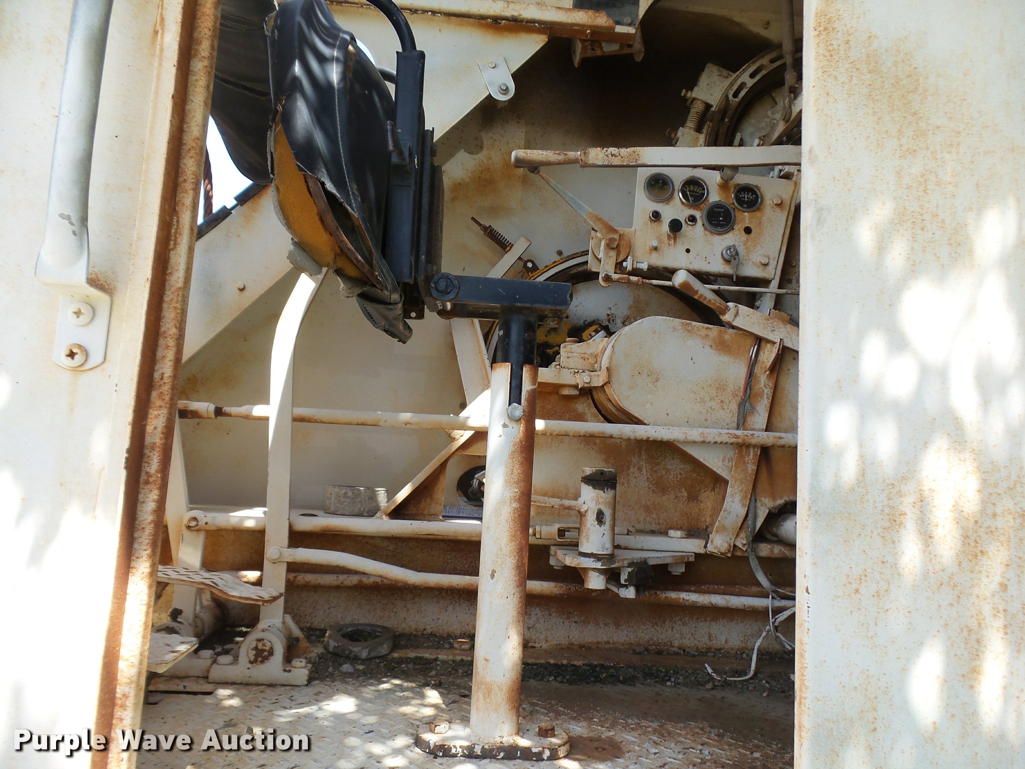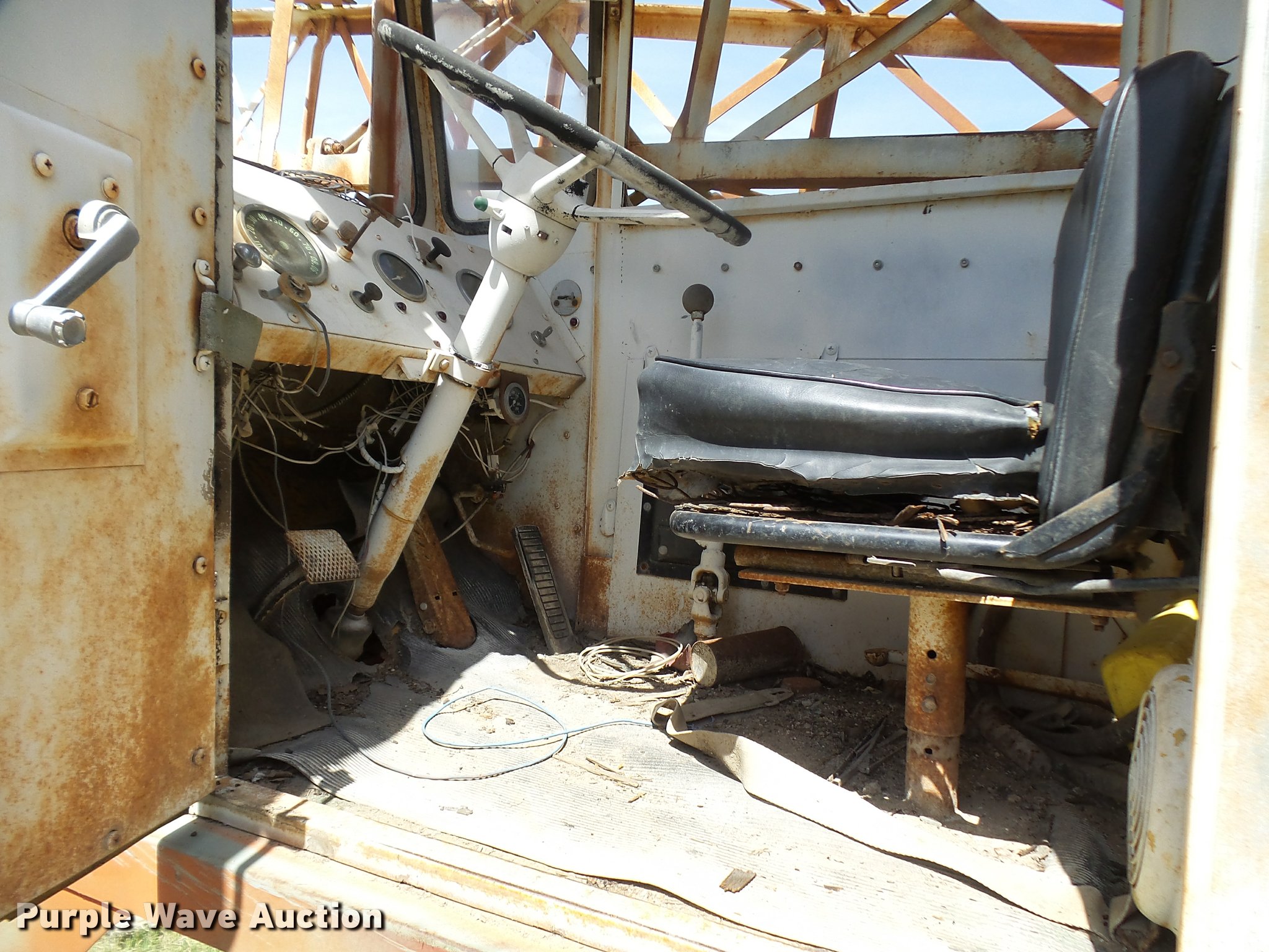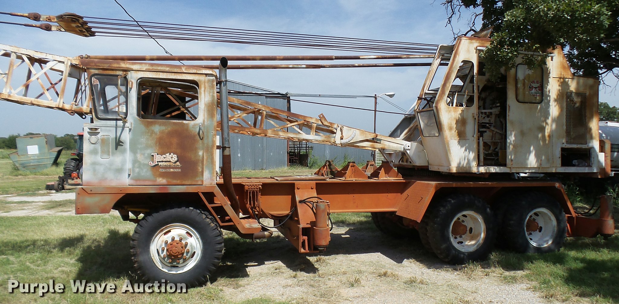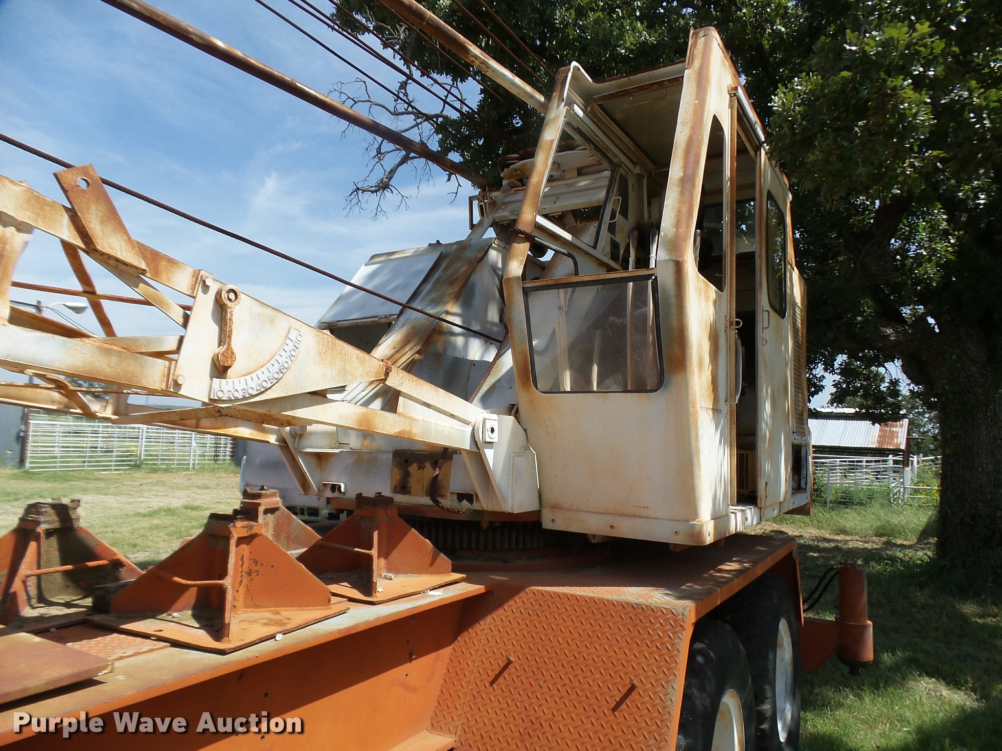 Purple Wave is selling a used Truck Crane in Texas. This item is a Little Giant truck crane with the following: International DV550BLGLQ2 eight cylinder lower diesel engine, Serial 19426, Manual transmission, John Deere six cylinder upper diesel engine, Stick crane controls, Lattice boom, (4) stabilizers, 50' boom length, Three sections, 25 ton max lift capacity, In-cab boom controls, Crane ball and hook, Hydraulic brakes, Triple axle, 11.00x20 tires, Needs battery, Crane does not raise