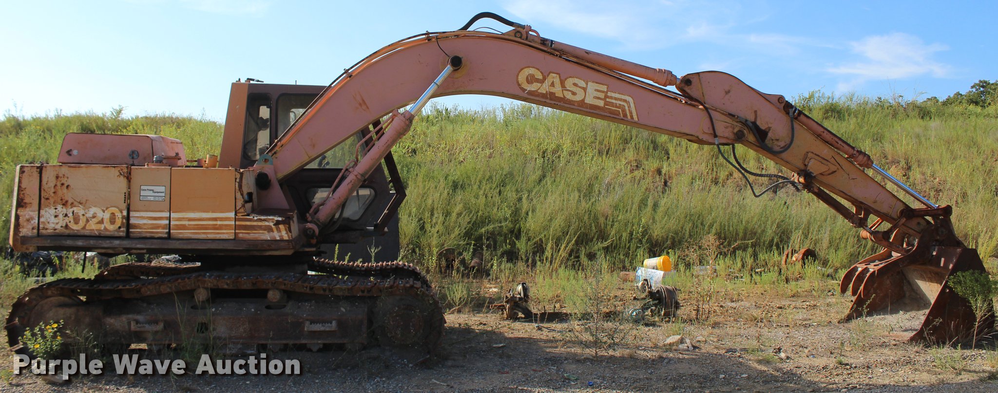 Purple Wave is selling a used Hydraulic Excavator in Oklahoma. This item is a Case 9020 excavator with the following: 7,102 hours on meter, Case 4TA390 four cylinder turbo diesel engine, Hydrostatic transmission, EROPS, AM/FM, Suspension seat, Standard boom, 58"W bucket, Weld-on cutting edge, Hydraulic thumb, Two way auxiliary hydraulics, 23.5"W steel triple grouser track pads, Hydraulic plumbing removed, but included, Front window missing, Unknown operating condition, Serial 270CK-0078