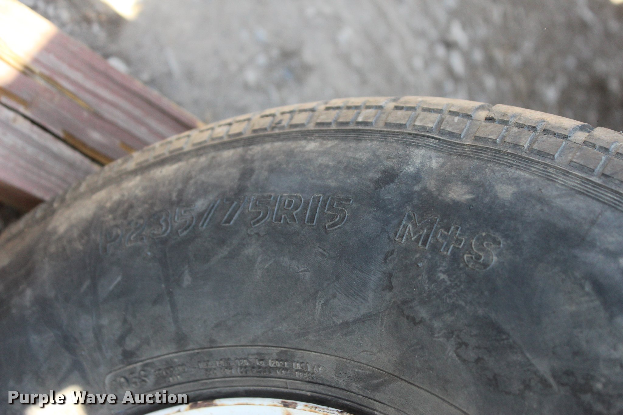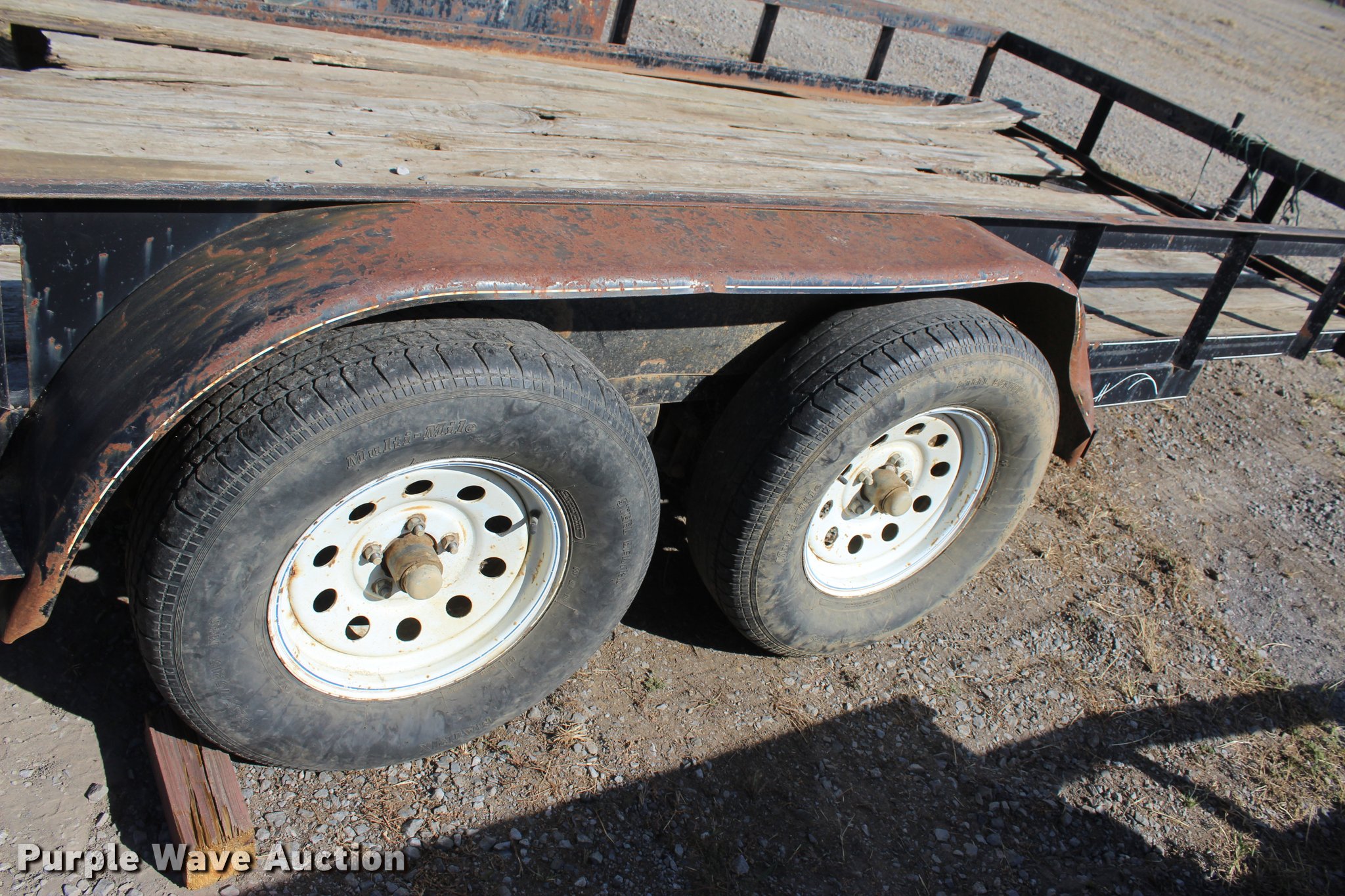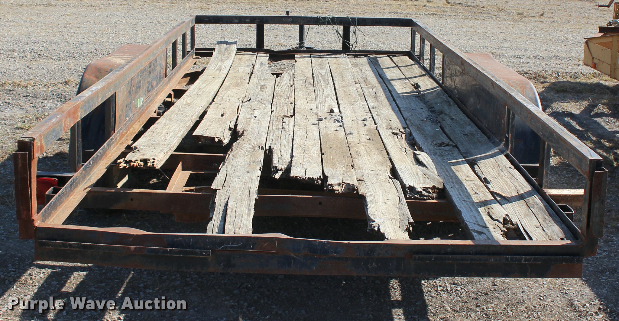 Purple Wave is selling a used Equip. Trailer in Oklahoma. This item is a Shop built equipment trailer with the following: 19'9" overall length, 16'L x 80"W deck, Wood deck, Stake side pockets, Single leg landing gear, Tandem axle, Spring suspension, P235/75R15 tires, Deck damaged