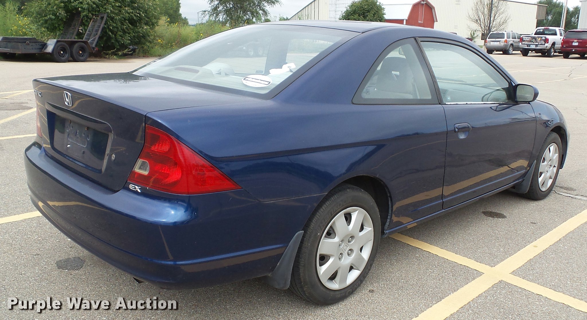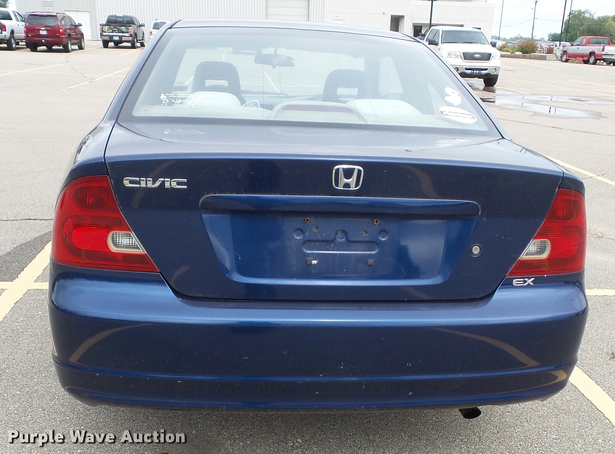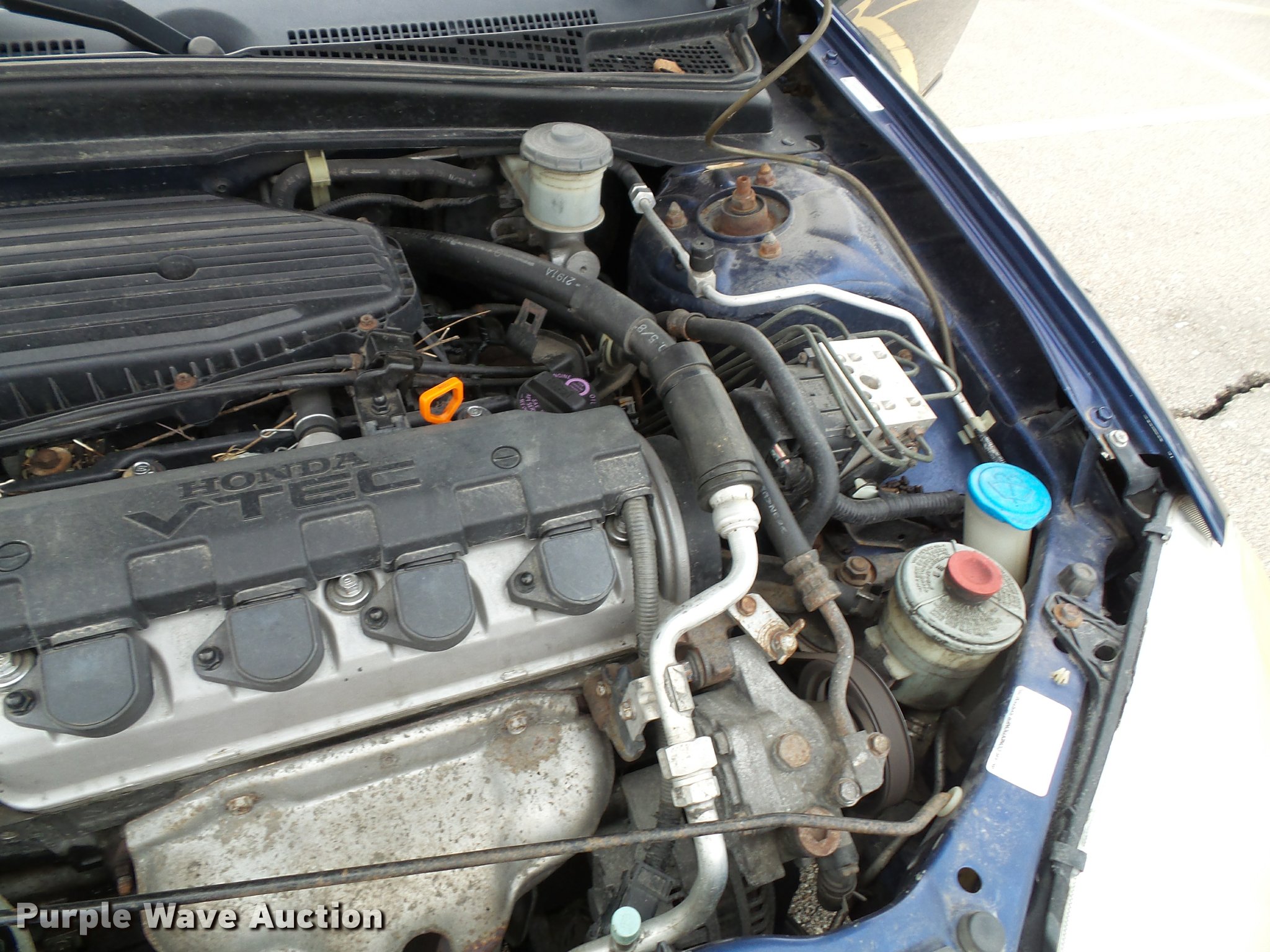 Purple Wave is selling a used Passenger Vehicle in Kansas. This item is a 2002 Honda Civic EX with the following: 158,348 miles on odometer, 1.7L L4 SOHC 16V gas engine, Automatic transmission, AC and heat, Tilt, Cruise, AM/FM/CD, Power windows, locks, and mirrors, Cloth interior, Power sunroof, 195/60R15 tires, Check engine light on, SRS light on, Cracked windshield, Hail damage, Hood latch broken, Hood will not latch completely, Rodent nest in trunk