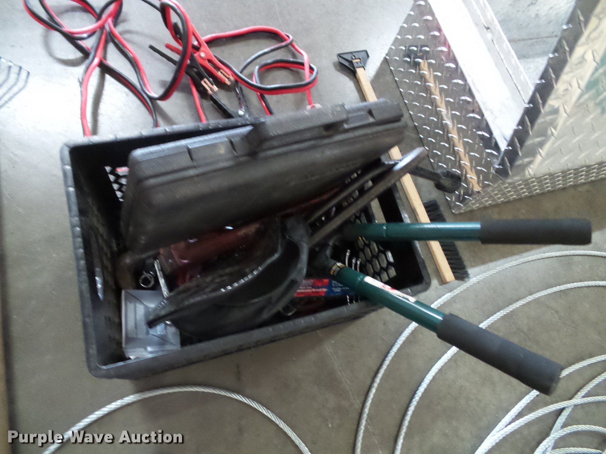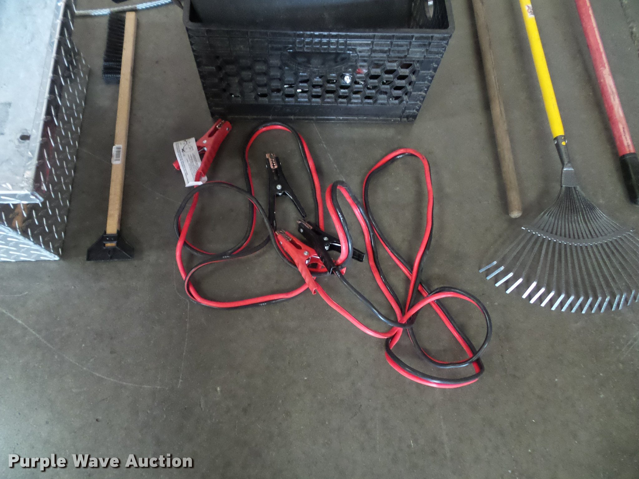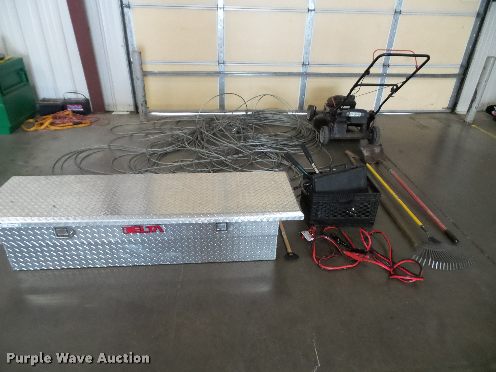 Purple Wave is selling a used Tools in Kansas. This item is a Tools and equipment with the following: Delta toolbox, 5' x 19", Steel cable for winch, Unknown length, Unused, Jumper cables, Rake, Shovel, Hoe, Craftsman 20" push mower