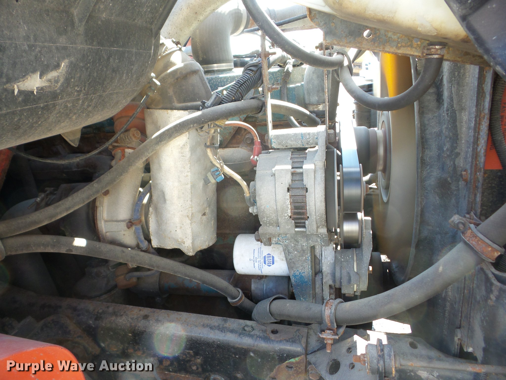Purple Wave is selling a used Construction Dump Truck in Kansas. This item is a 1999 International 4900 dump truck with the following: 175,272 miles on odometer, 8,828 hours on meter, International DT530 8.7L L6 turbo diesel engine, Allison automatic transmission, Tandem axle, Inter-axle differential lock, AC and heat, Cruise, AM/FM/weatherband, Heated mirrors, Air suspension seat, PTO, Steel dump bed, 13'L x 8'W, 30" side height, 8" side board height, Single ram hoist, Air operated end gate, Roll tarp, Monroe snow plow, 11'W, Monroe spreader, Single fuel tank, Spring over walking beam suspension, Air brakes, 295/75R22.5 tires, Windshield broken, Radiator reserve tank leaks, Bed lift cylinder leaks, Bed will not raise, Rear truck frame cracking, Panel gauges work intermittently, Oil pan leaks, Air tank leaks out overnight, KDOT ID 264-4128