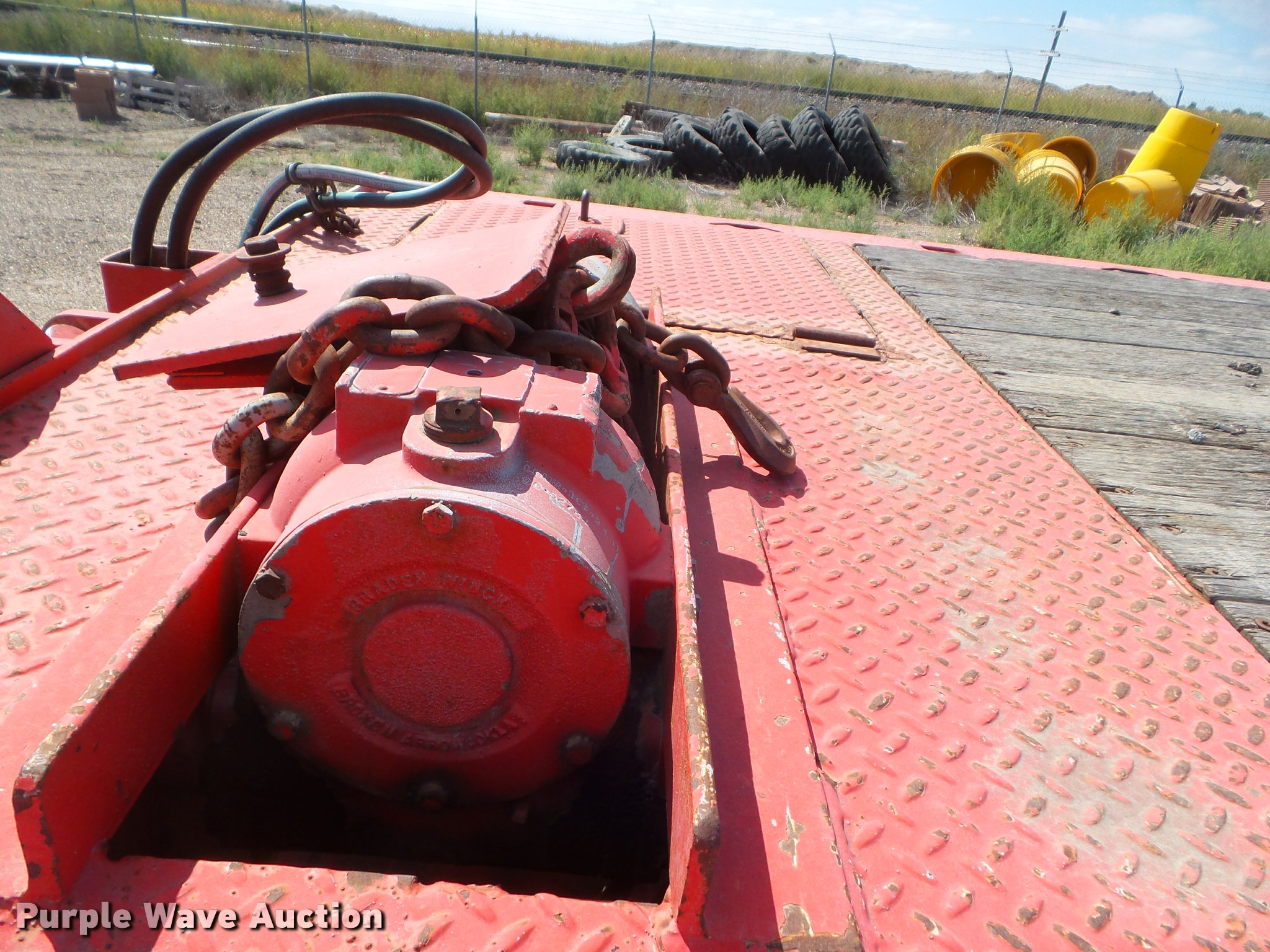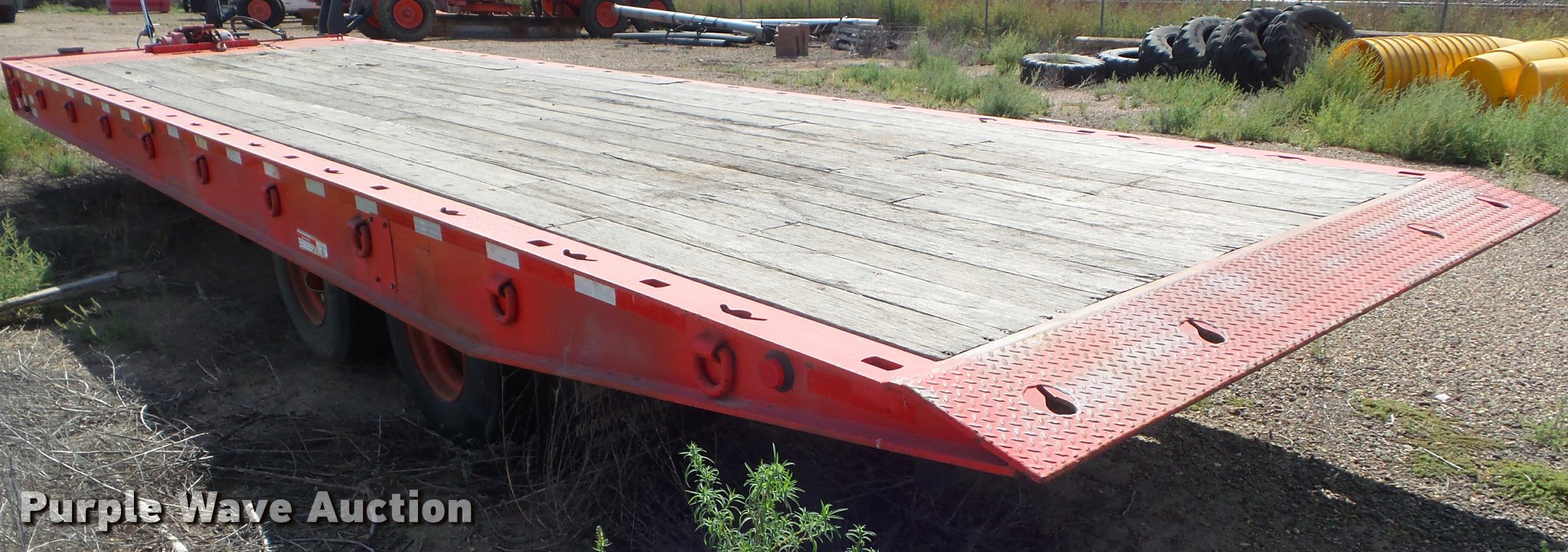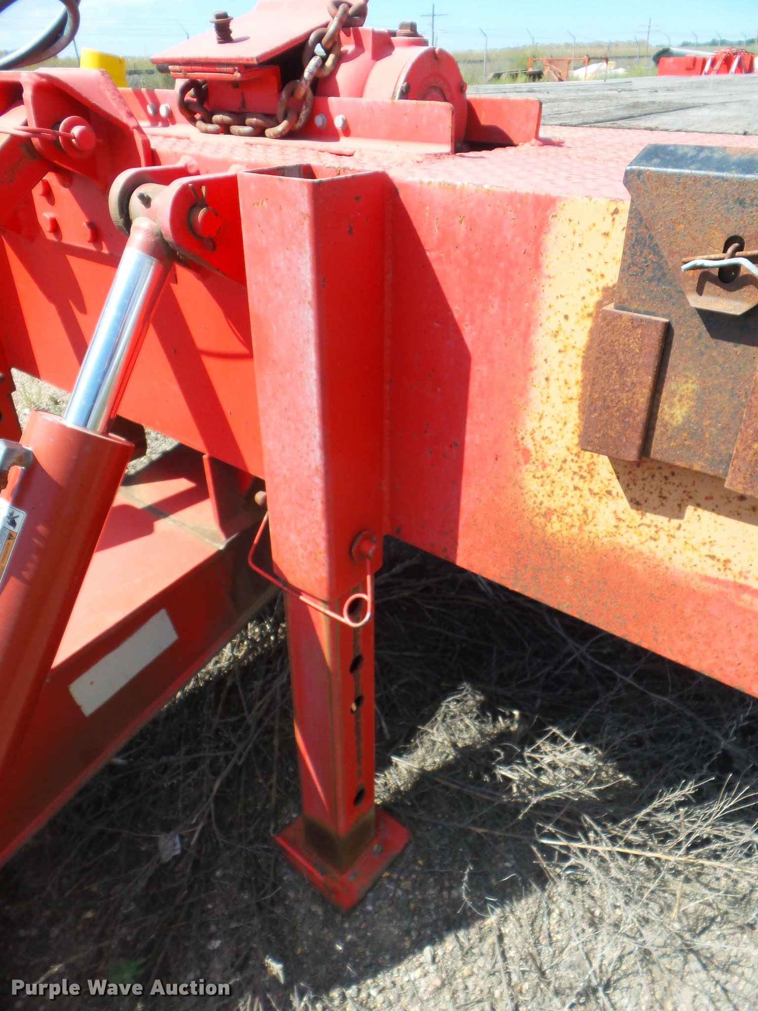 Purple Wave is selling a used Equip. Trailer in Kansas. This item is a 1991 Landoll 345-31 tilt deck equipment trailer with the following: 31'L x 102"W, 38" floor height, Wood deck, D-ring tie downs, Stake side pockets, Braden winch, Manual hydraulic control, Dual leg landing gear, Pintle hitch, Tandem axle, Spring suspension, Air brakes, Steel wheels, 10R17.5 tires, GVWR 50,000 lbs, GAWR 17,640 lbs per axle, Rust, KDOT ID 777-5040