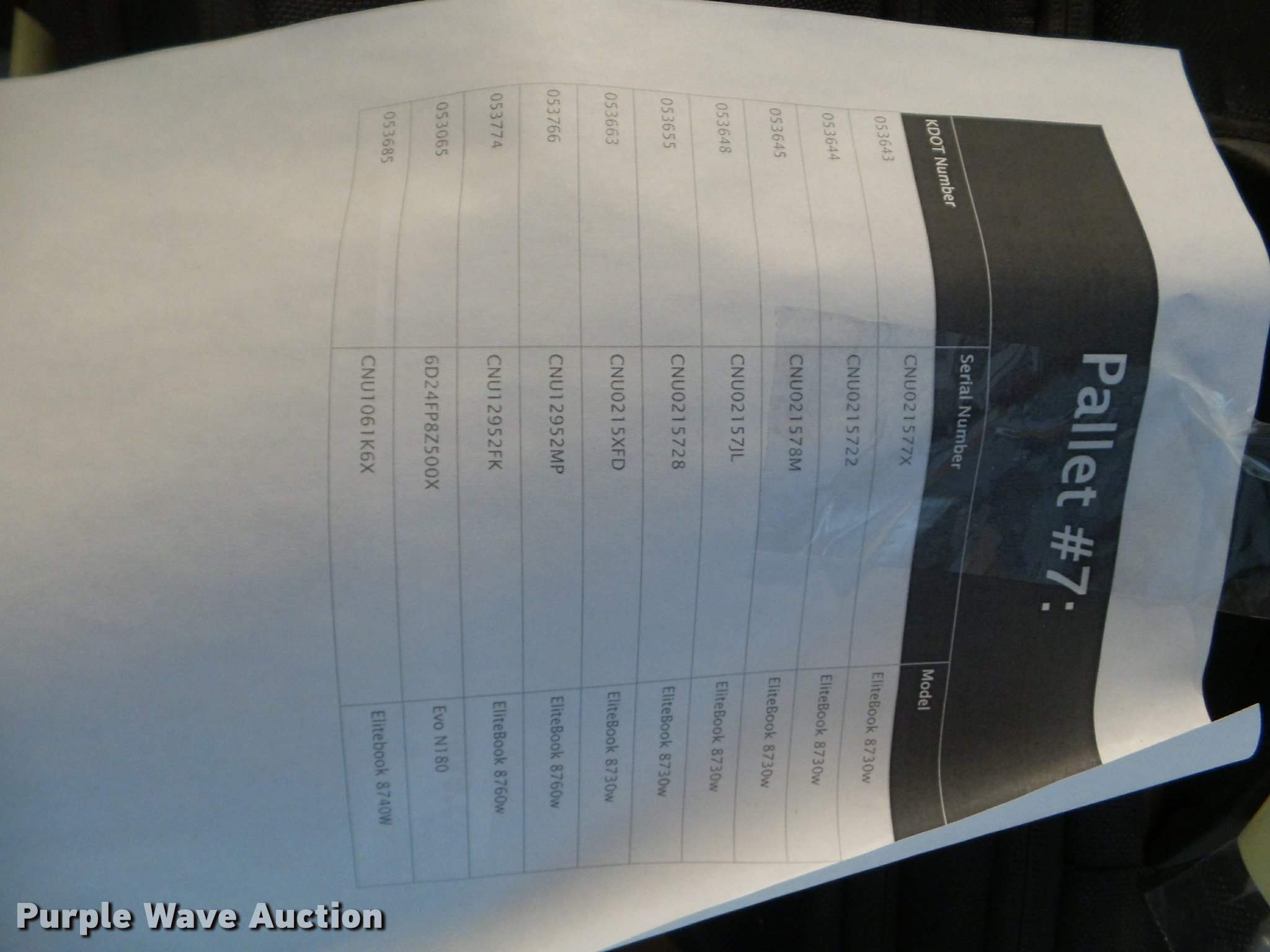 Purple Wave is selling a used Computers in Kansas. This item is a Computers with the following: 2002 Compaq Evo N180 laptop, Pentium II processor, 20 GB HDD, 256 MB RAM, Hard drives have been reformatted and no operating system installed, 2010 HP Elitebook 8730W laptop, Intel Core 2 Duo T9400 processor, 2.53 GHz, 4 GB RAM, 160 GB HDD, Serial CNU021577X, Hard drives have been reformatted and no operating system installed, 2010 HP Elitebook 8730W laptop, Intel Core 2 Duo T9400 processor, 2.53 GHz, 4 GB RAM, 160 GB HDD, Serial CNU0215722, Battery will not hold charge, Hard drives have been reformatted and no operating system installed, 2010 HP Elitebook 8730W laptop, Intel Core 2 Duo T9400 processor, 2.53 GHz, 4 GB RAM, 160 GB HDD, Serial CNU21578M, Batttery will not hold charge, Hard drives have been reformatted and no operating system installed, 2010 HP Elitebook 8730W laptop, Intel Core 2 Duo T9400 processor, 2.53 GHz, 4 GB RAM, 160 GB HDD, Serial CNU2157JL, Hard drives have been reformatted and no operating system installed, 2010 HP Elitebook 8730W laptop, Intel Core 2 Duo T9400 processor, 2.53 GHz, 4 GB RAM, 160 GB HDD, Hard drives have been reformatted and no operating system installed, 2010 HP Elitebook 8730W laptop, INtel Core 2 Duo T9400 processor, 2.53 GHz, 4 GB RAM, 160 GB HDD, Hard drives have been reformatted and no operating system installed, 2011 HP Elitebook 8740W, M520 processor, 2.40 GHz, 4 GB RAM, No hard drive, Hard drives have been reformatted and no operating system installed, 2010 HP Elitebook 8760W laptop, Intel Core i5-2540M processor, 2.60 GHz, 4 GB RAM, 320 GB HDD, Hard drives have been reformatted and no operating system installed, 2011 HP Elitebook laptop, Intel Core i5-2540M processor, 2.60 GHz, 4 GB RAM, 320 GB HDD, Hard drives have been reformatted and no operating system installed, KDOT ID 053065, 053643, 053644, 053645, 053648, 053655, 053663, 053685, 053766, 053774
