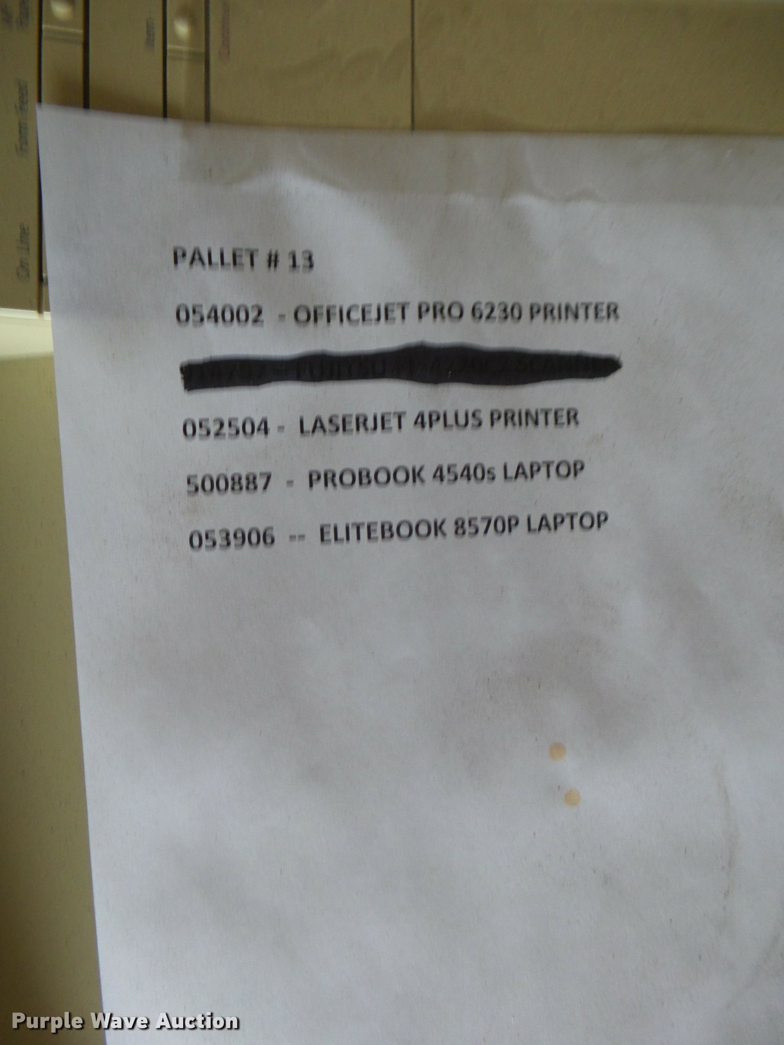Purple Wave is selling a used Electronics in Kansas. This item is a Electronics with the following: 1995 HP Laserjet 4 Plus pringer, Serial USFB186358, HP Elitebook 8570P laptop, Intel Core i7 processor, 2.40 GHz, 4 GB RAM, 320 GB HDD, Hard drives have been reformatted and no operating system installed, HP OfficeJet Pro 6230 printer, Serial TH4BT4B03M, Non-operational unit, KDOT ID 052504, 053906, 054002, 500887