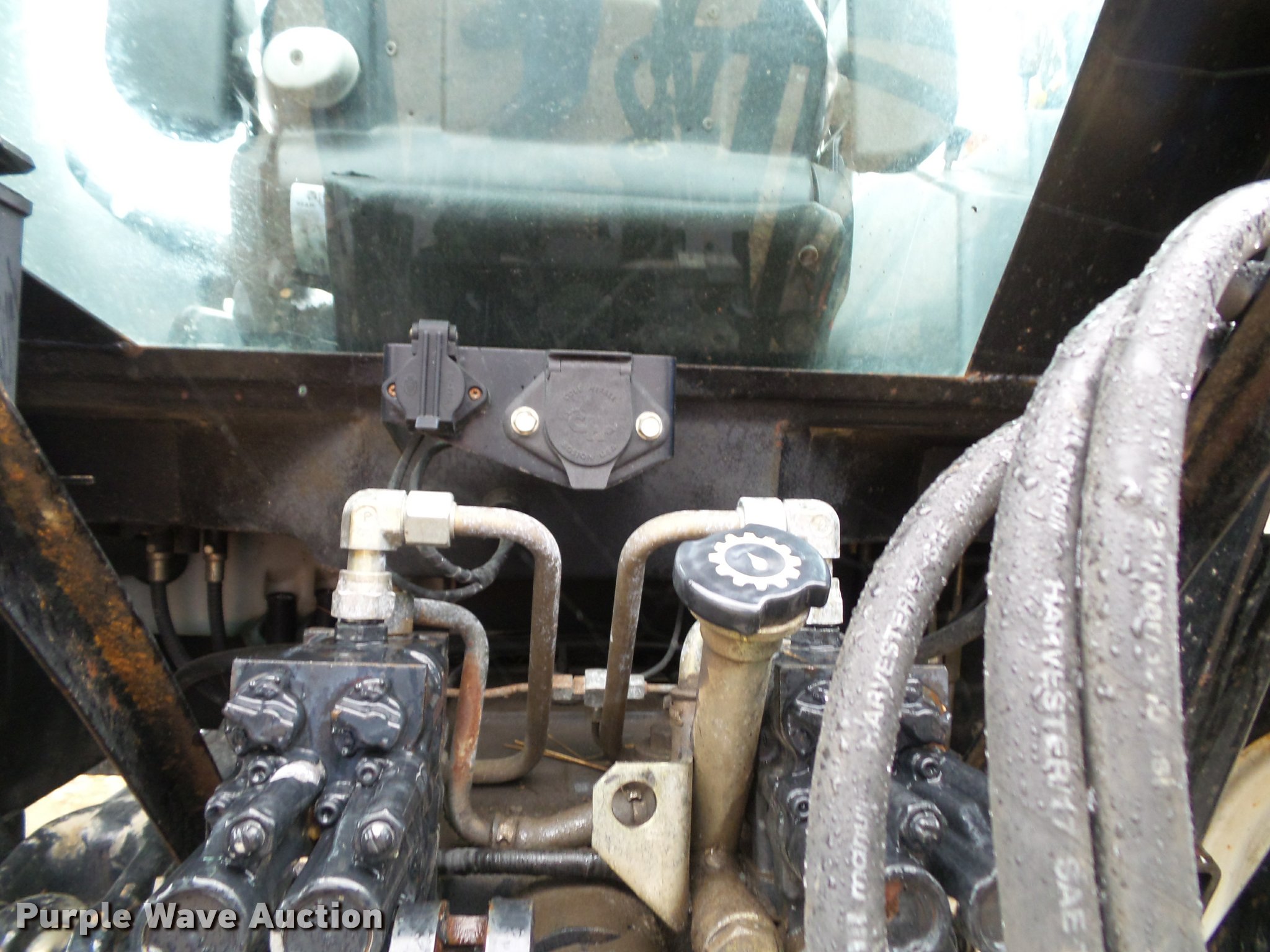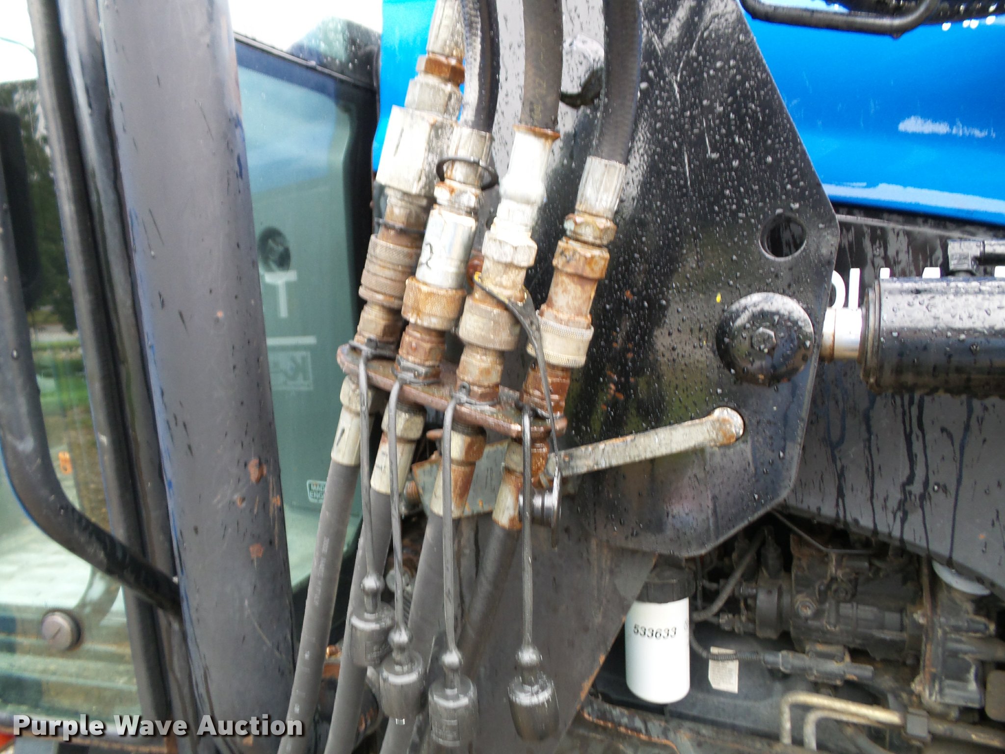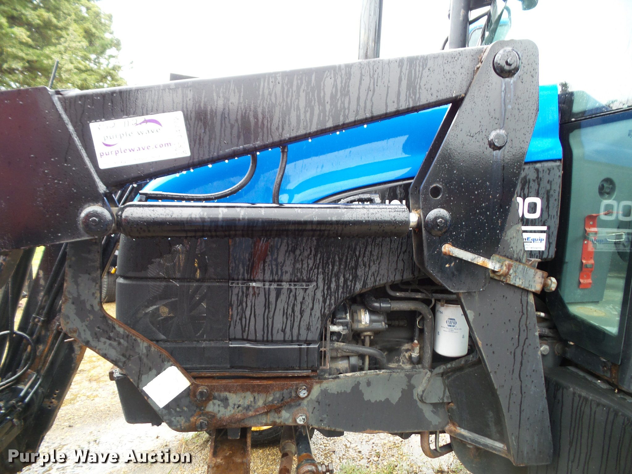 Purple Wave is selling a used Tractor in Kansas. This item is a 2003 New Holland TS100 tractor with the following: 2,280 hours on meter, 5.0L four cylinder turbo diesel engine, Dual Command transmission, 24F-24R gears, AC and heat, AM/FM, Tilt steering wheel, Block heater, Work lights, Wipers, Rear window brush guard, Loader, 6'W bucket, Three point, 1000 PTO, Seven pin outlet, (4) rear hydraulic remote sets, 11L-16 front tires, 18.4-30 rear tires, Throttle cable sticks, Door latch broken, Bucket rusted, Top link missing, Serial 208166B, KDOT ID 352-1123