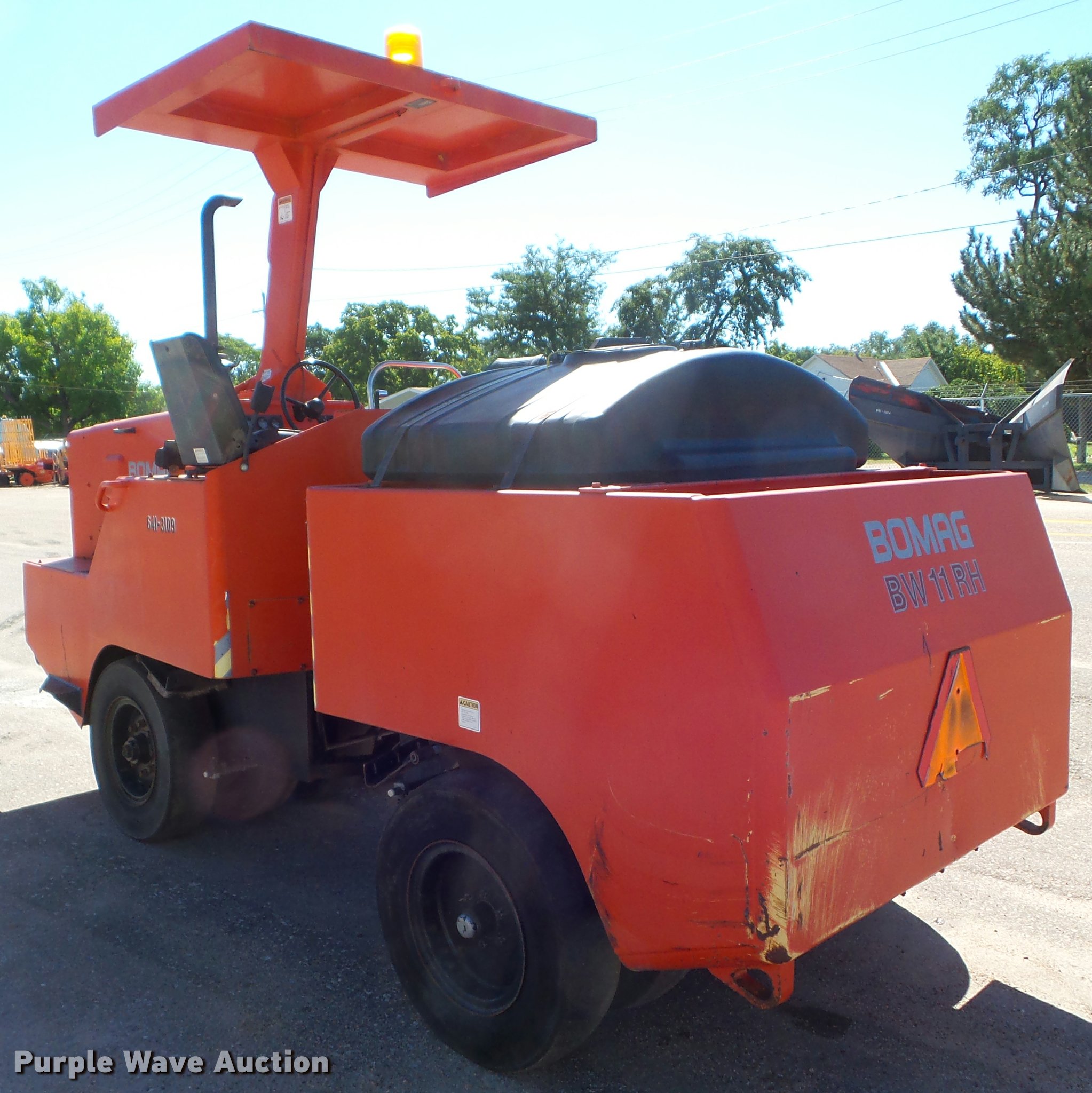 Purple Wave is selling a used Pneumatic Roller in Kansas. This item is a 1999 Bomag BW11RH pneumatic roller with the following: 555 hours on meter, Cummins 3.9L four cylinder diesel engine, Hydrostatic transmission, Front and rear water application, 7.50 x 15 NHS tires, 11,964 kg Operating weight, Brushes missing, Serial 109A222017333, KDOT ID 641-3109