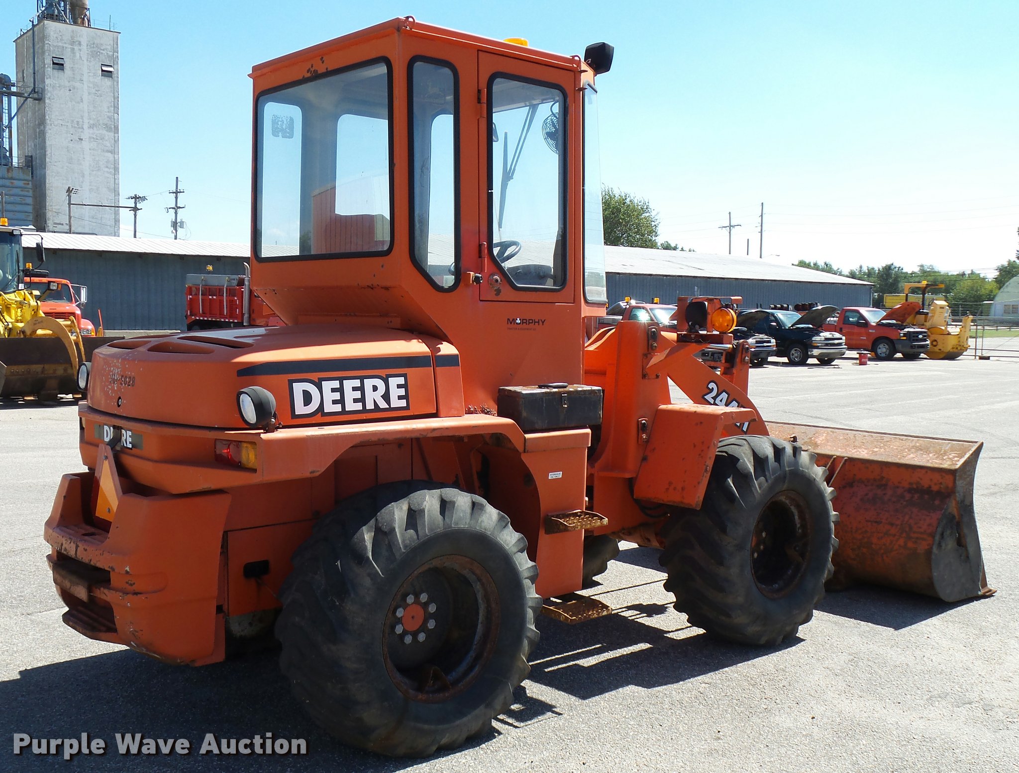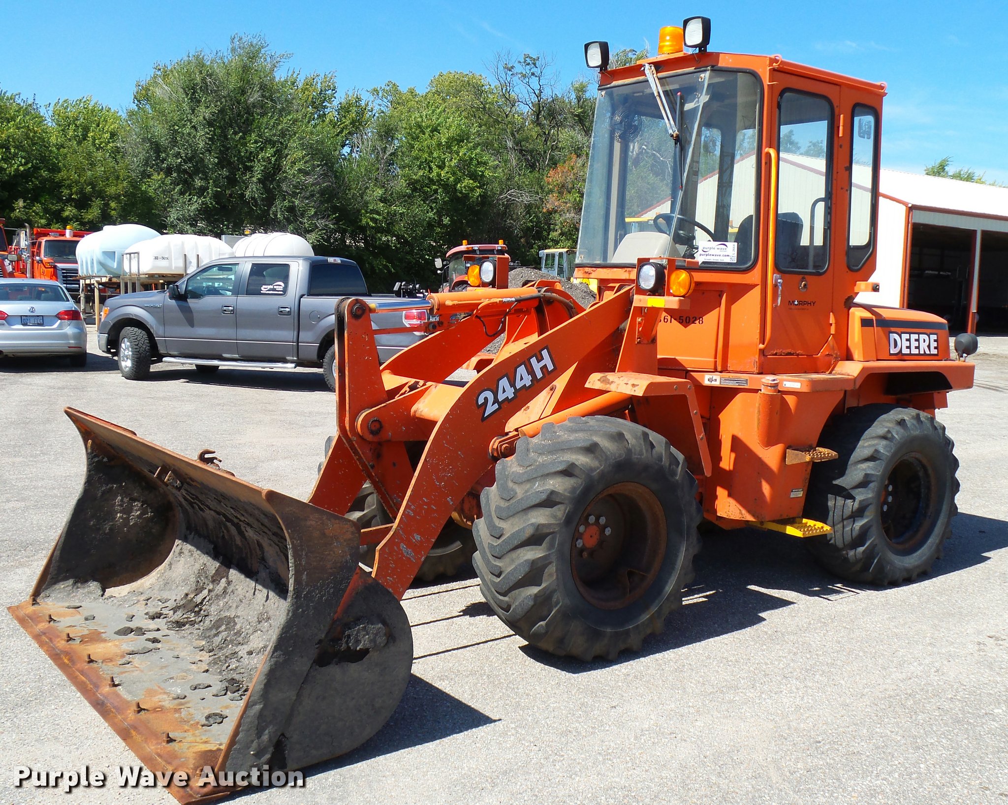 Purple Wave is selling a used Wheel Loader in Kansas. This item is a 1998 John Deere 244H wheel loader with the following: 2,626 hours on meter, Yanmar 4TNE98 four cylinder diesel engine, 55 HP, Two speed hydrostatic transmission, EROPS, Heat, Suspension seat, Joystick bucket controls, Wipers, Front work lights, JRB 91"W general purpose bucket, 1.5 cu. yd. capacity, Bolt-on cutting edge, Counterweights, 17.5/65 tires, 11,400 lbs. base operating weight, Rust, Battery dead, Tires worn, Serial T6244HX000153, KDOT ID 361-5028