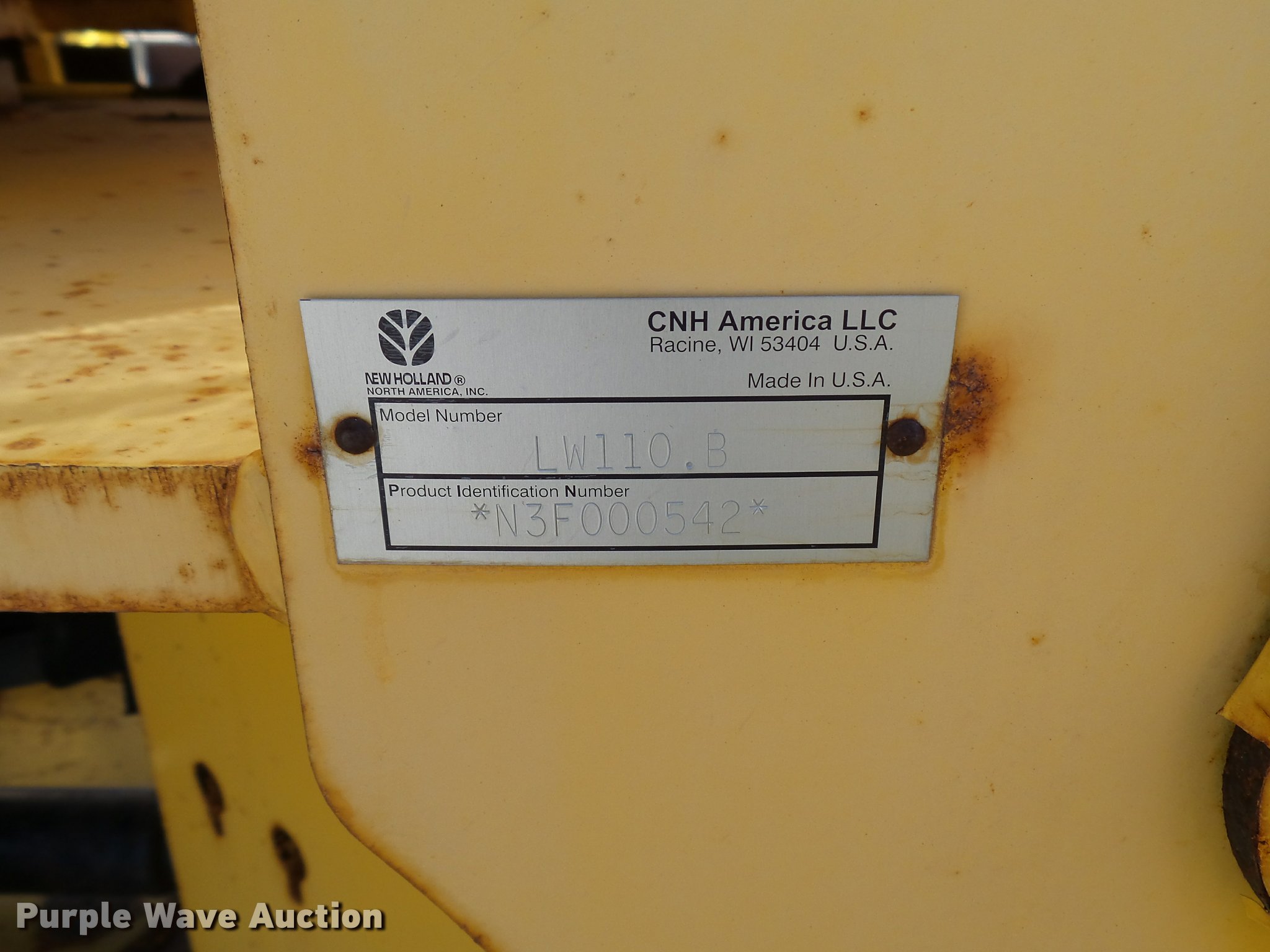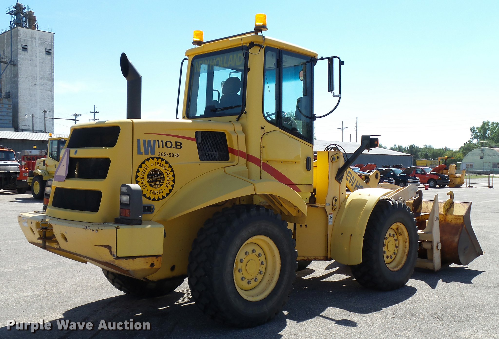 Purple Wave is selling a used Wheel Loader in Kansas. This item is a 2004 New Holland LW110B wheel loader with the following: 923 hours on meter, Hour meter replaced at 1,650 hours, 2,573 total hours, New Holland 445T/M2 four cylnder diesel engine, 119 HP, Powershift transmission, 4F-3R gears, EROPS, AC and heat, AM/FM/cassette, Tilt steering wheel, Suspension seat, Joystick bucket controls, Wipers, Front and rear work lights, Backup alarm, Block heater, JRB LW110B 8'W general purpose bucket, Two cu. yd. capacity, Bolt-on cutting edge, JRB pallet forks, 48"L x 6"W, Hydraulic finger, Hydraulic quick coupler, Front auxiliary hydraulics, 17.5R25 tires, Rust, Battery dead, Tires worn, Serial N3F000542, KDOT ID 365-5035