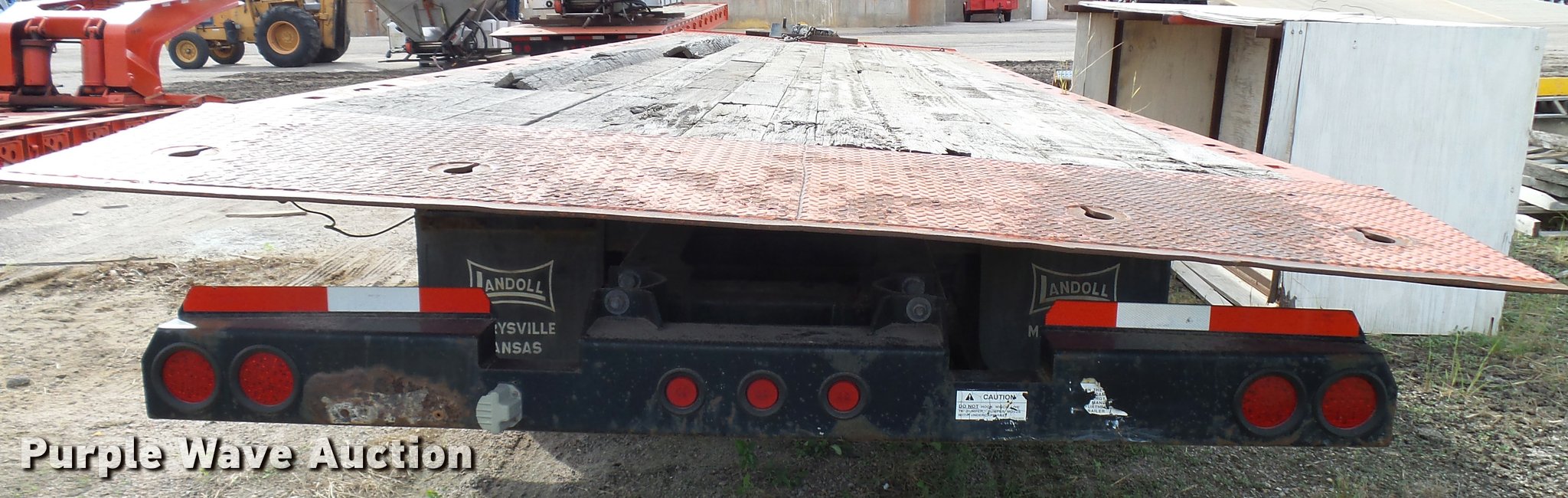 Purple Wave is selling a used Equip. Trailer in Kansas. This item is a 1998 Landoll tilt deck equipment trailer with the following: 31'L x 102"W, Wood deck, D-ring tie downs, Braden winch, Pintle hitch, Tandem sliding axle, Spring suspension, Air brakes, 10R17.5 tires, Stringers rusted, KDOT ID 777-5038