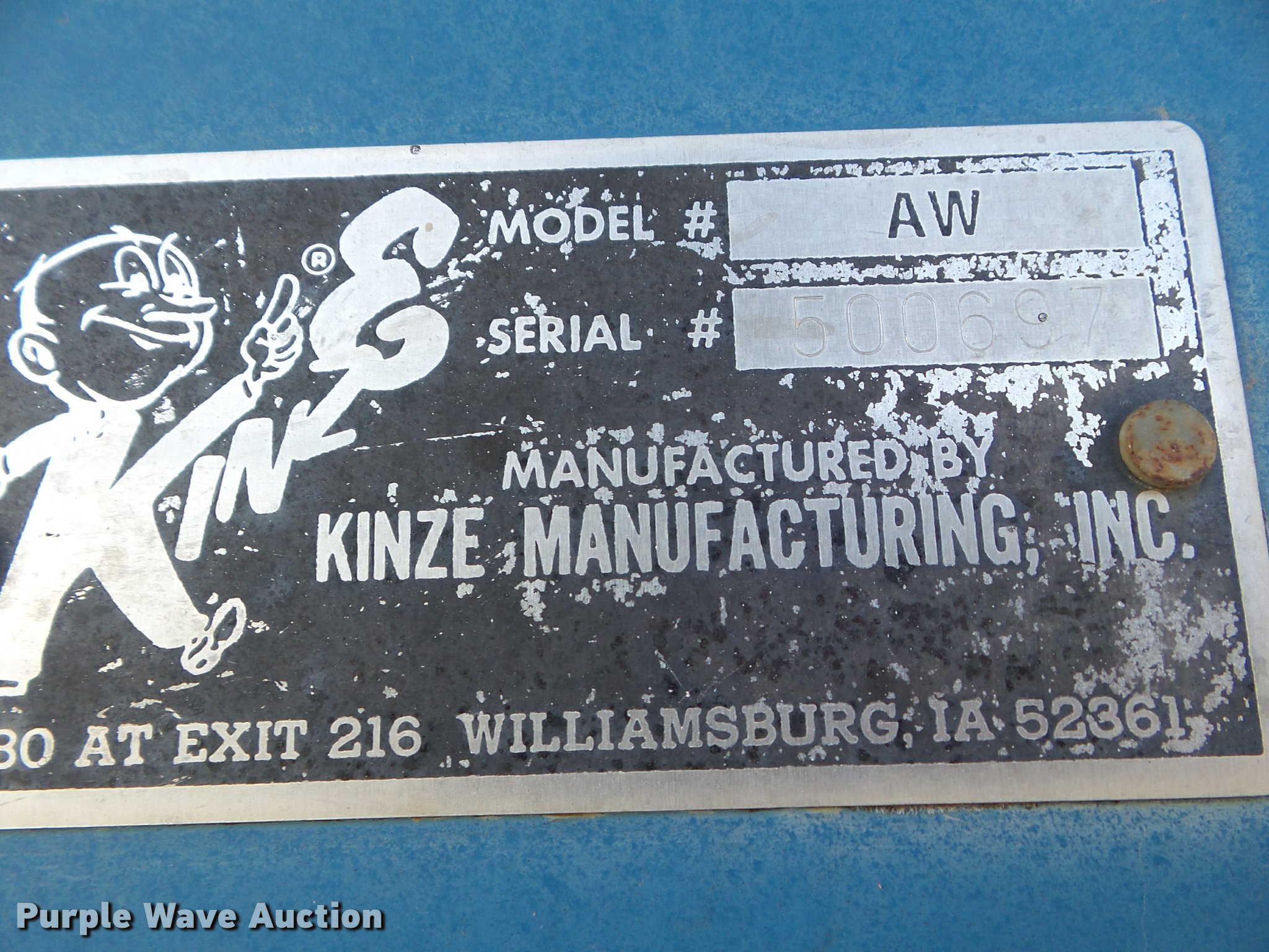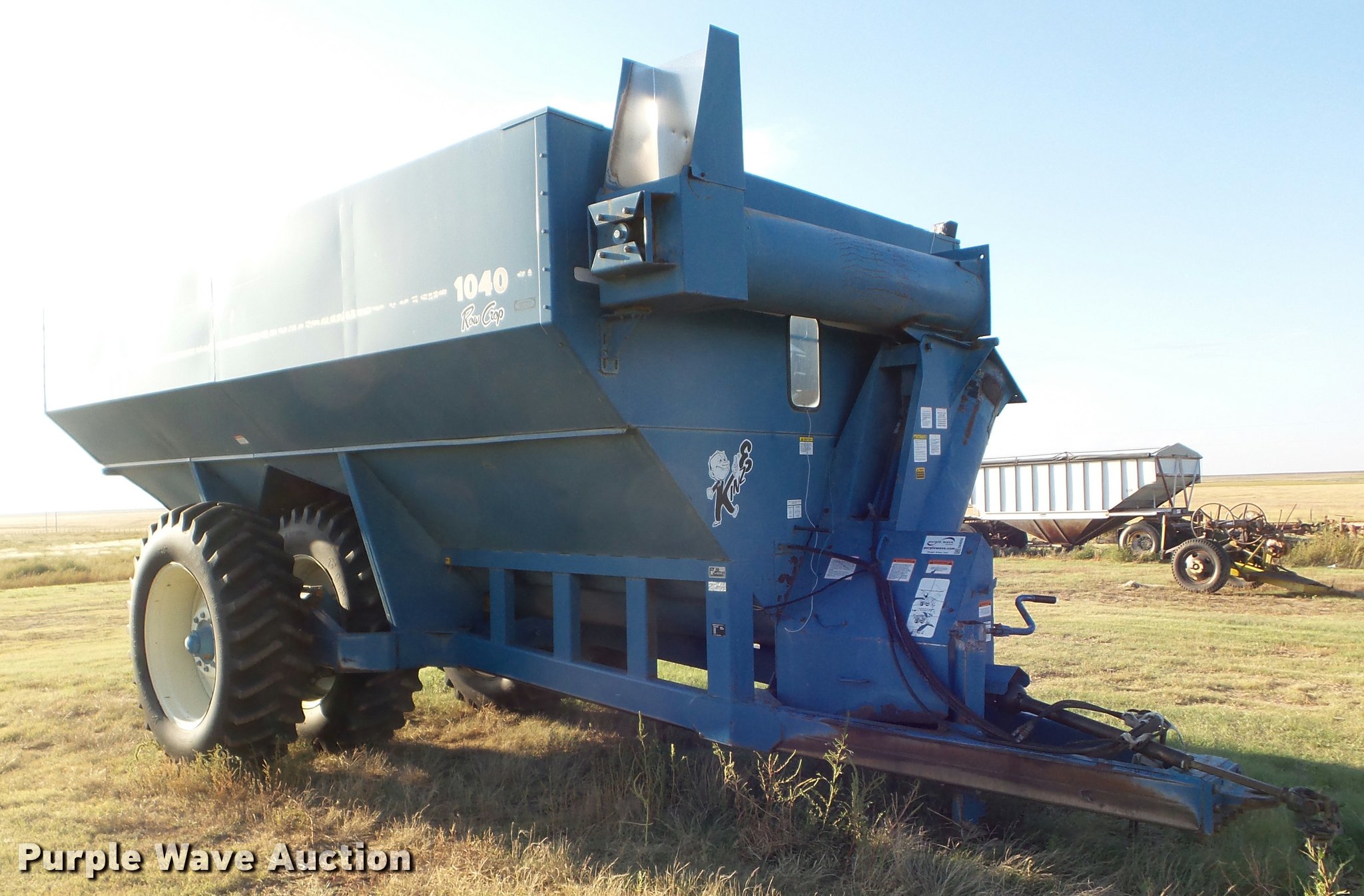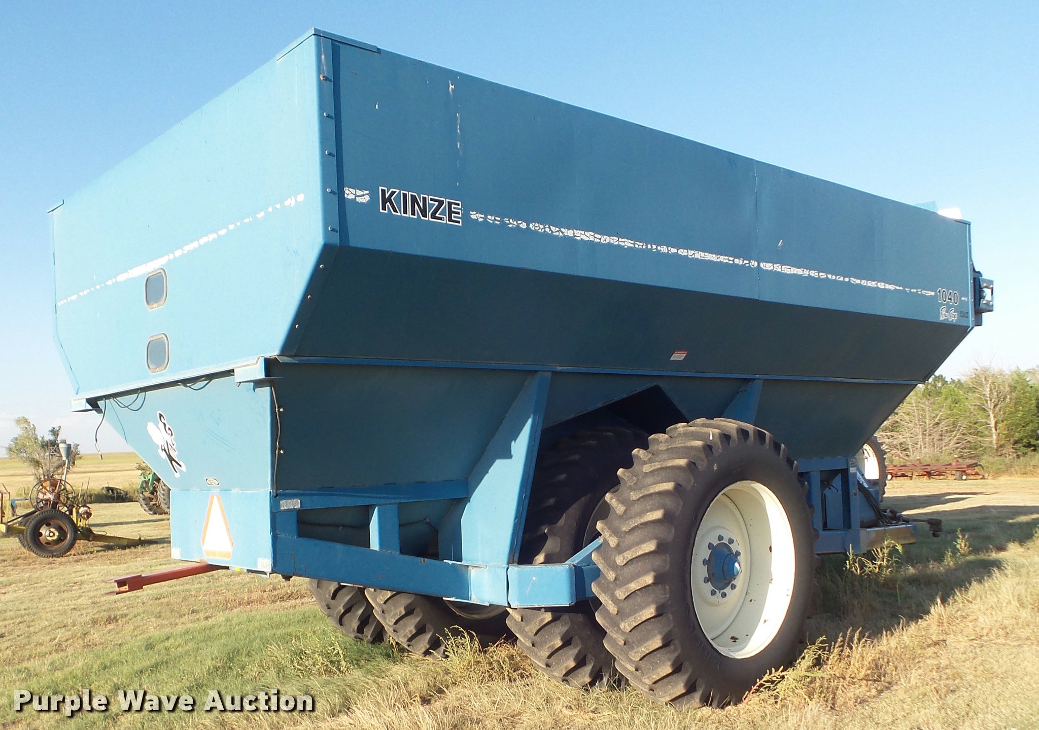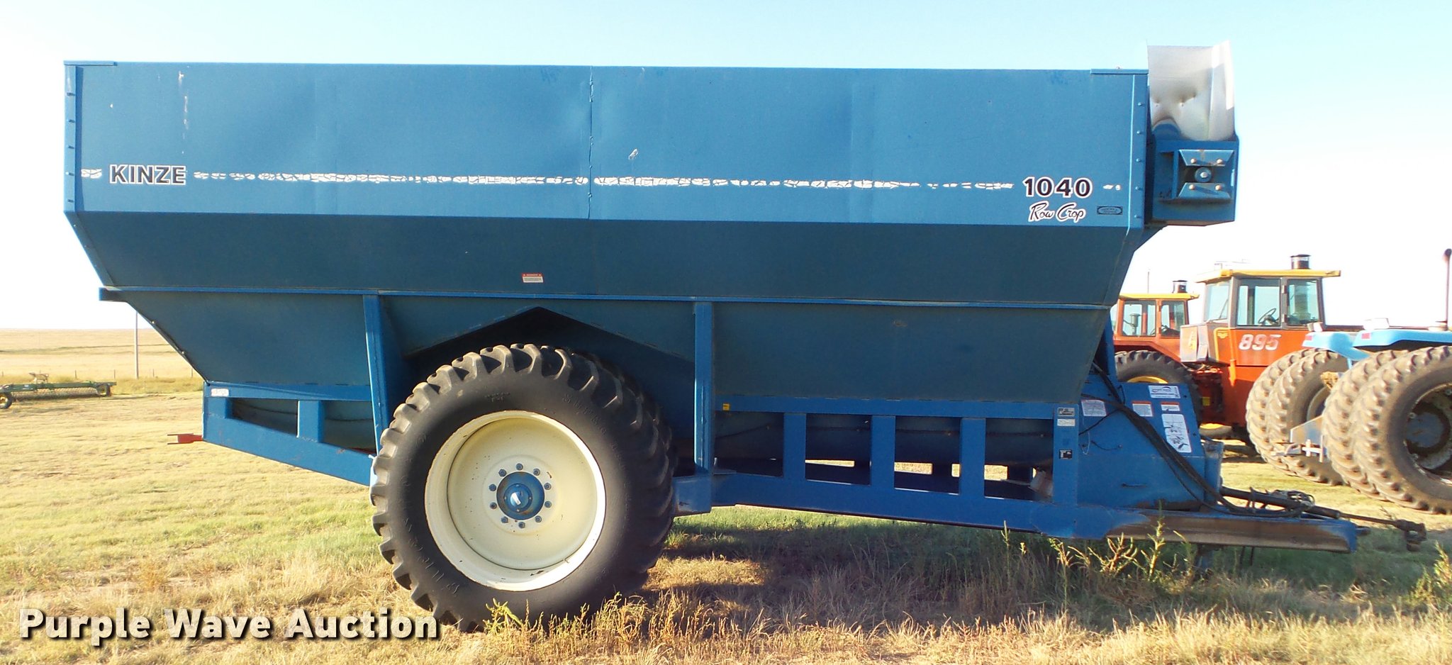 Purple Wave is selling a used Grain Cart or Gravity Wagon in Kansas. This item is a Kinze 1040 grain cart with the following: Model AW, 8'L x 16" diameter auger, Hydraulic operation, Work lights, Large 1000 PTO, Pin hitch, 18.4-38 tires, Serial 500697