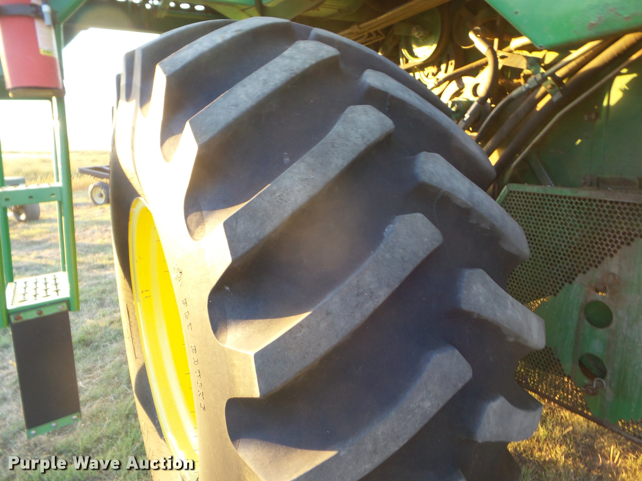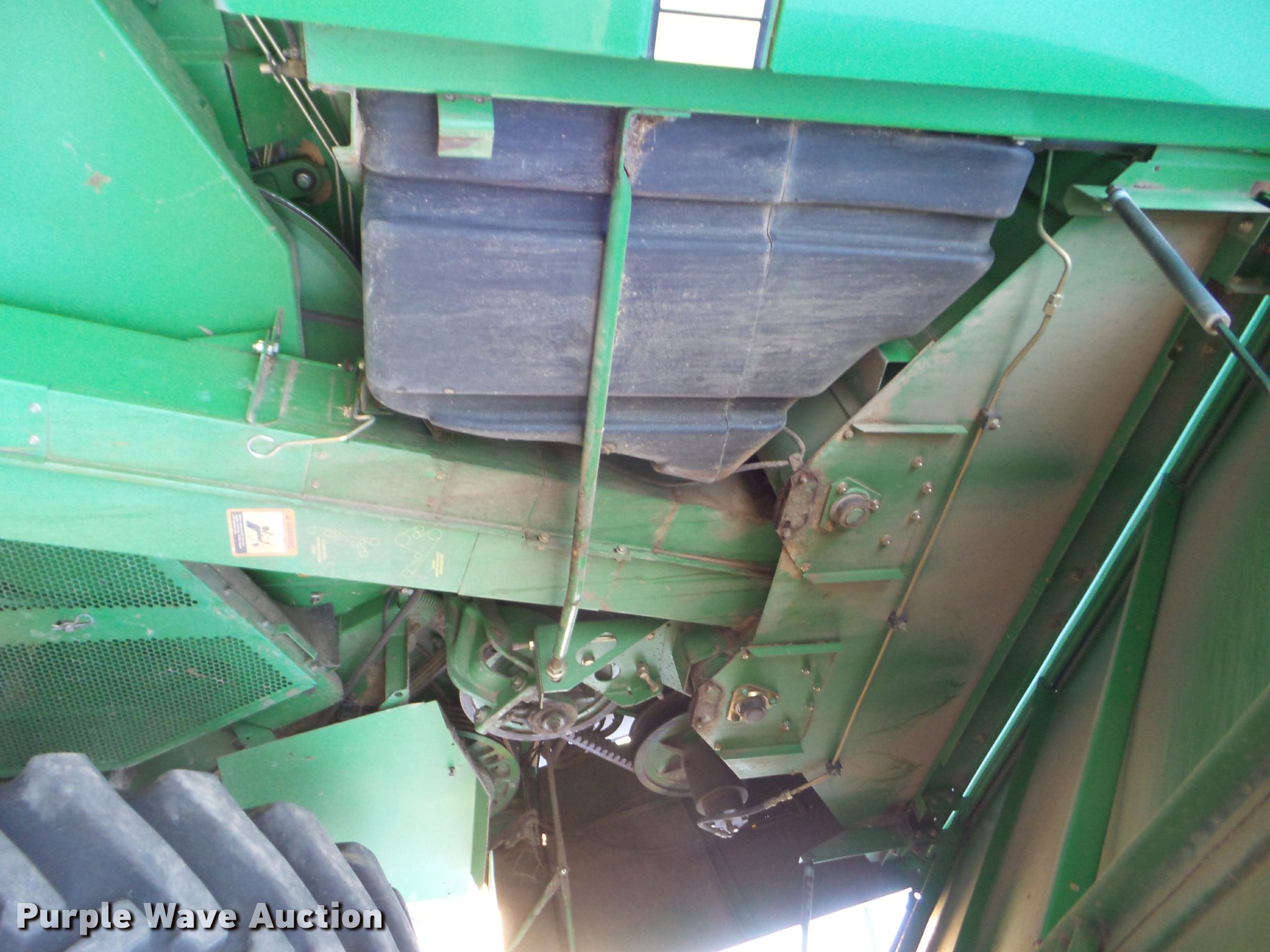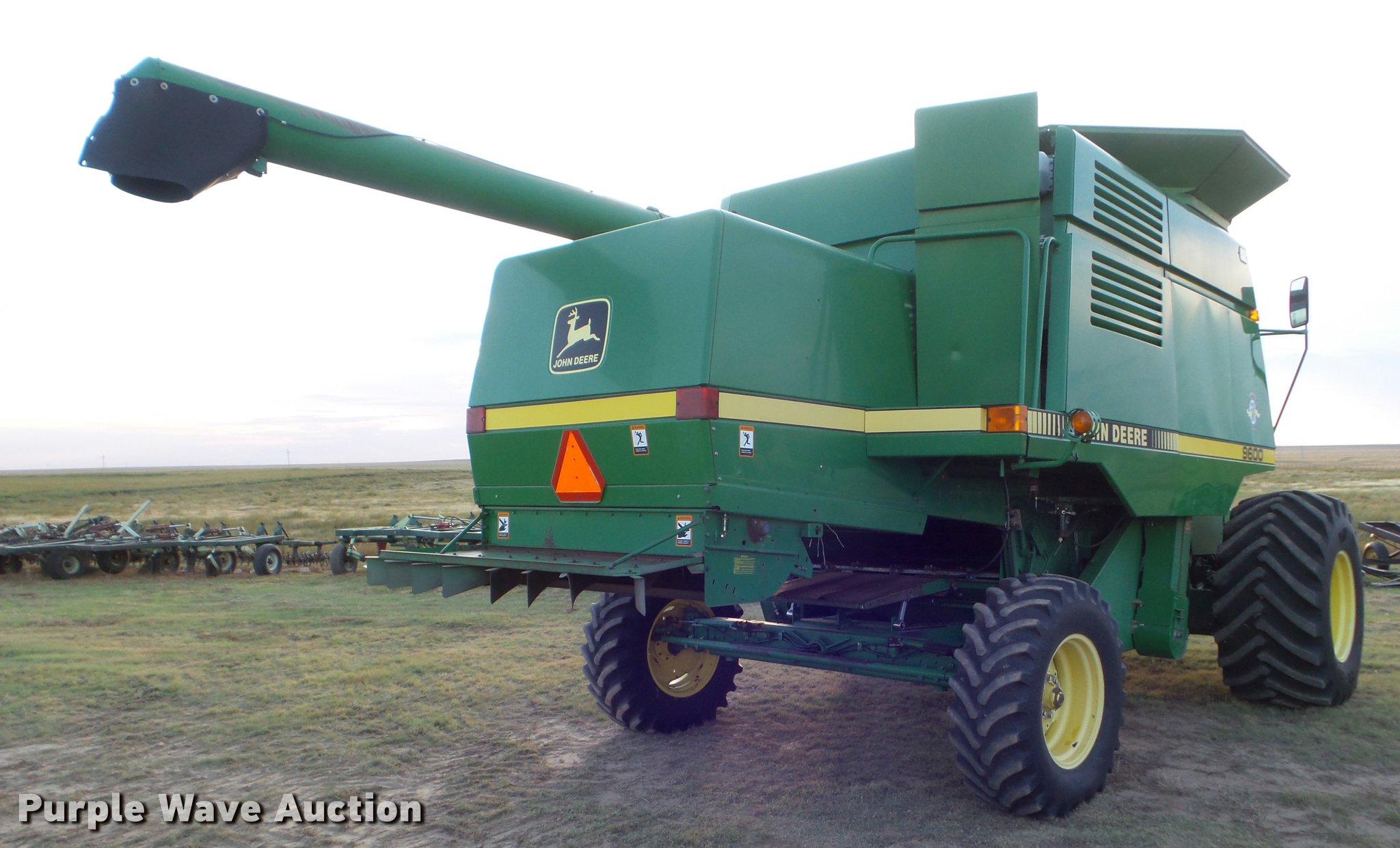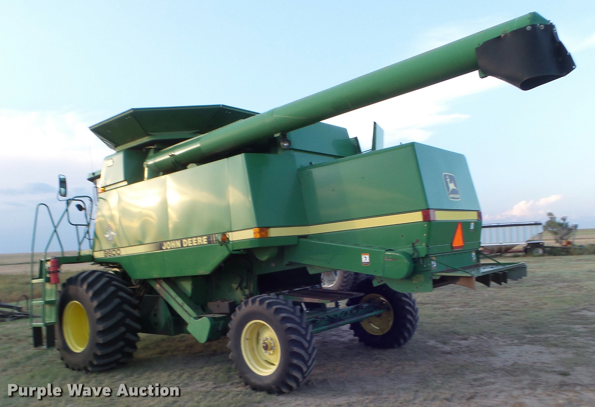 Purple Wave is selling a used Combine in Kansas. This item is a 1998 John Deere 9600 combine with the following: 5,615 engine hours on meter, 3,884 separator hours on meter, John Deere six cylinder turbo diesel engine, Hydrostatic transmission, 3F-3R gears, Feederhouse, Variable speed, Reverser, Single point header coupler, AC and heat, Tilt steering wheel, AM/FM, Air suspension seat, Instructor's seat, Block heater, Straw chopper, Bin extensions, Work lights, 20' unloading auger, 30.5-32 front tires, 16.9-26 rear tires, CB radio not included, Serial H09600X671542