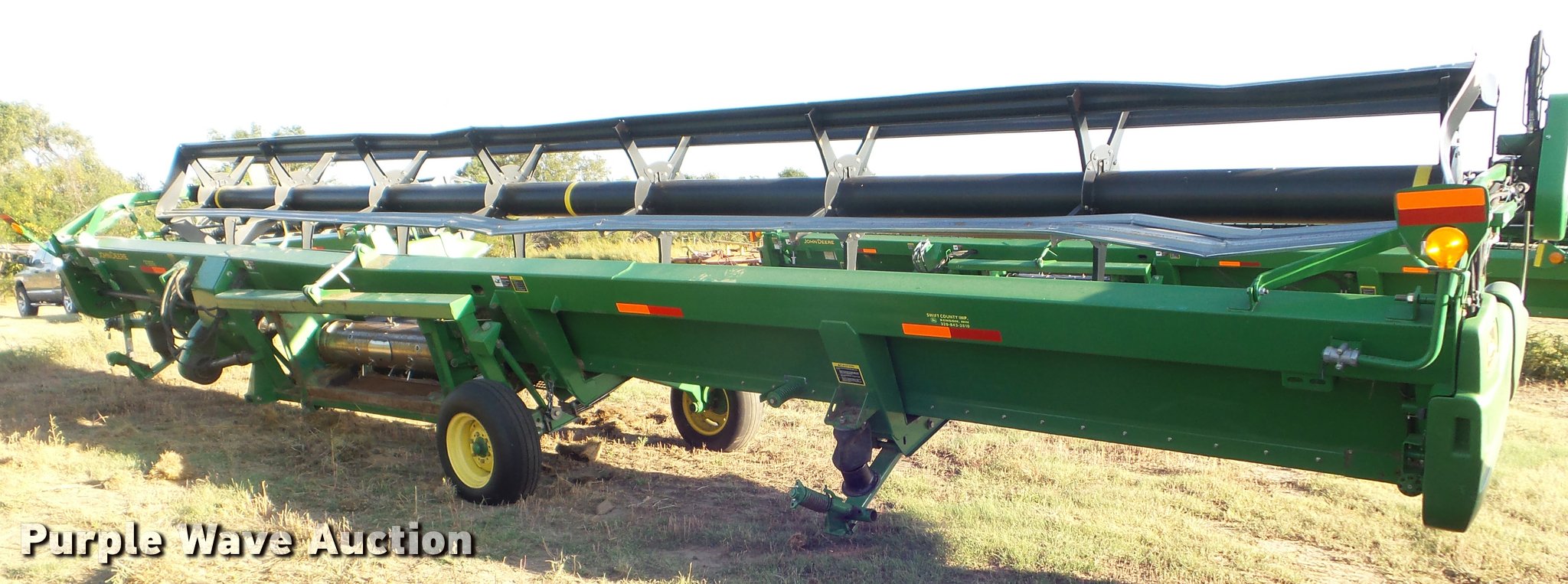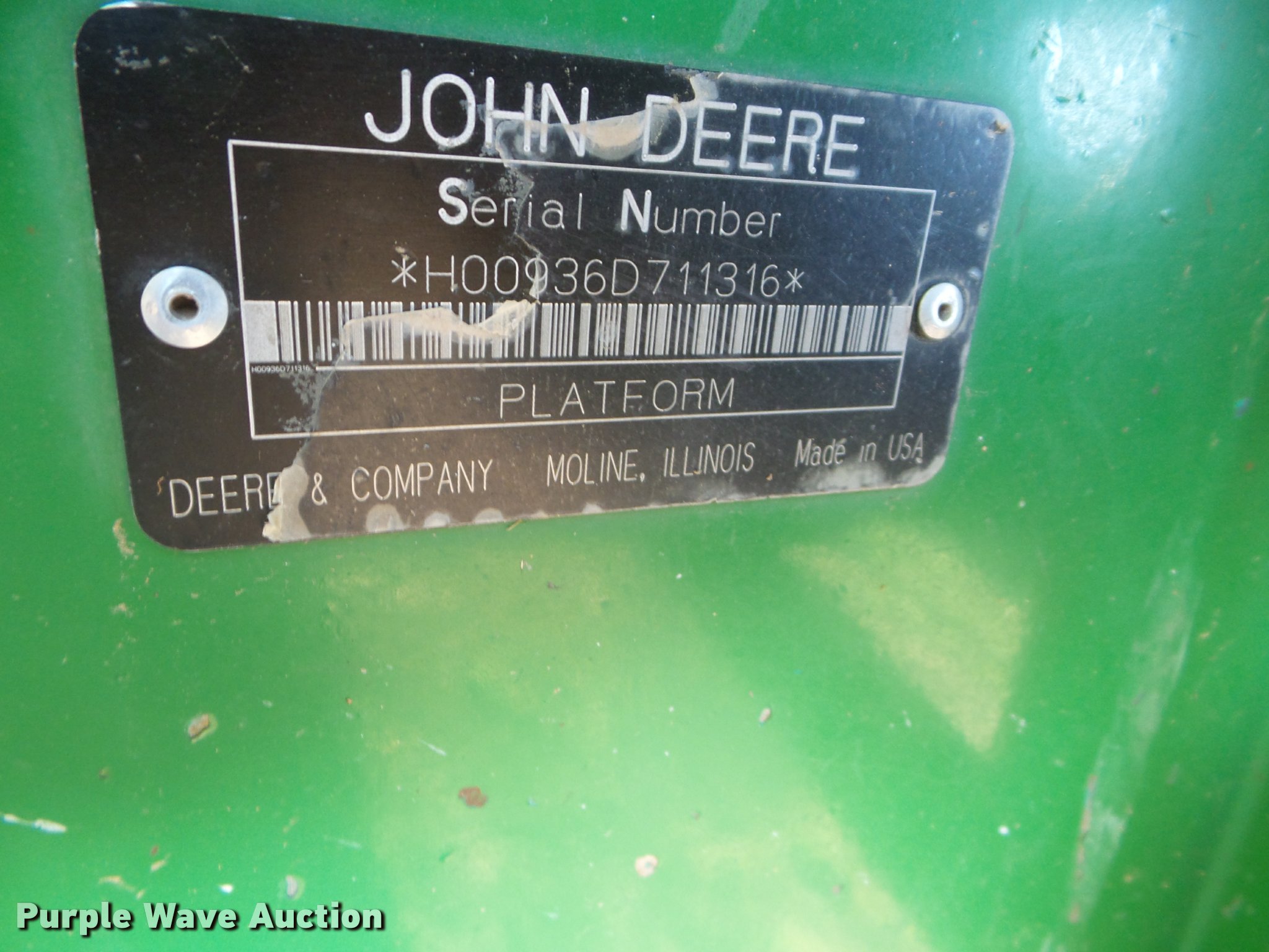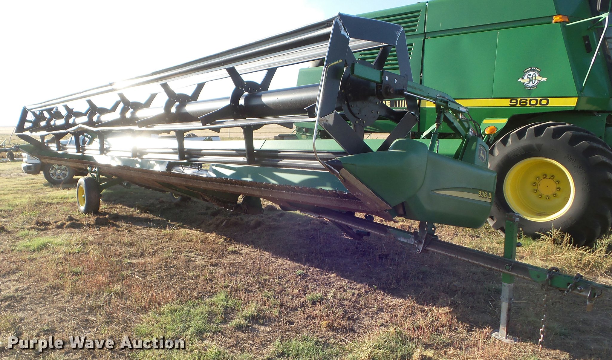 Purple Wave is selling a used Platform or Stripper Head in Kansas. This item is a 2005 John Deere 936D draper head with the following: 36'W, Bat reel, Hydraulic fore/aft, Hydraulic reel height control, Steel skid plates, Single point coupler, Single driveline, Transport package, 9.5-15 tires, Serial H00936D711316
