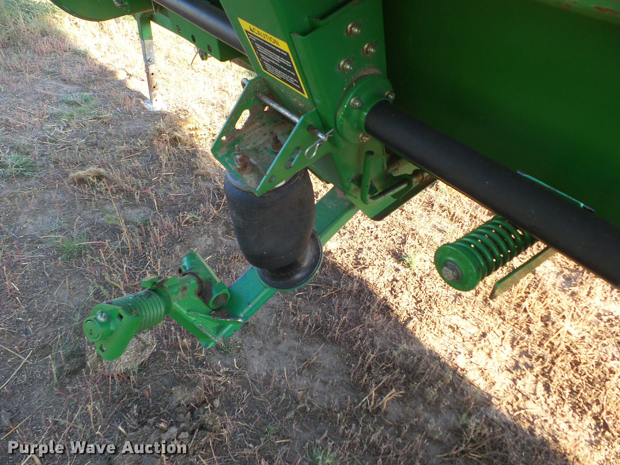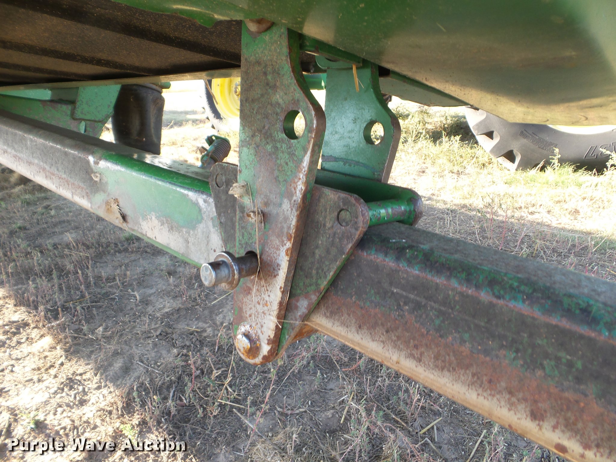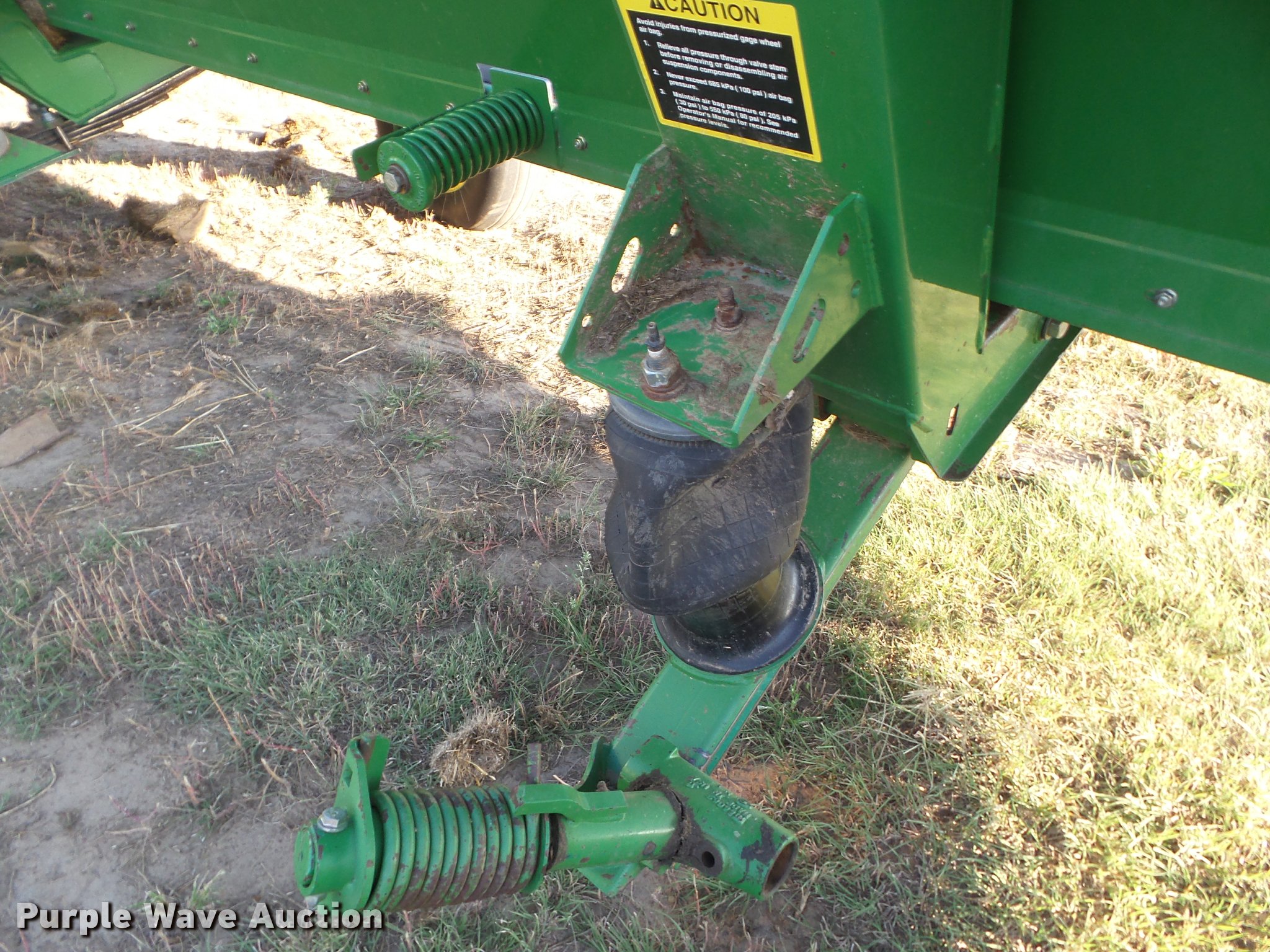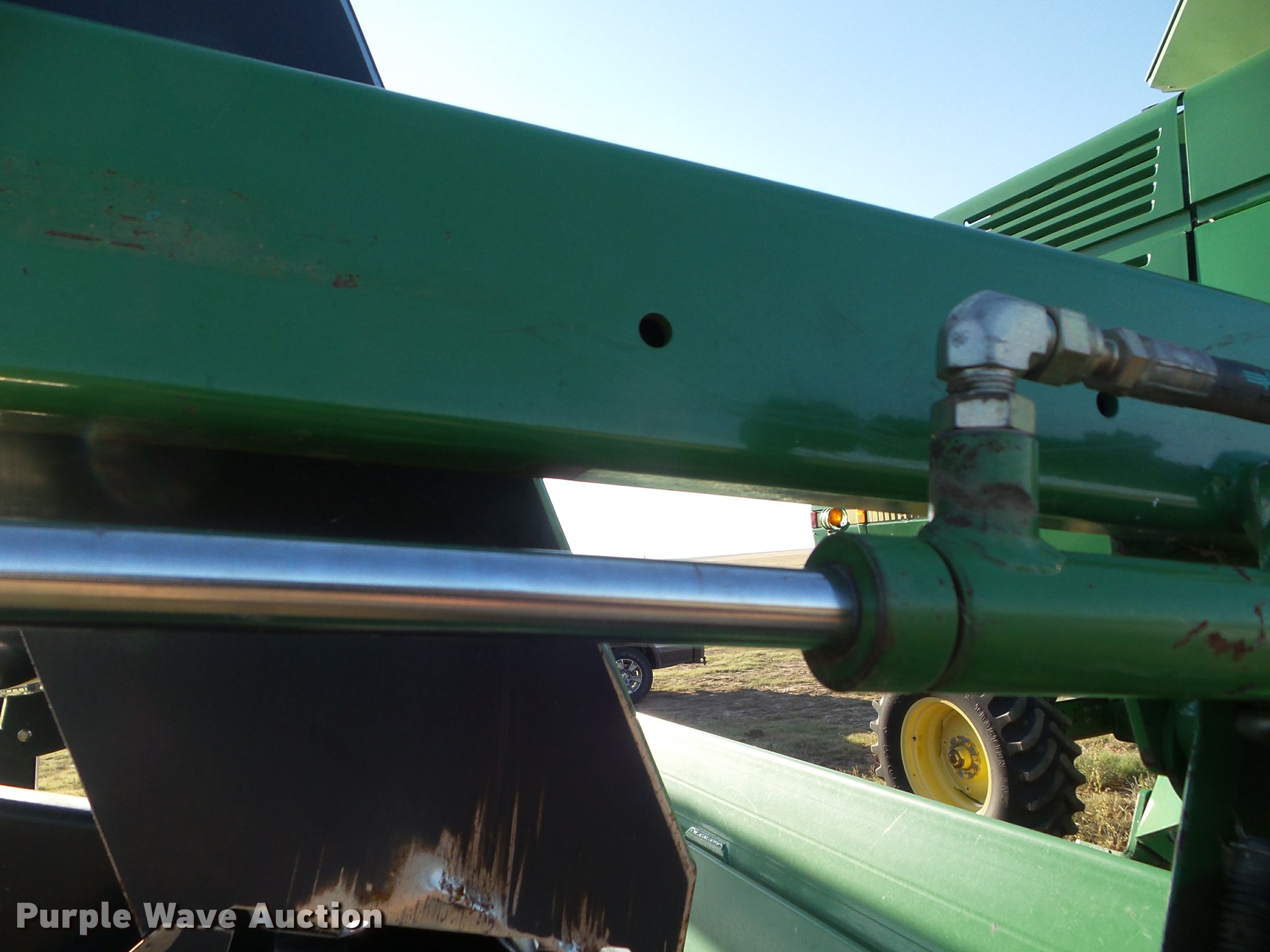 2005 John Deere 936D draper head. 36'W, Bat reel, Hydraulic fore/aft, Hydraulic reel height control, Steel skid plates, Single point coupler, Single driveline, Transport package, 9.5-15 tires, Serial H00936D711316. Englert Partners - Open inspection Monday, October 24. Kendall, KS 67857