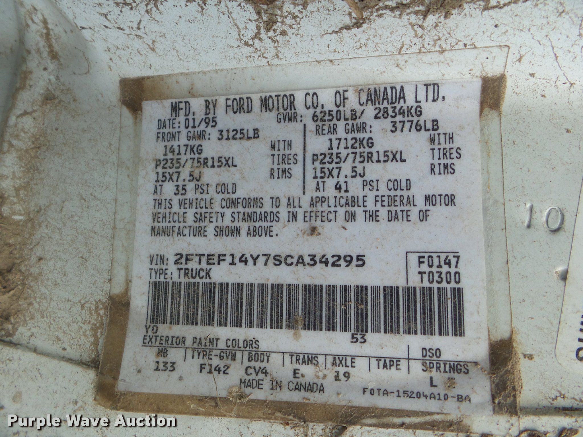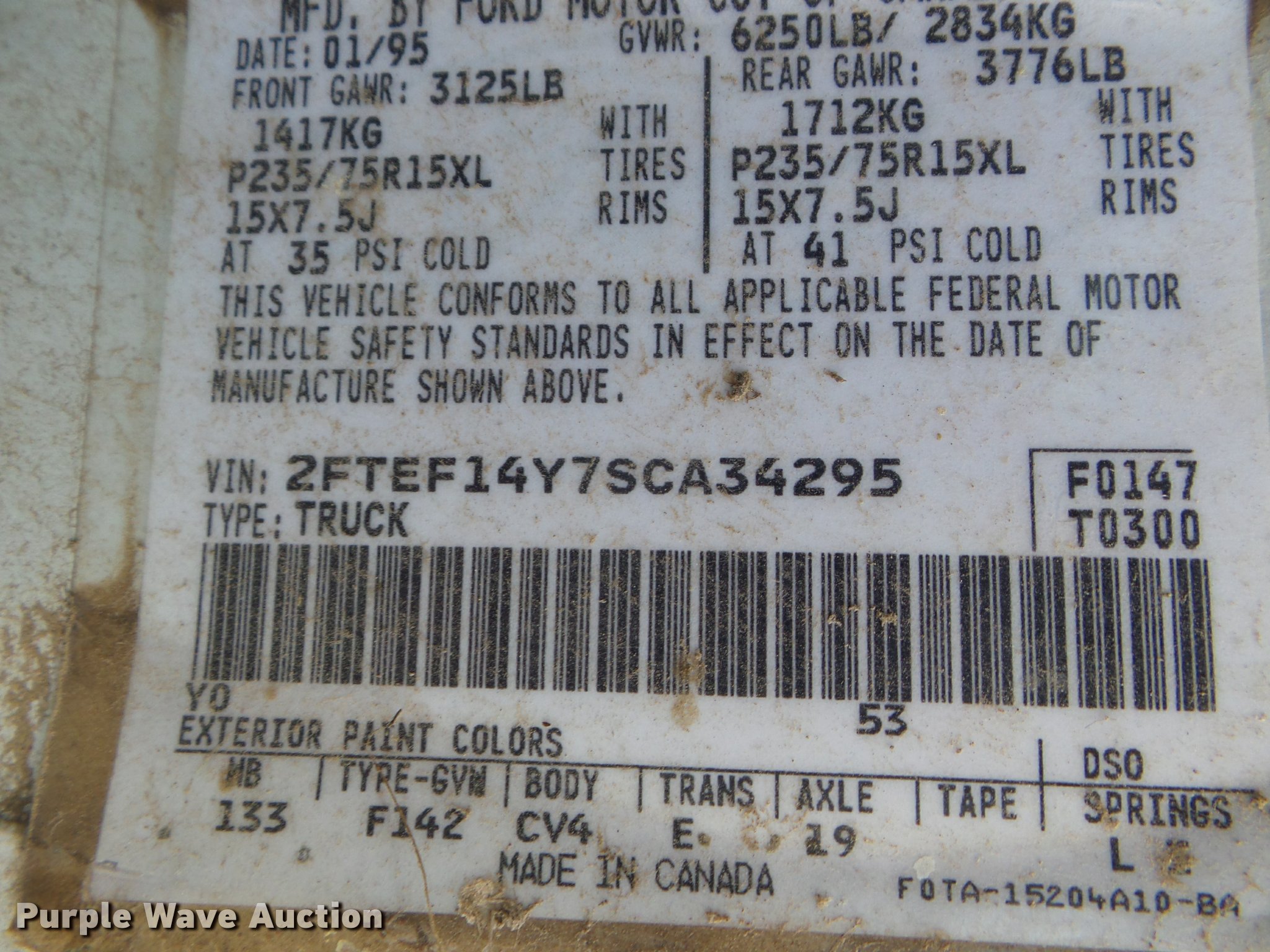 Purple Wave is selling a used 1/2 Ton Pickup or Van in Kansas. This item is a 1995 Ford F150 pickup truck with the following: Unknown miles on odometer, 4.9L L6 OHV 12V gas engine, Automatic transmission, Four wheel drive, AC and heat, Tilt, Cruise, AM/FM, Manual windows and locks, Bed liner, 235/75R15 tires, Cracked windshield, Non-operational unit