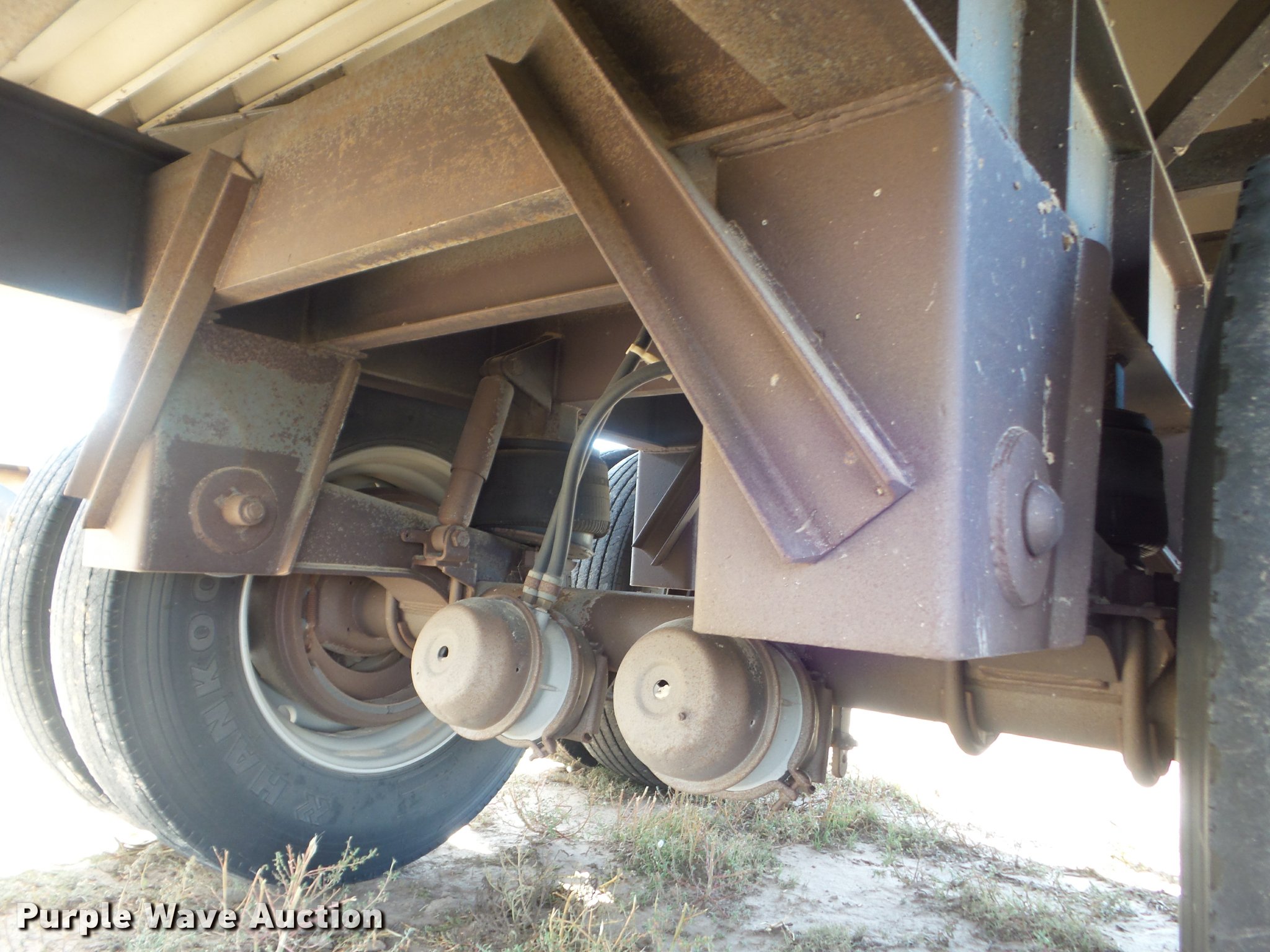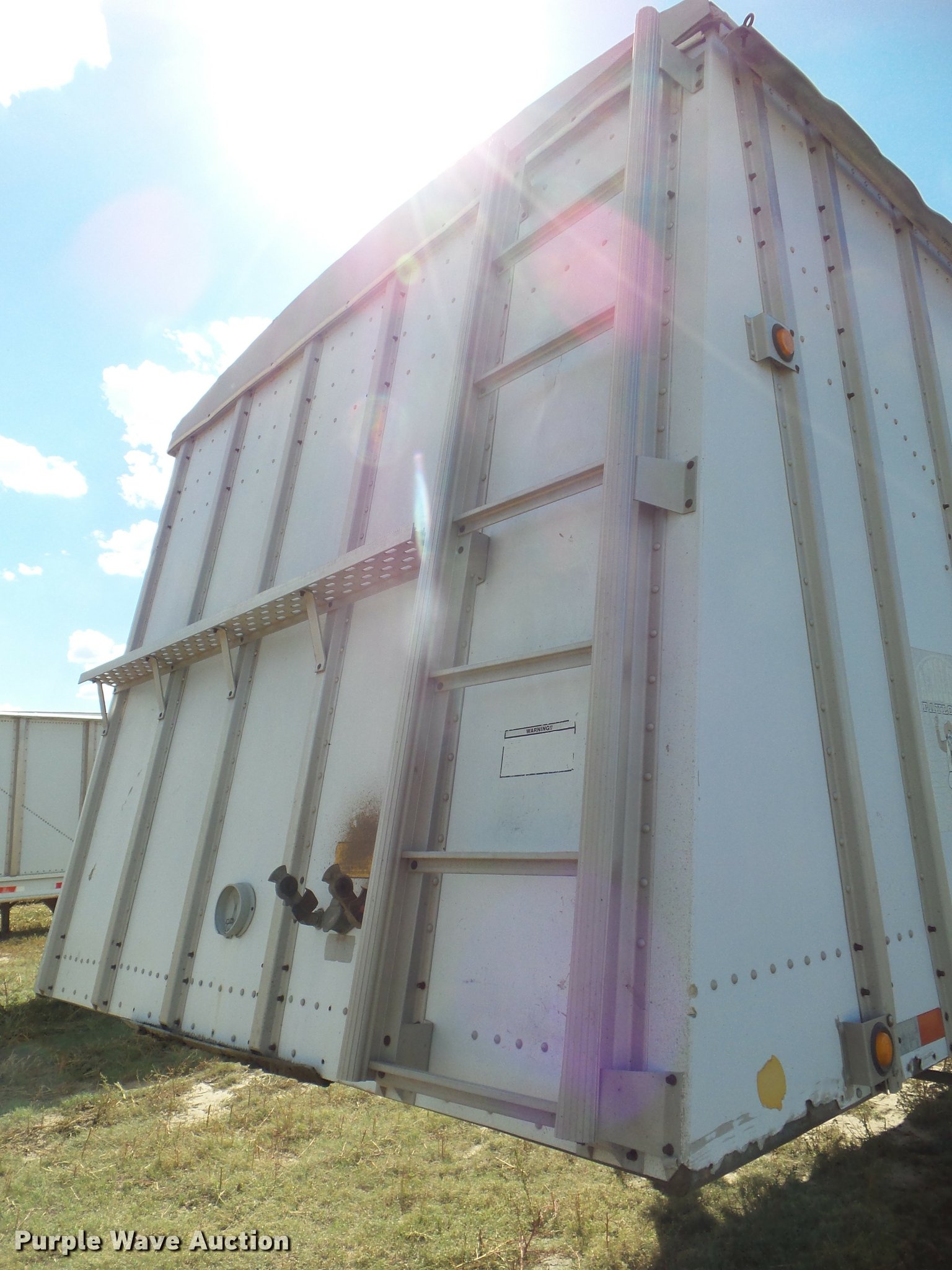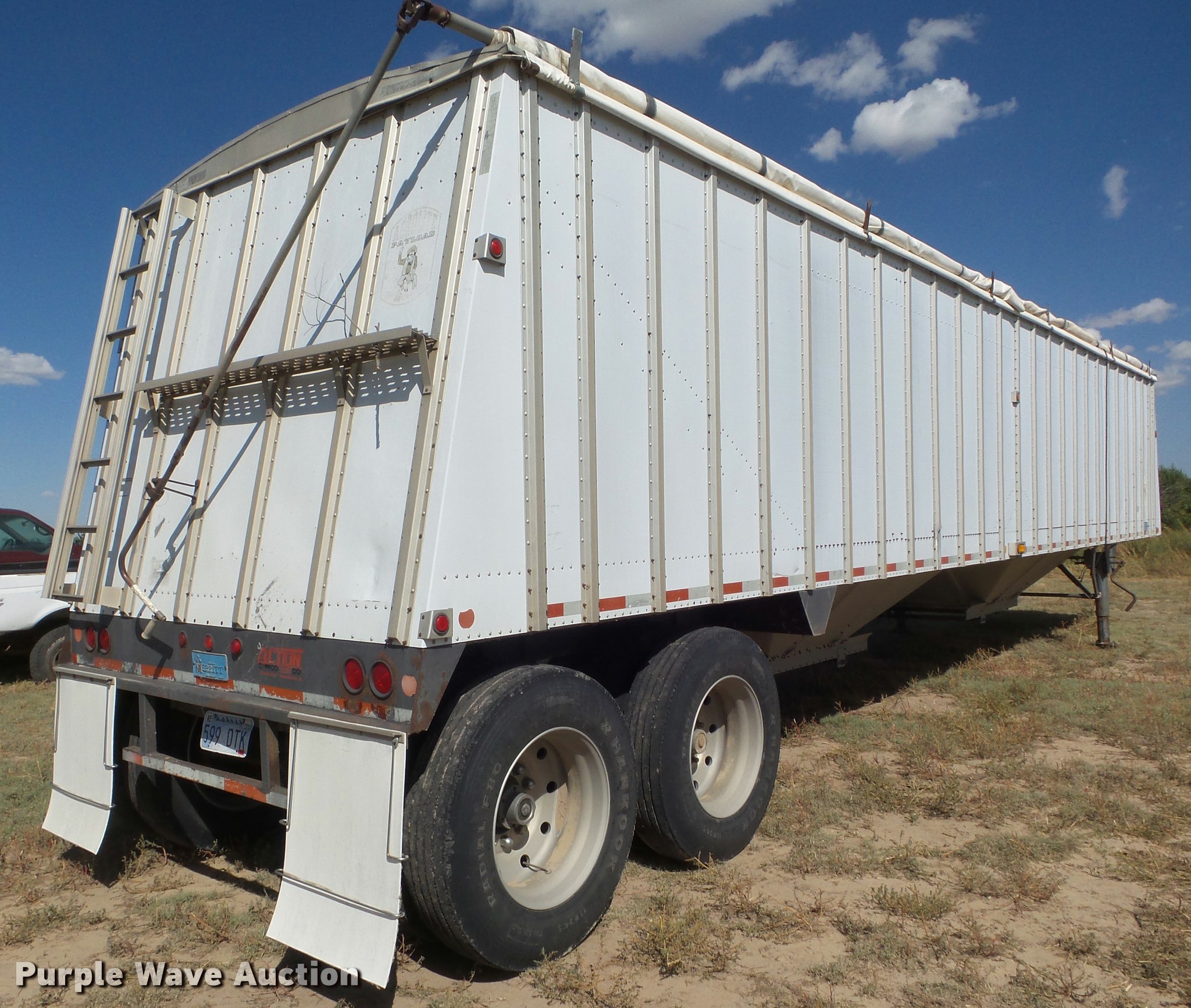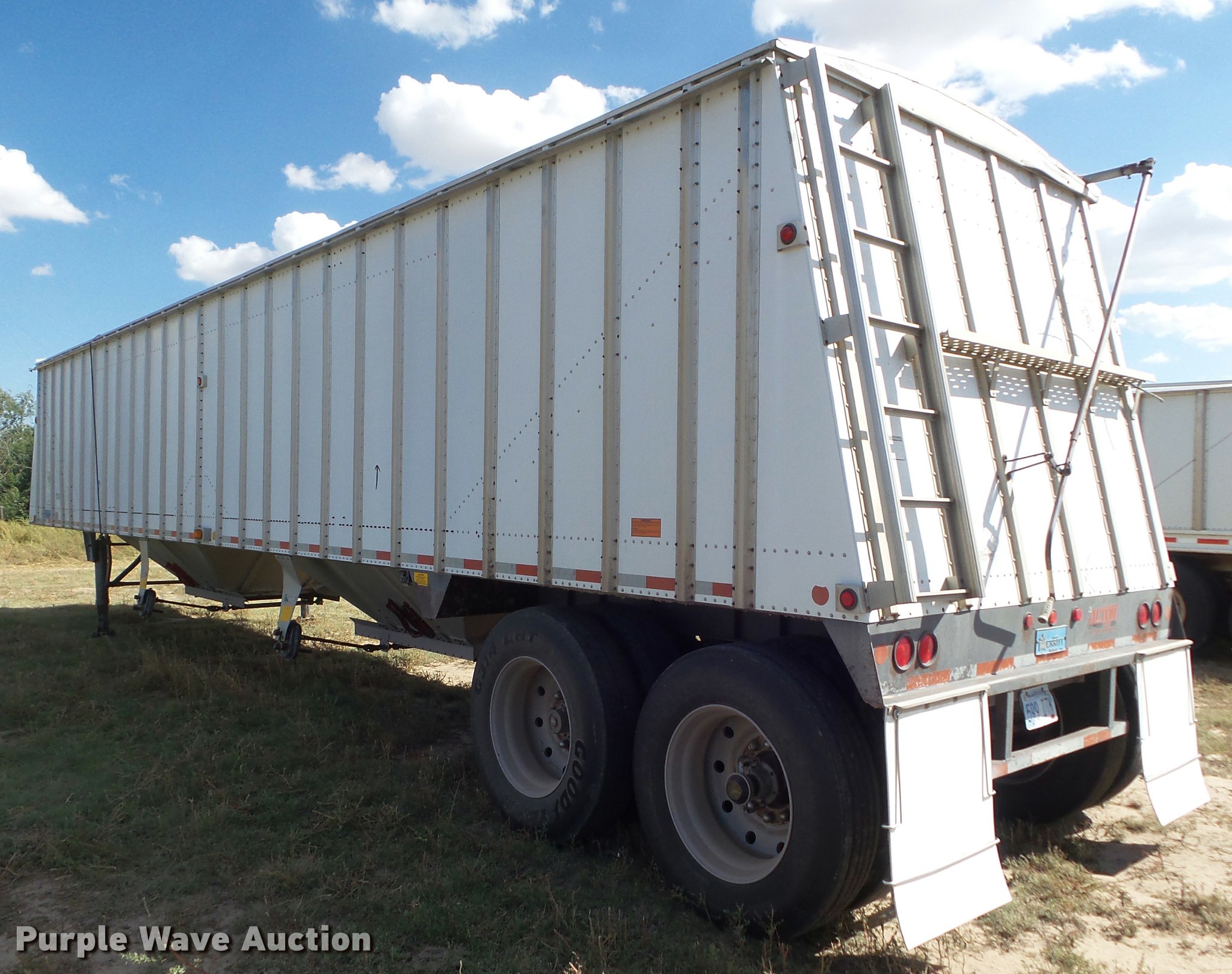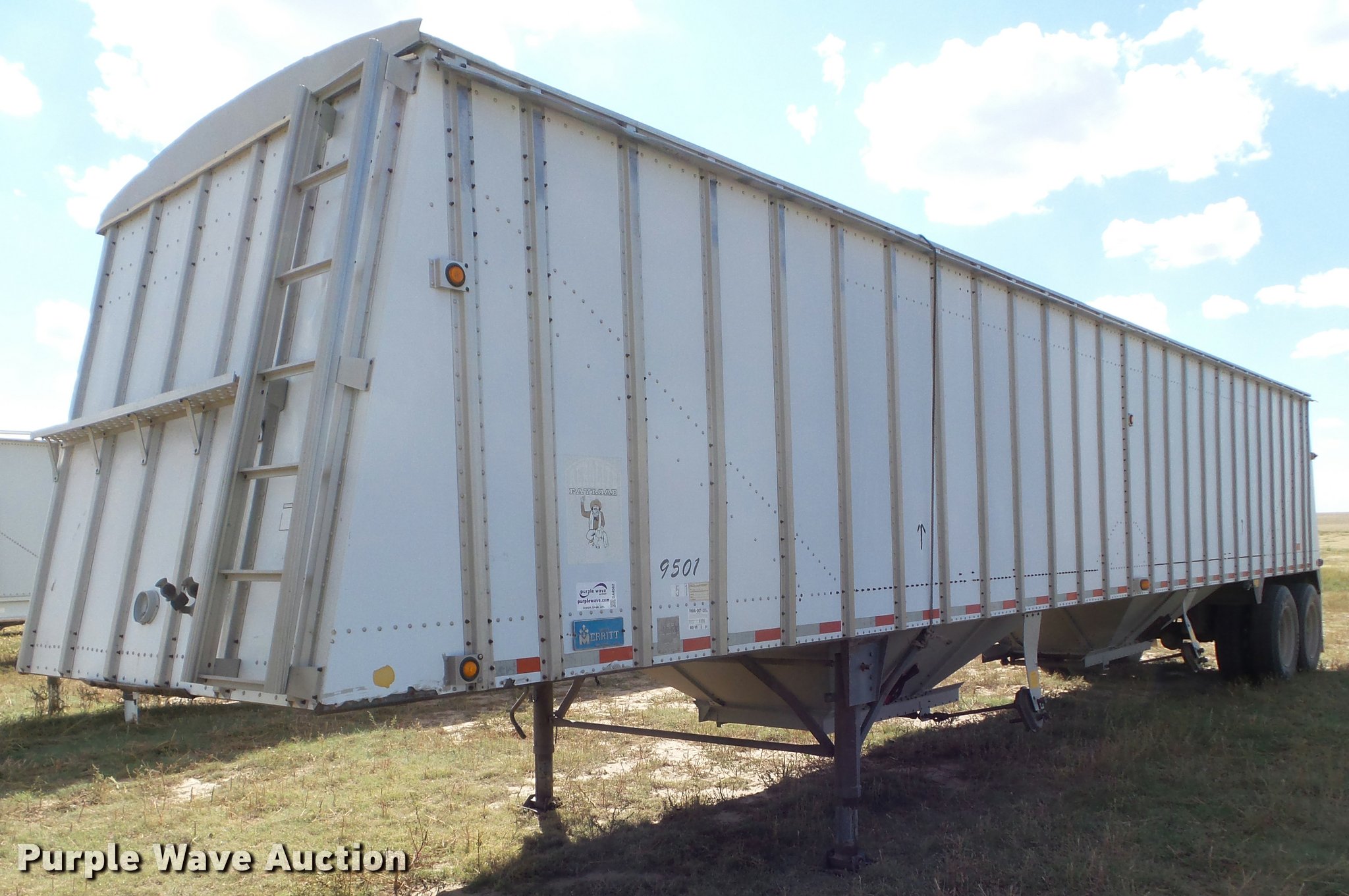 Purple Wave is selling a used Grain or Commodity Trailer in Kansas. This item is a 1995 Merritt double hopper grain trailer with the following: 43'L x 102"W, 80" side height, Manual trap gates, Front and rear ladders, Front and rear platforms, Rollover tarp, Aluminum construction, Fifth wheel plate, Dual leg two speed landing gear, Air suspension, Air brakes, Tandem axle, Aluminum wheels, 11R24.5 tires, GVWR 65,000 lbs