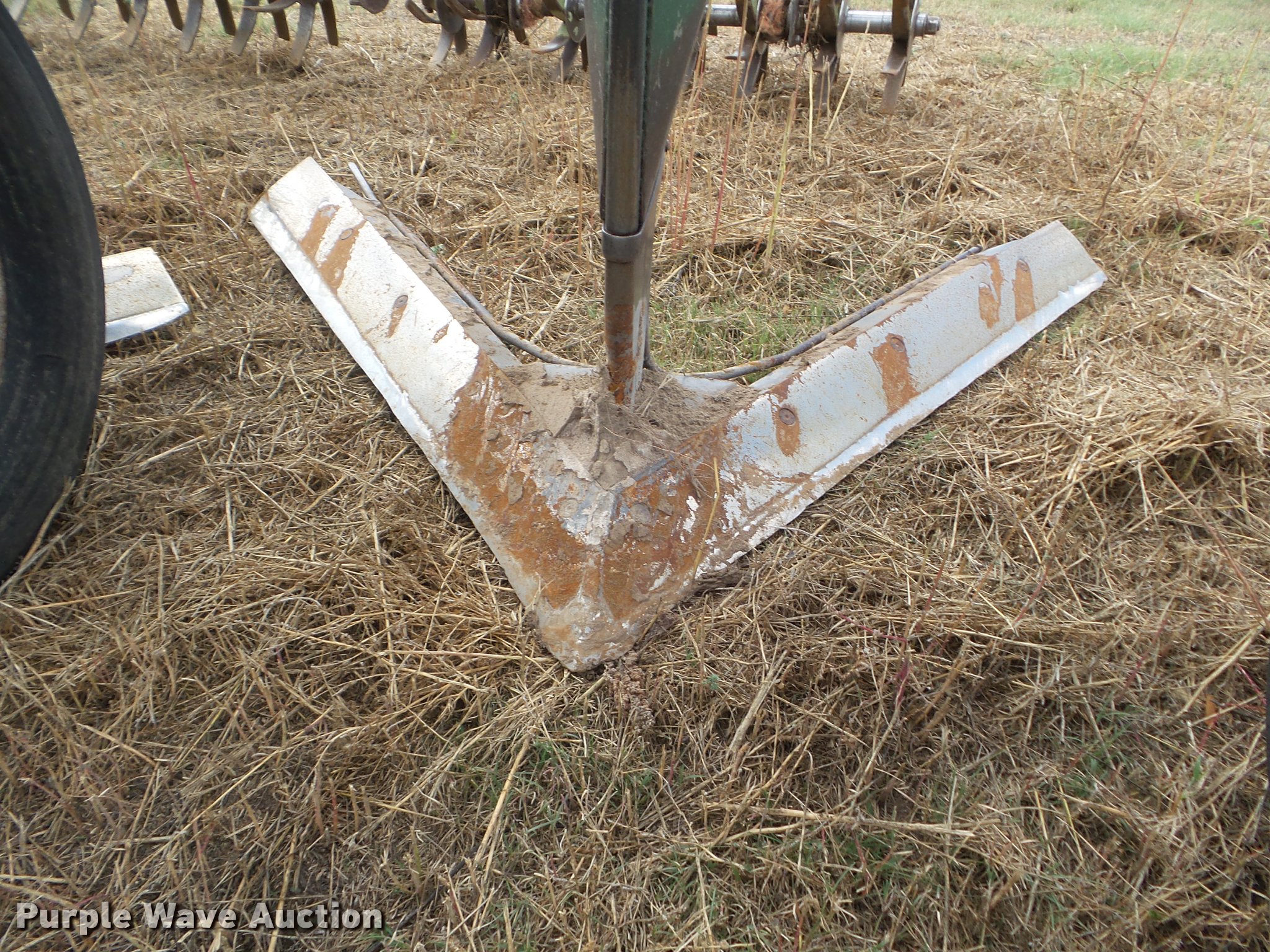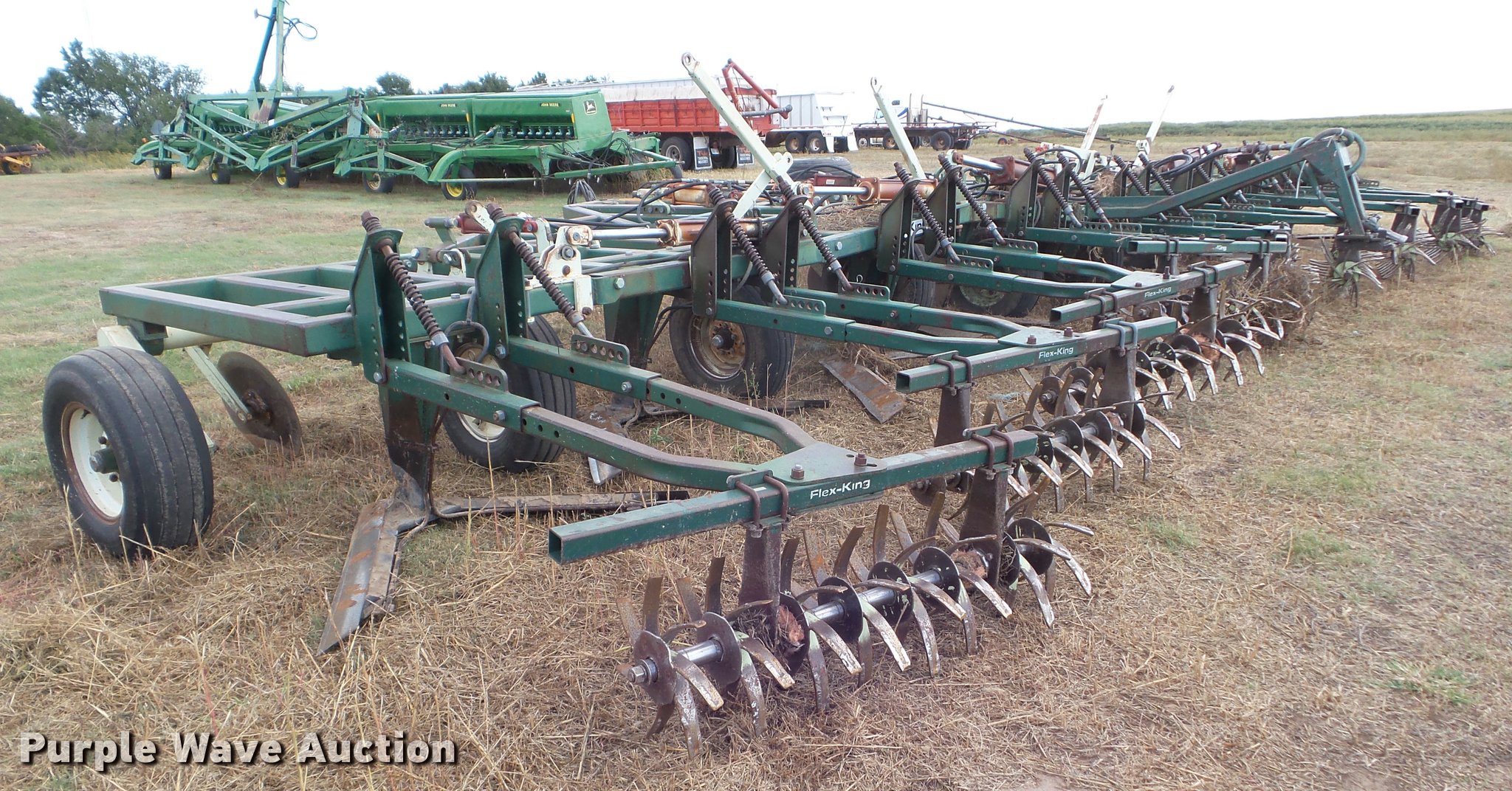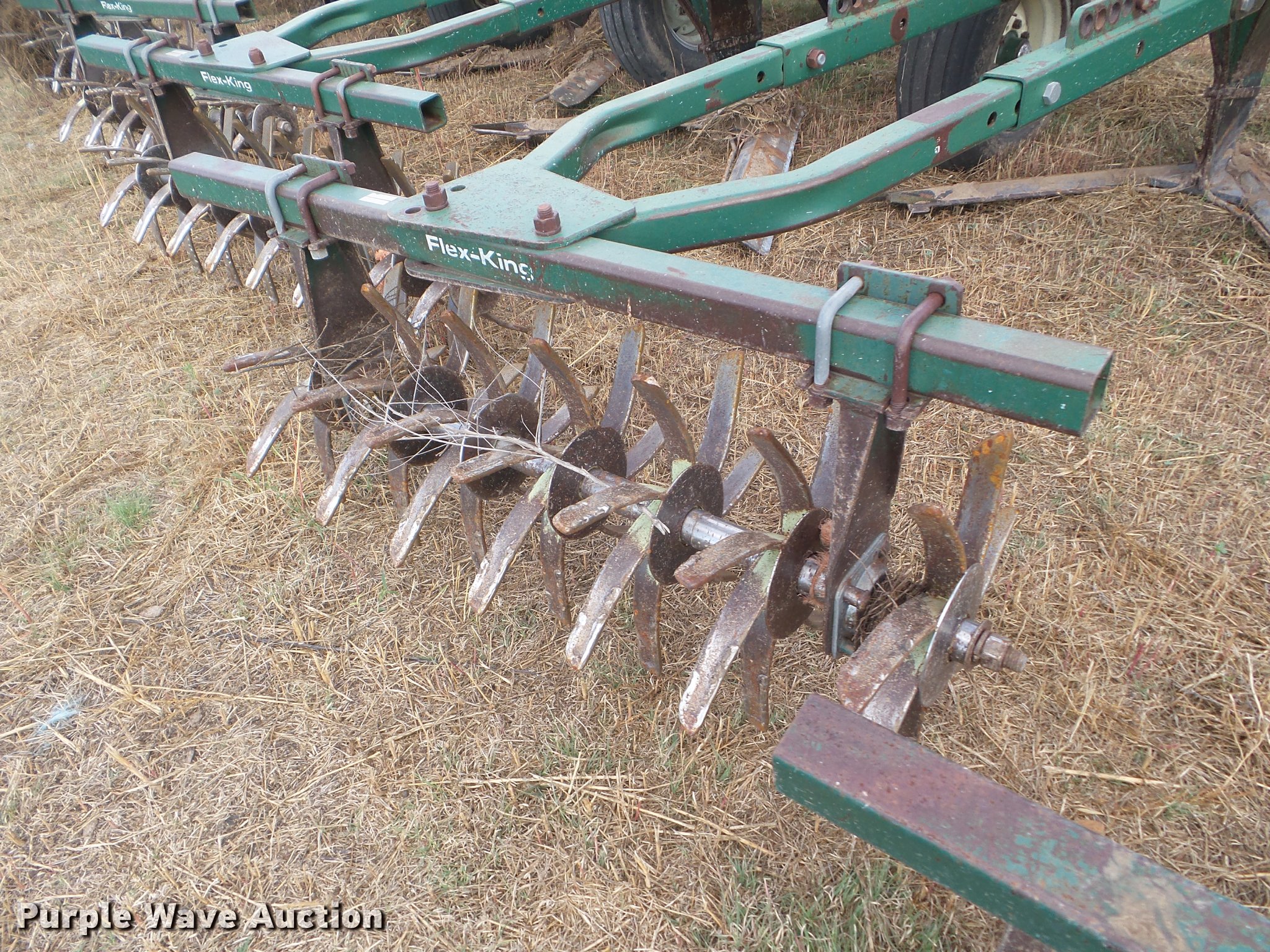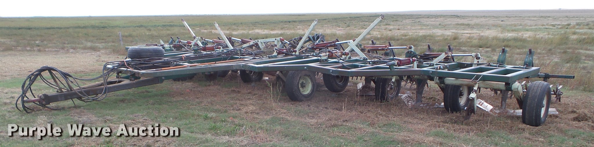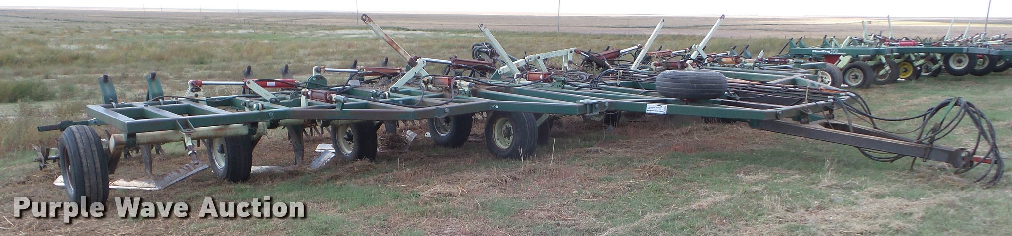 Purple Wave is selling a used Field Cultivator or Sweep Plow in Kansas. This item is a Flex King 9x5 sweep plow with the following: 40'W, (9) shanks, 5' sweep width, Hydraulic lift and fold, Rolling pickers/treader, Anhydrous hookups, Pin hitch, Rear hitch, 11-15 tires