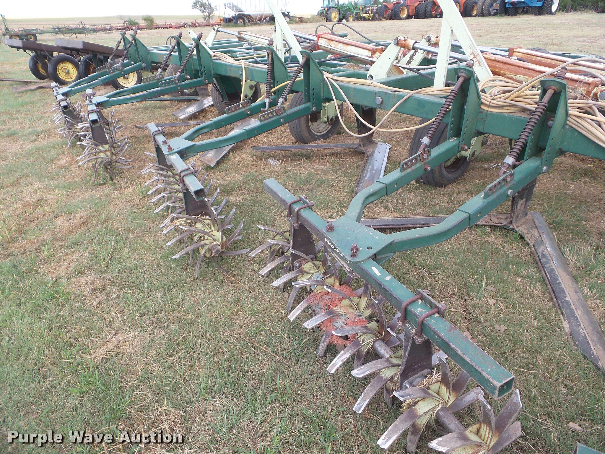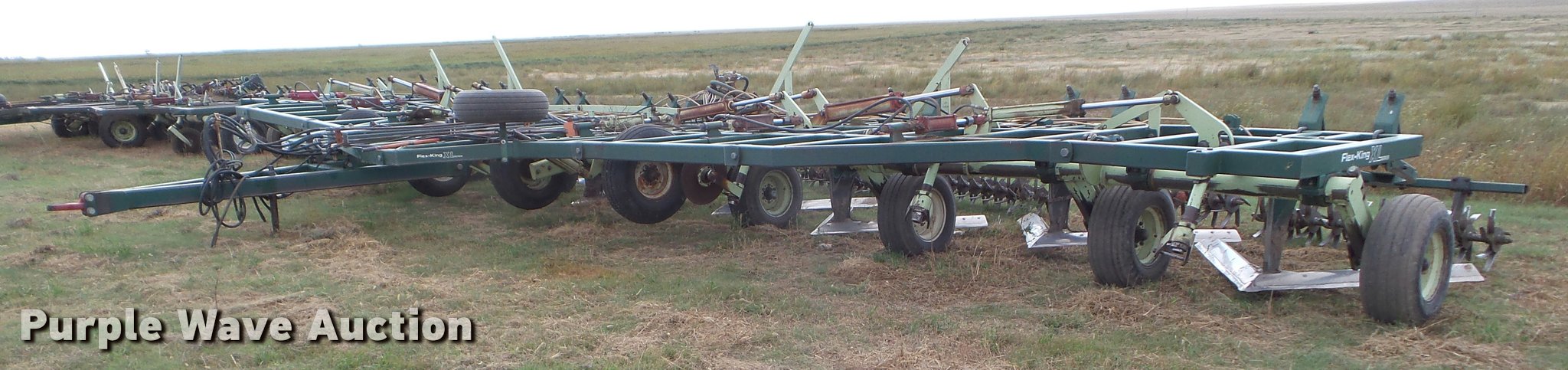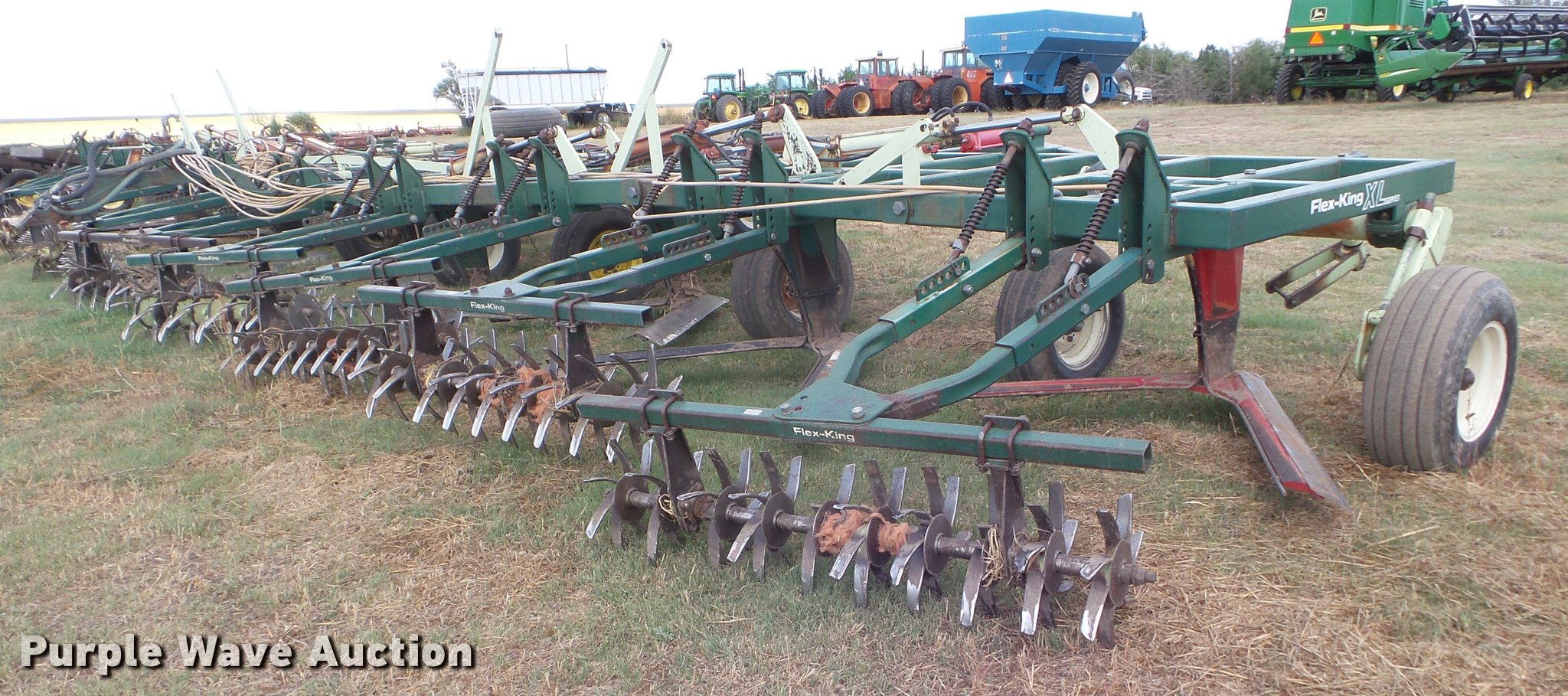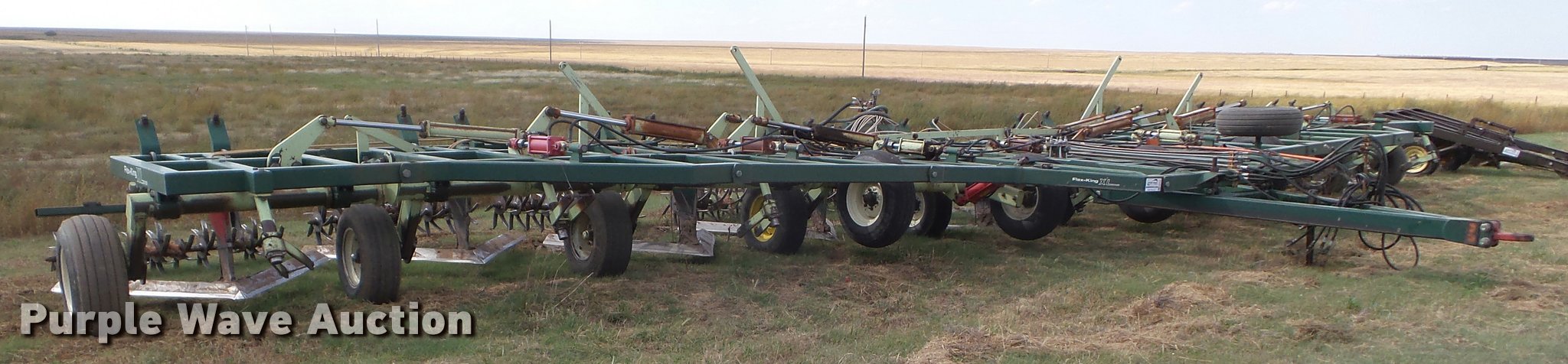 Purple Wave is selling a used Field Cultivator or Sweep Plow in Kansas. This item is a Flex King 9x6 sweep plow with the following: 56'W, (9) shanks, 6' sweep width, Hydraulic lift and fold, Rolling pickets/treader, Anhydrous hookups, Pin hitch, Rear hitch, 11-15 tires
