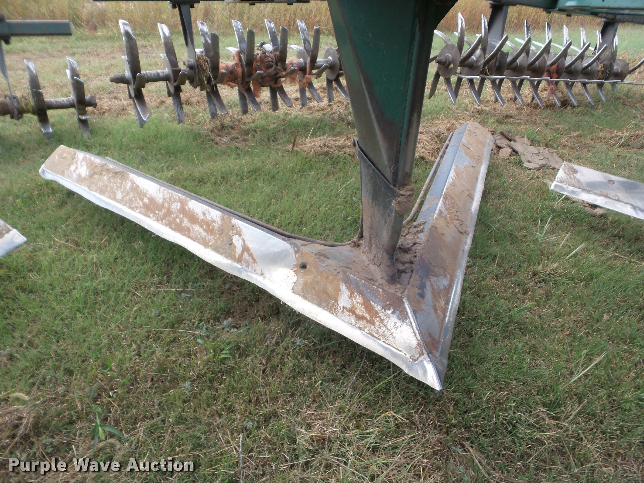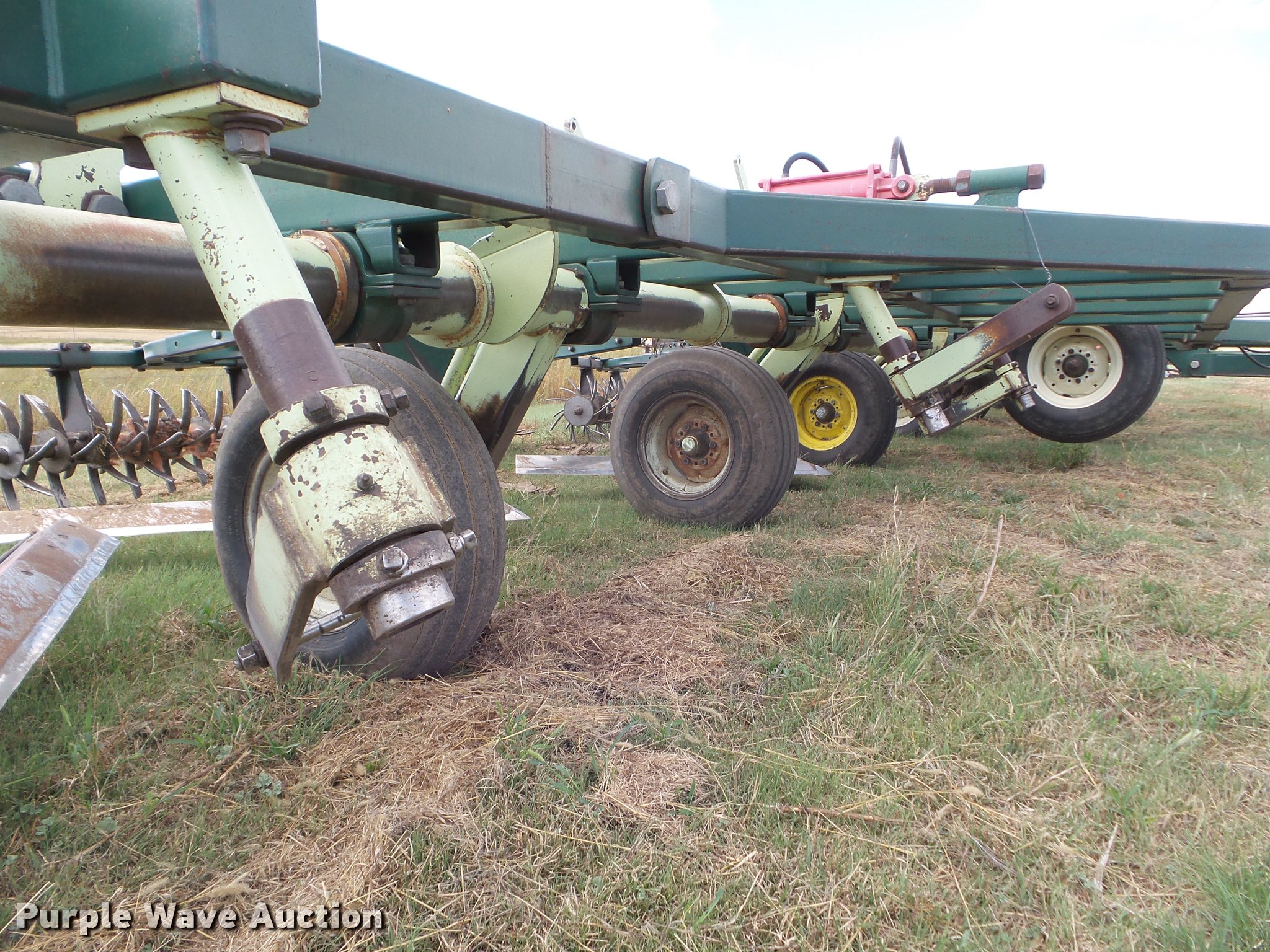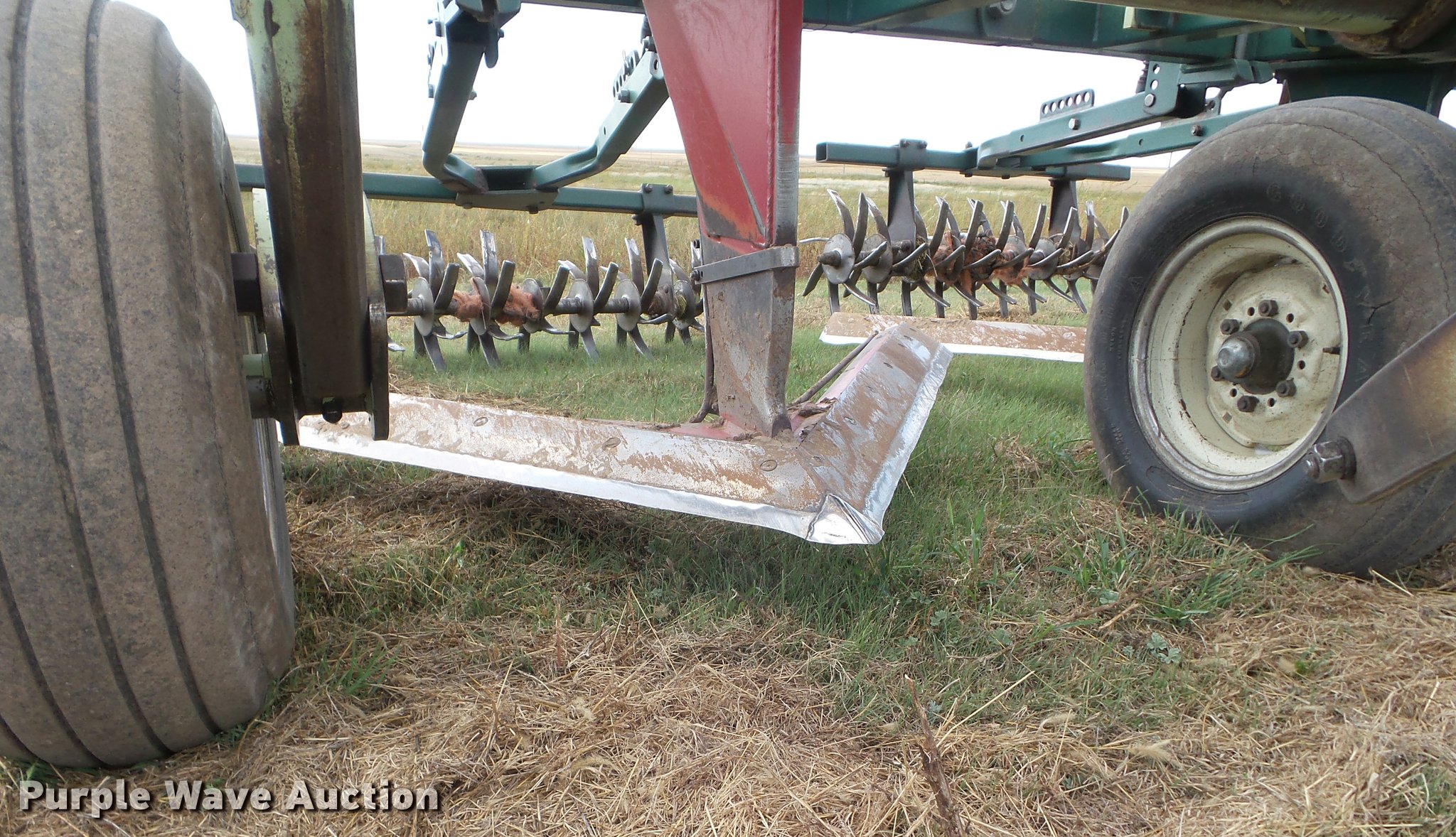 Flex King 9x6 sweep plow. 56'W, (9) shanks, 6' sweep width, Hydraulic lift and fold, Rolling pickets/treader, Anhydrous hookups, Pin hitch, Rear hitch, 11-15 tires. Englert Partners - Open inspection Monday, October 24. Kendall, KS 67857