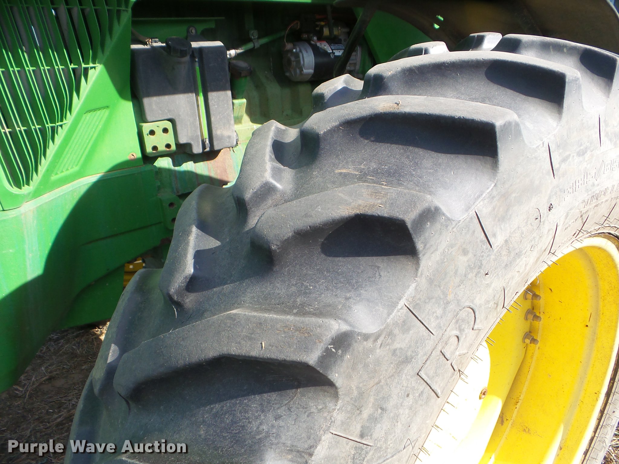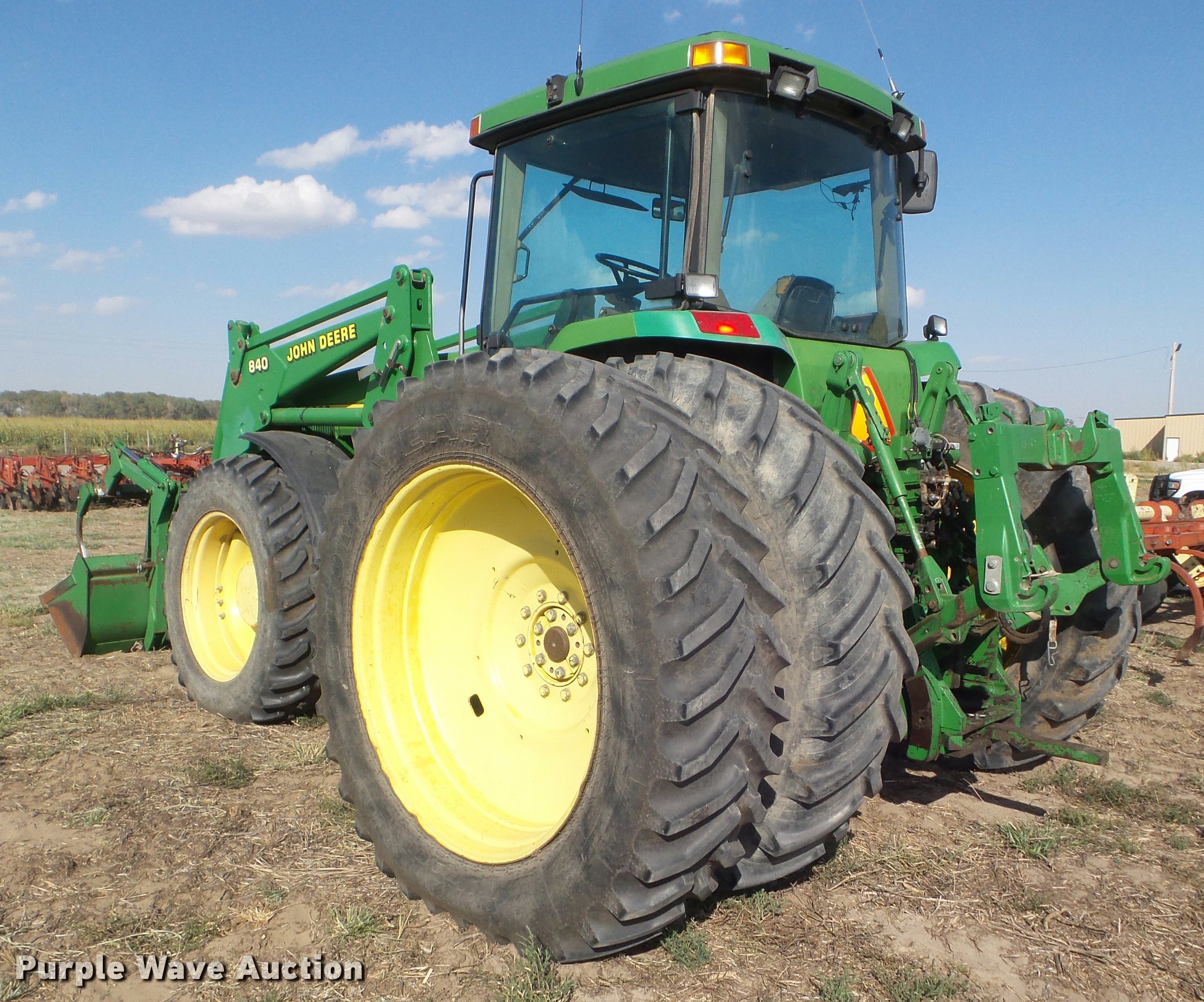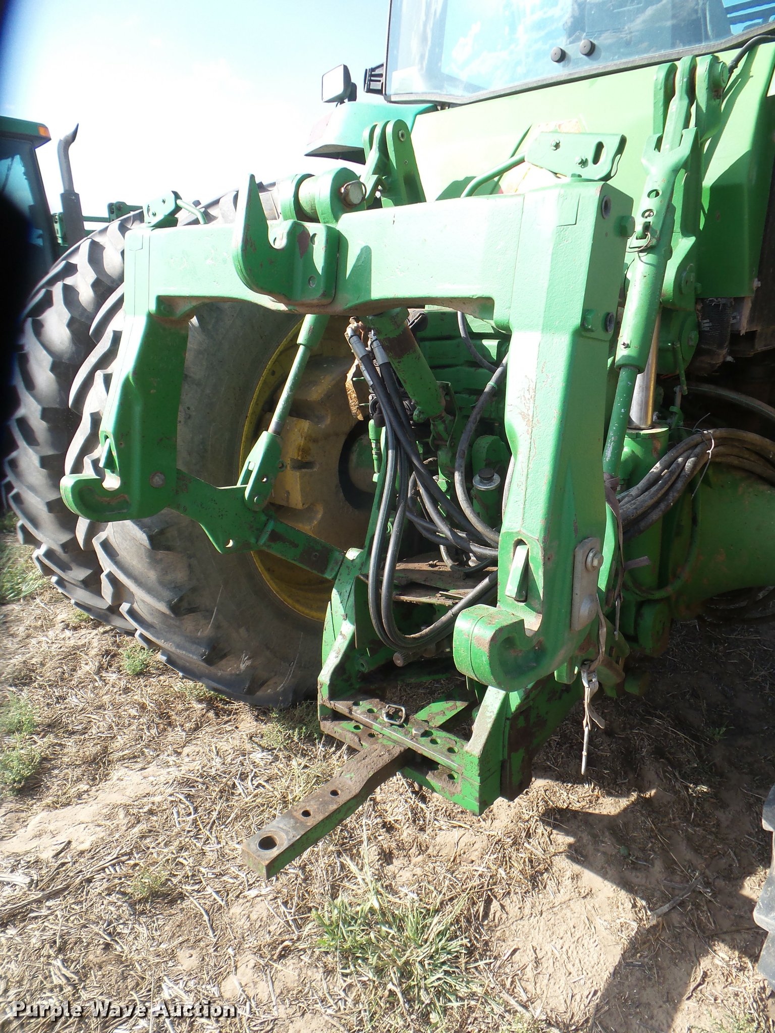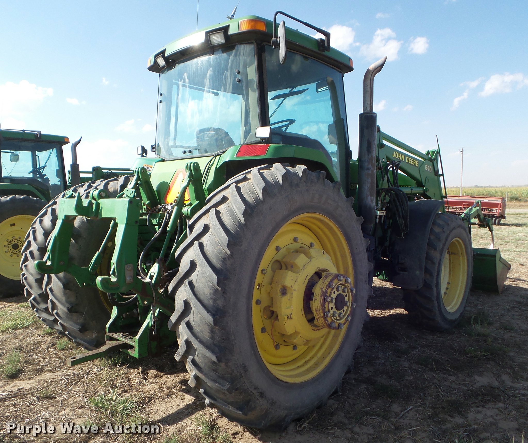 Purple Wave is selling a used Tractor in Kansas. This item is a 1995 John Deere 8300 MFWD tractor with the following: 1,630 hours on meter, Hours may vary, unit in use, John Deere 6076HRW six cylinder diesel engine, Serial RG6076H533395, Powershift transmission, 14F-3R gears, AC and heat, Tilt steering wheel, AM/FM, Suspension seat, Visor, John Deere 840 loader, Quick attach, 97"W grapple bucket, Joystick controls, Serial W00840X003157, Three point, Top link, Quick attach, Large 1000 PTO, (4) rear hydraulic remote sets, (4) wheel weights, 385/85R34 front tires, 480/80R46 dual rear tires, Unattached right rear dual tires included, Serial RW8300P001108
