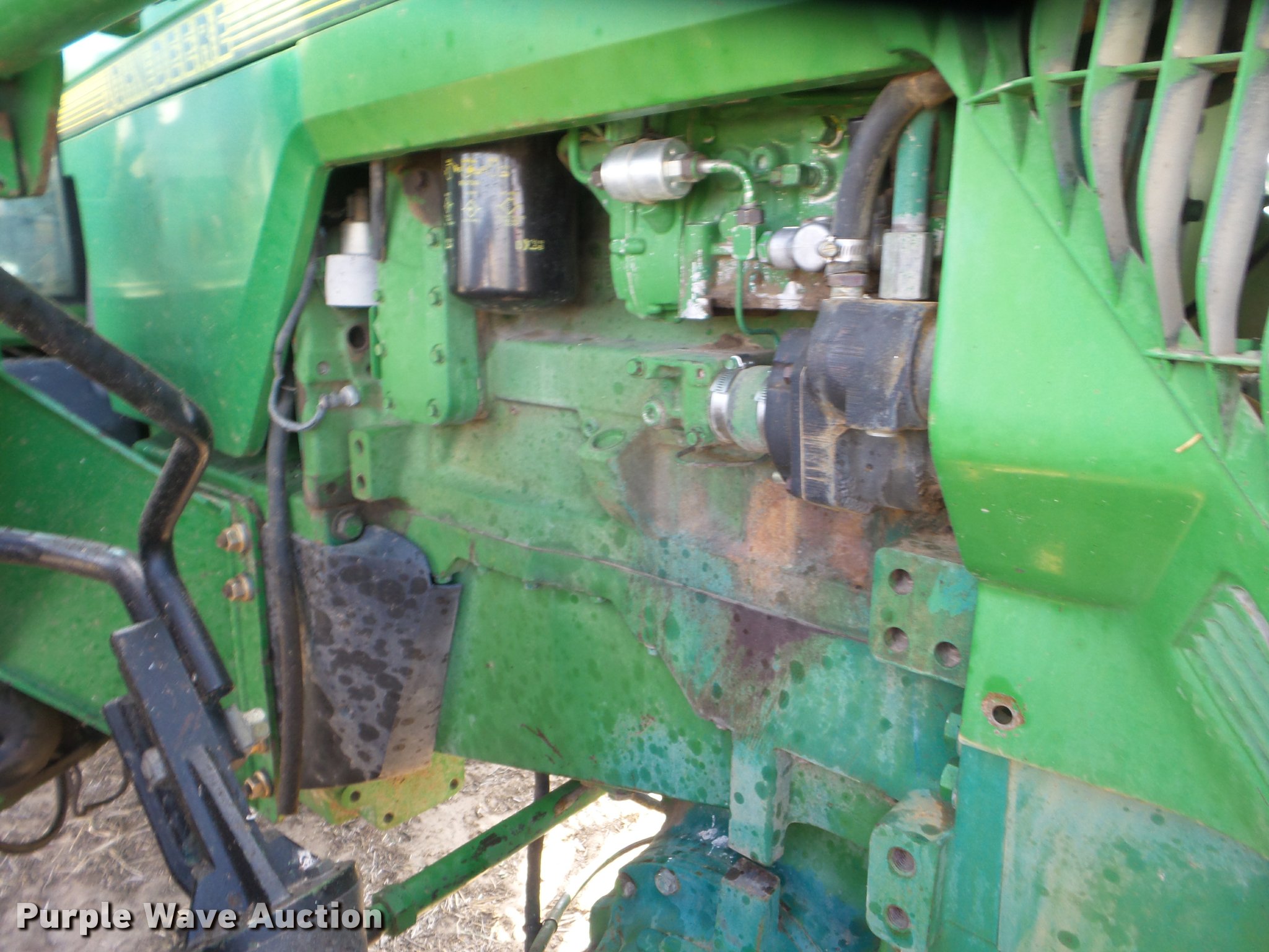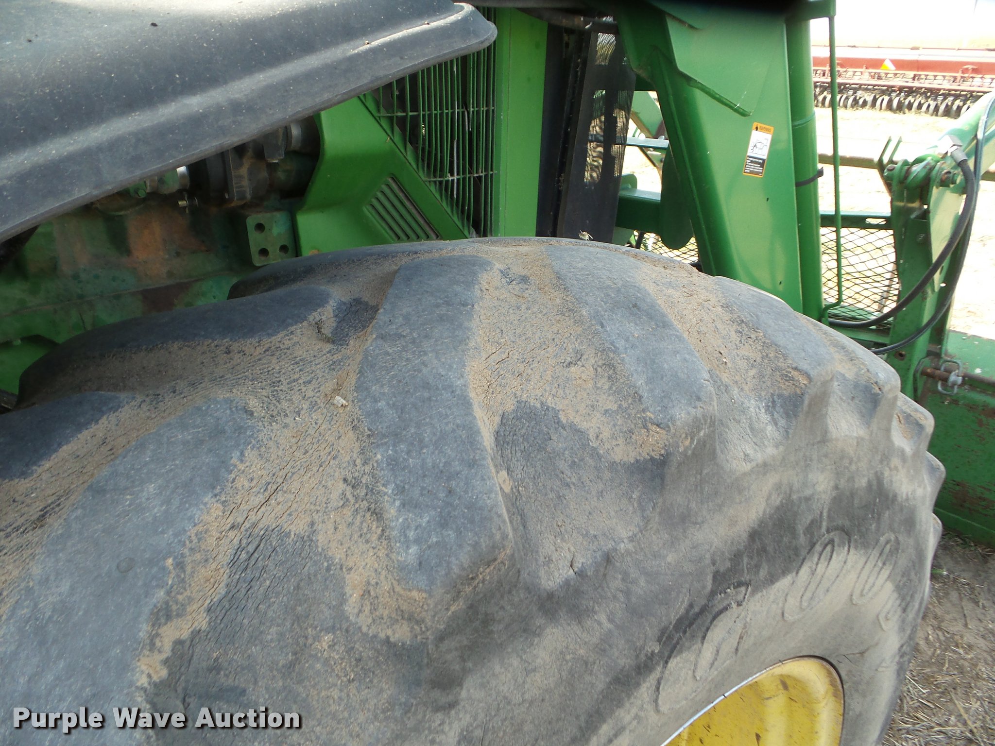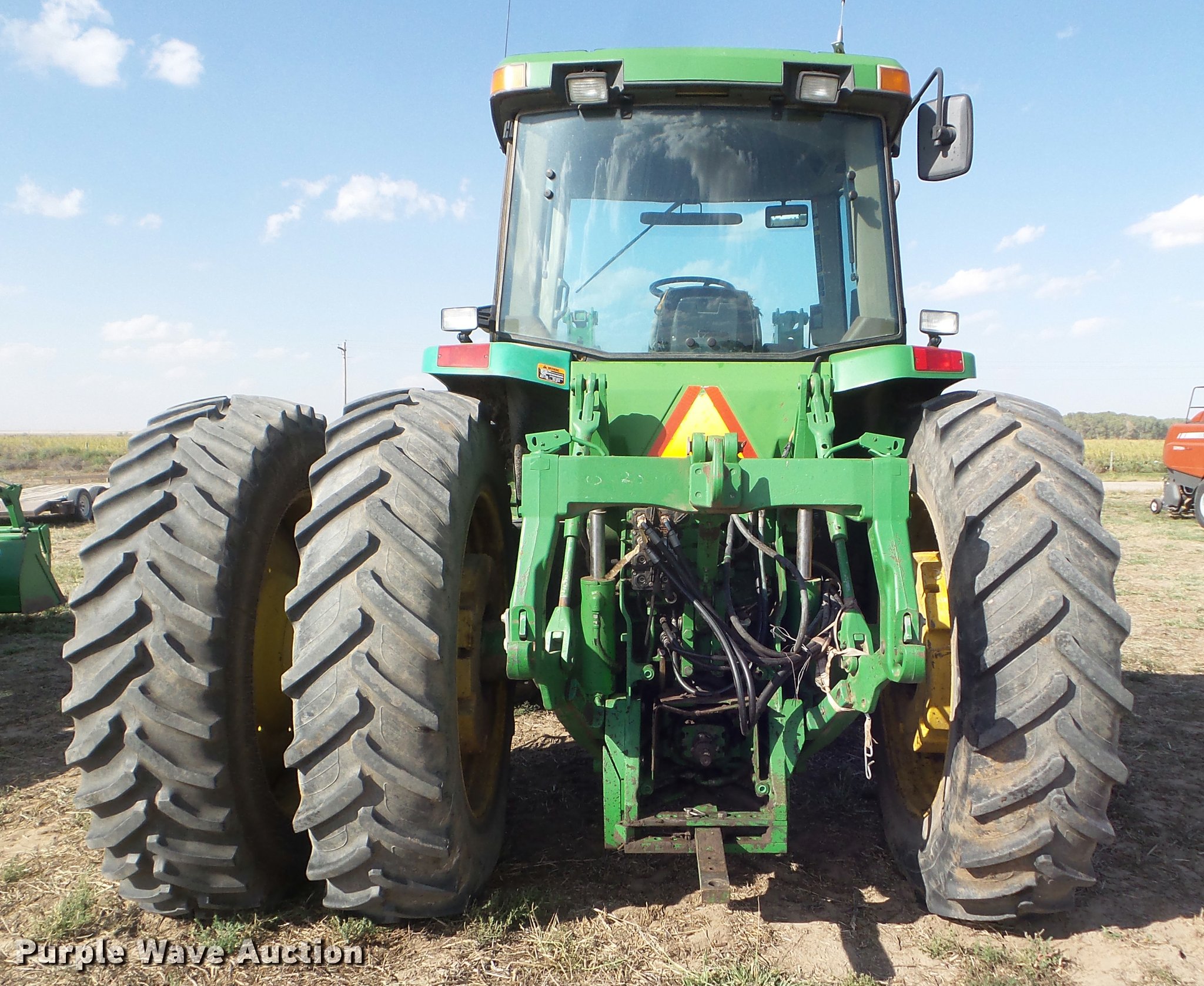 Purple Wave is selling a used Tractor in Kansas. This item is a 1995 John Deere 8300 MFWD tractor with the following: 1,630 hours on meter, Hours may vary, unit in use, John Deere 6076HRW six cylinder diesel engine, Serial RG6076H533395, Powershift transmission, 14F-3R gears, AC and heat, Tilt steering wheel, AM/FM, Suspension seat, Visor, John Deere 840 loader, Quick attach, 97"W grapple bucket, Joystick controls, Serial W00840X003157, Three point, Top link, Quick attach, Large 1000 PTO, (4) rear hydraulic remote sets, (4) wheel weights, 385/85R34 front tires, 480/80R46 dual rear tires, Unattached right rear dual tires included, Serial RW8300P001108
