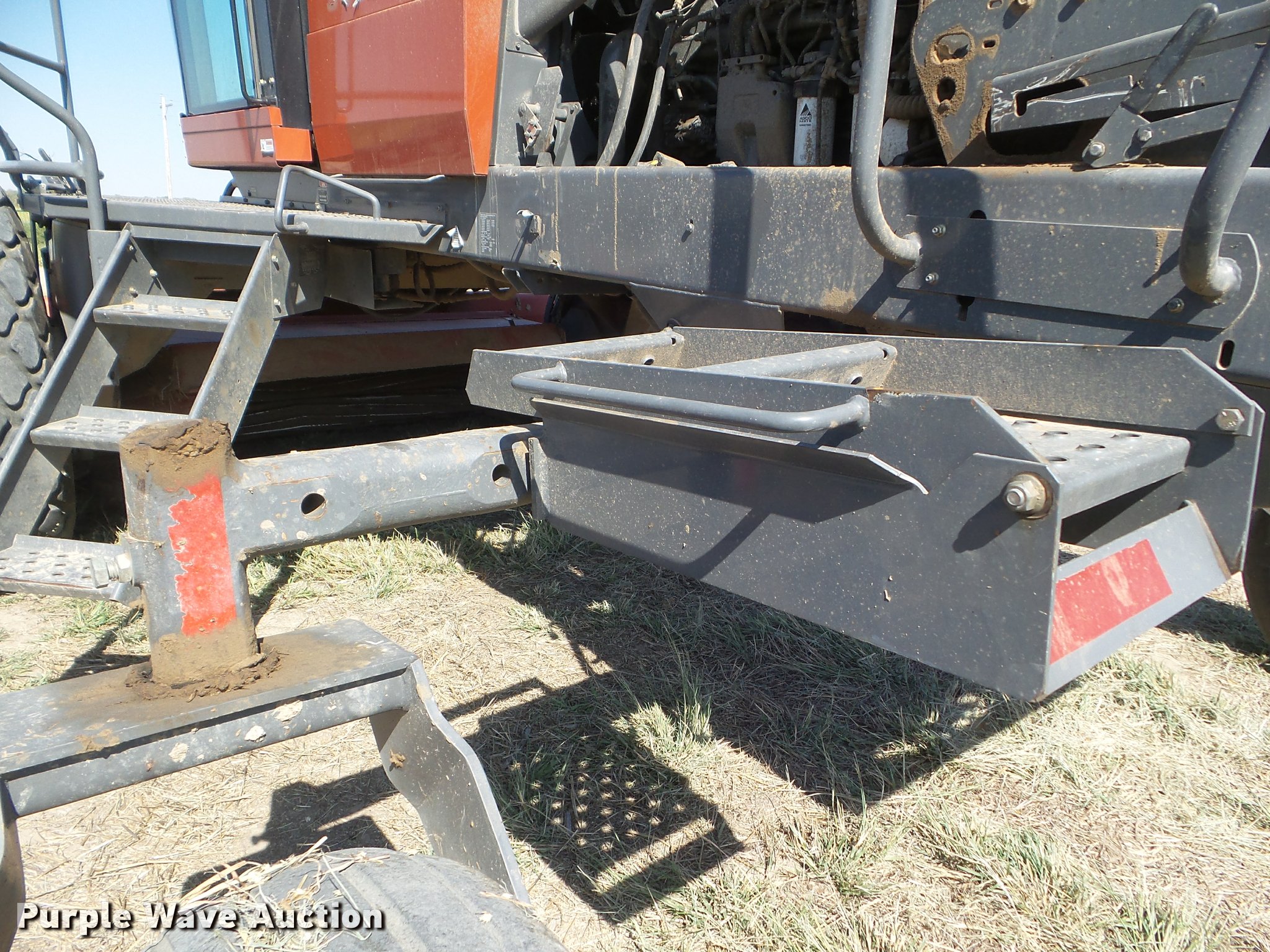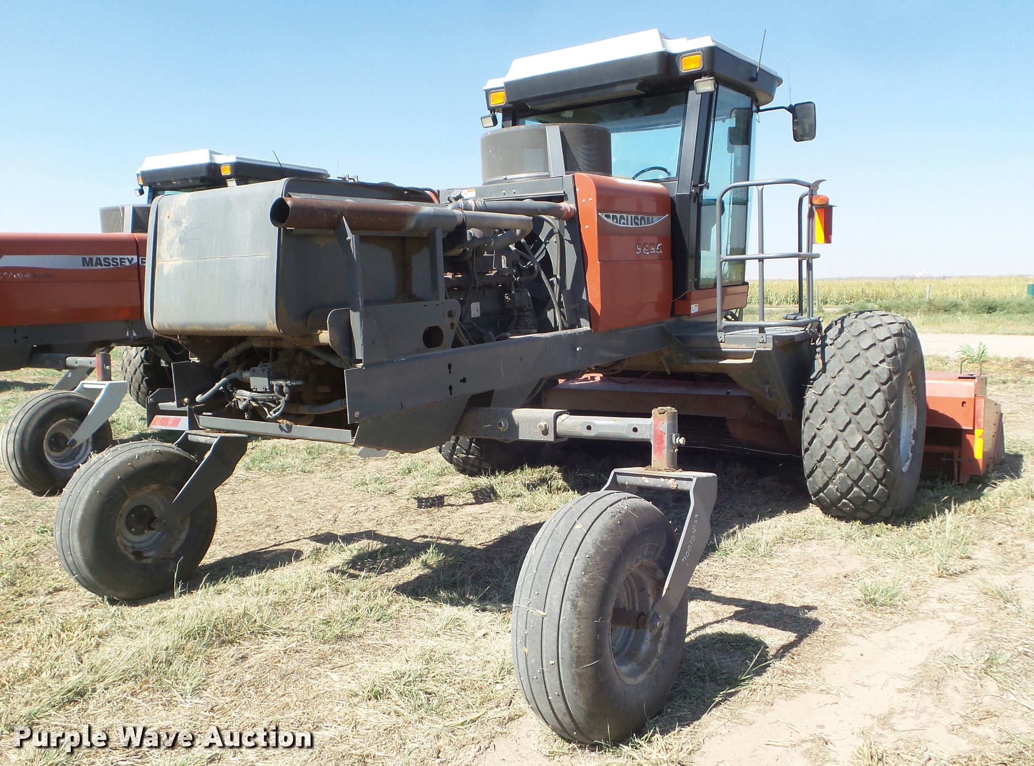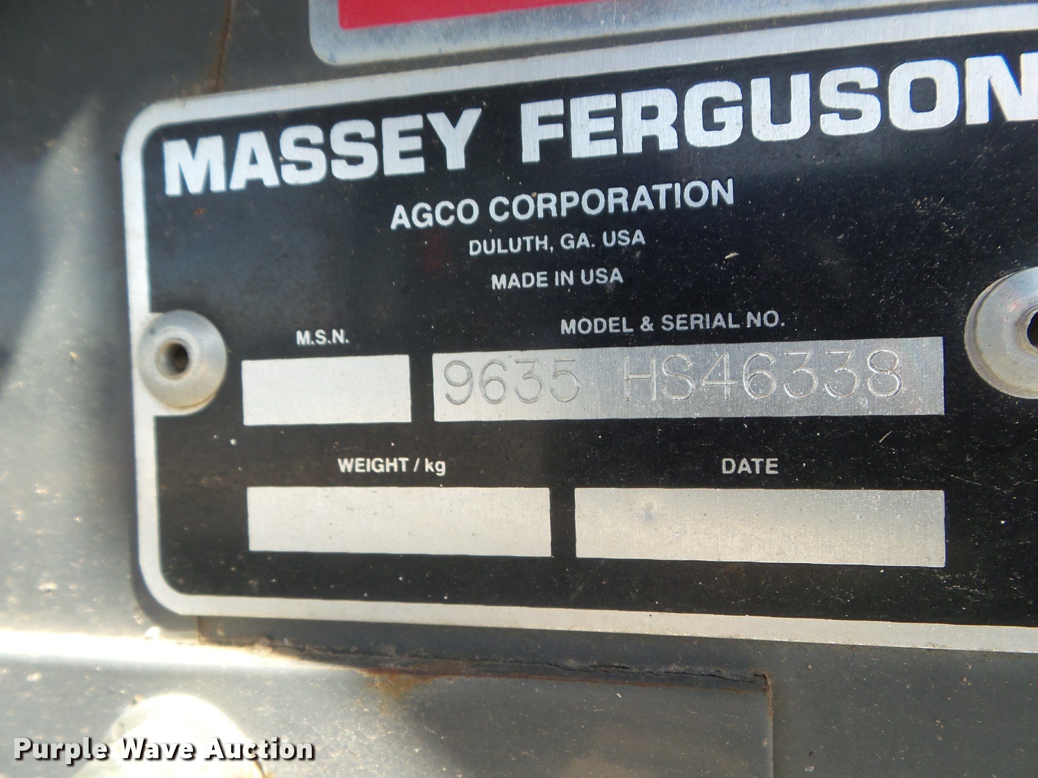 Purple Wave is selling a used Windrower Self Propelled in Kansas. This item is a 2007 Massey-Ferguson 9635 self-propelled windrower with the following: 3,985 hours on meter, Sisu 66 6.6L six cylinder turbo diesel engine, Serial S17280, Hydrostatic transmission, AC and heat, Tilt steering wheel, AM/FM/CD, Suspension seat, Instructor's seat, Work lights, AGCO 9175 disc head, 15'W, Hydraulic head tilt, Hydraulic fore/aft, Steel/steel conditioners, Serial HS05370, 23.1-26 front tires, 14L-16.1 rear tires, Engine cover included, CB radio not included, Serial HS46338