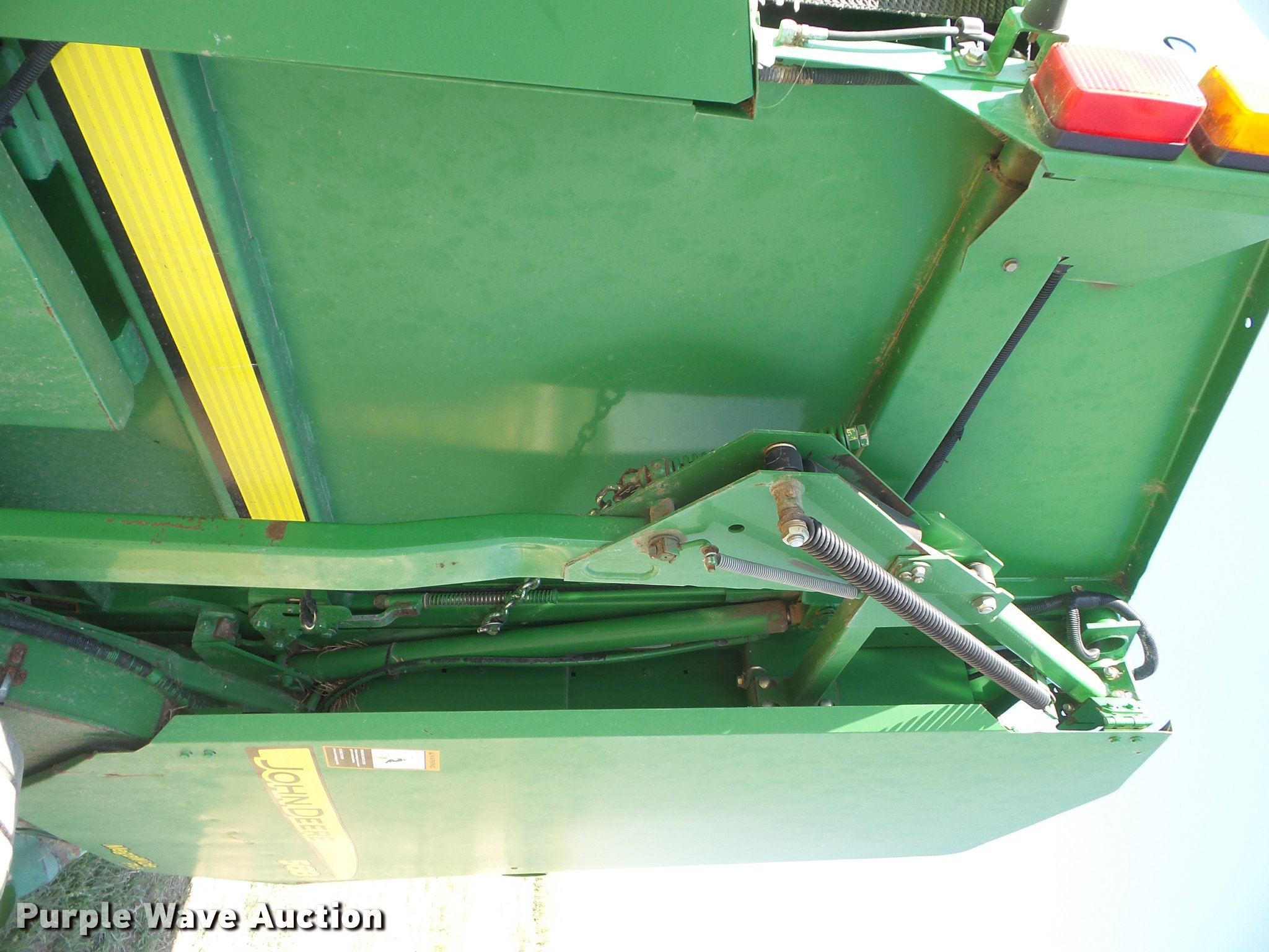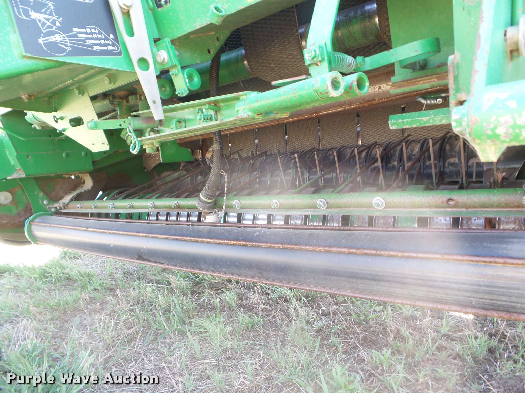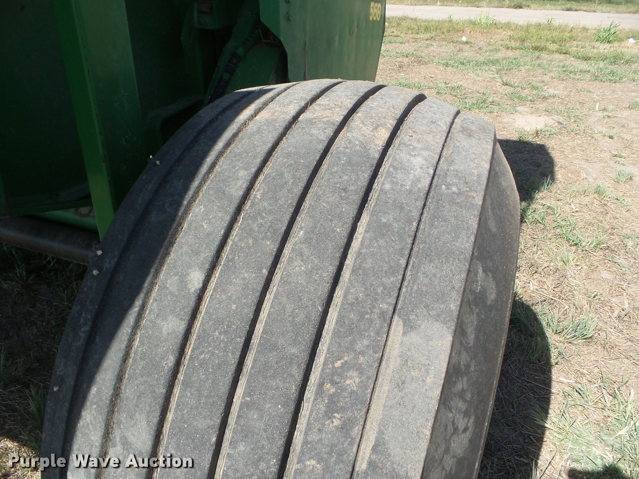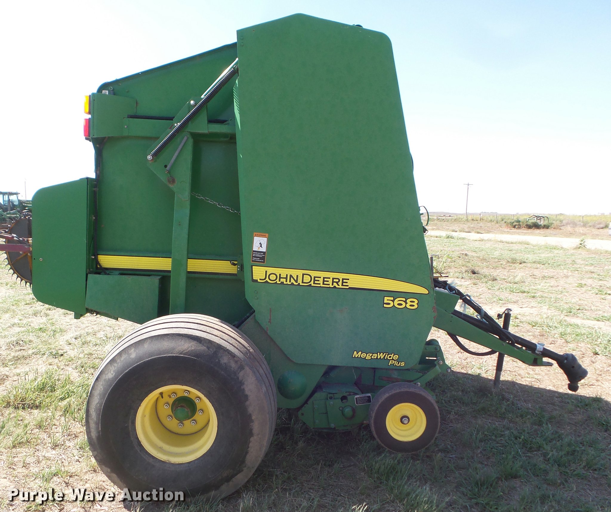 Purple Wave is selling a used Round Baler in Kansas. This item is a 2007 John Deere 568 Mega Wide Plus round baler with the following: 18,930 bales on counter, 6'W pickup, Hydraulic pickup lift, Twin twine tie or net-wrap, Bale kicker, Large 1000 PTO, Pin hitch, 21.5L-16.1 tires, Serial E00568X336604