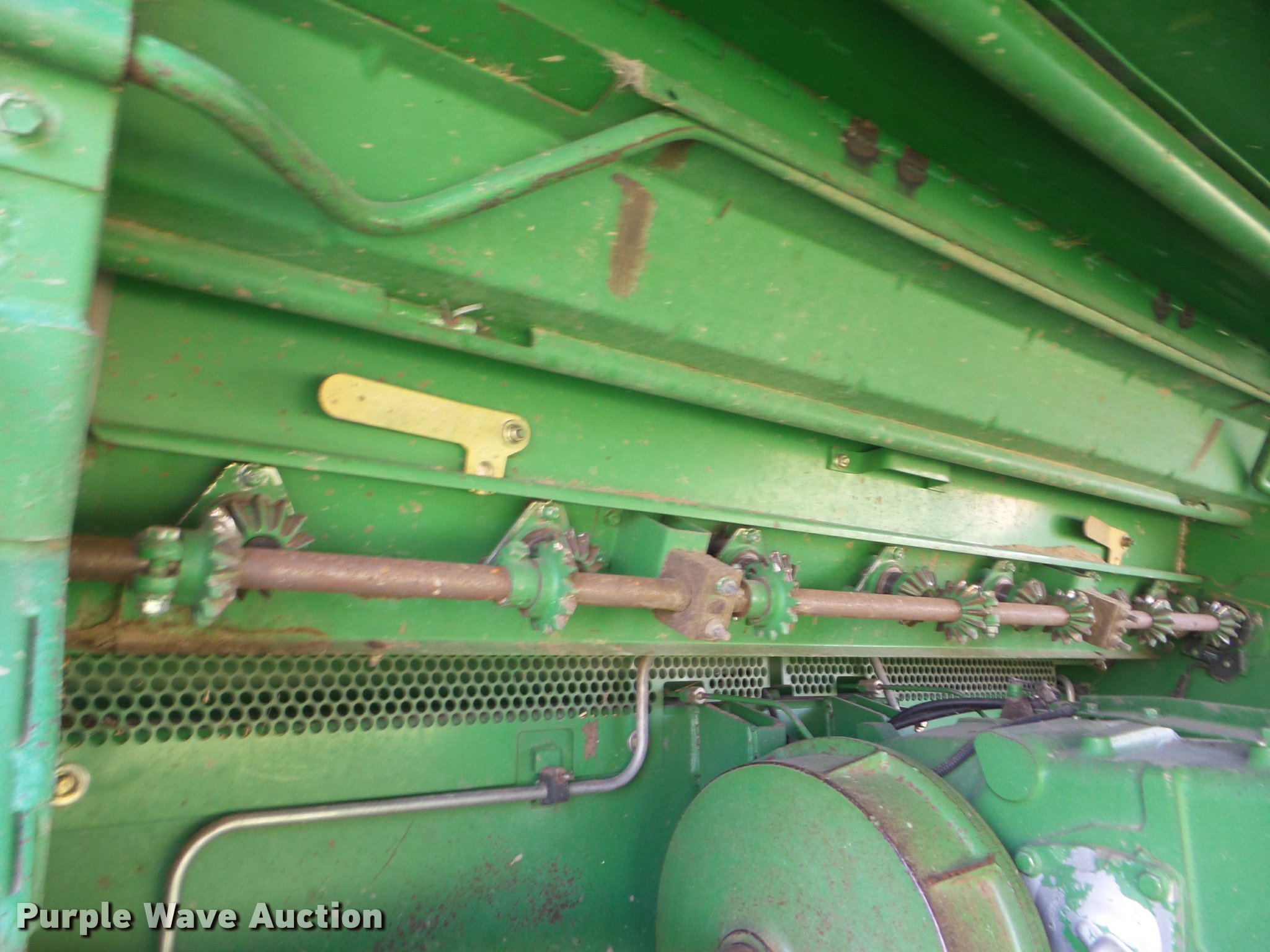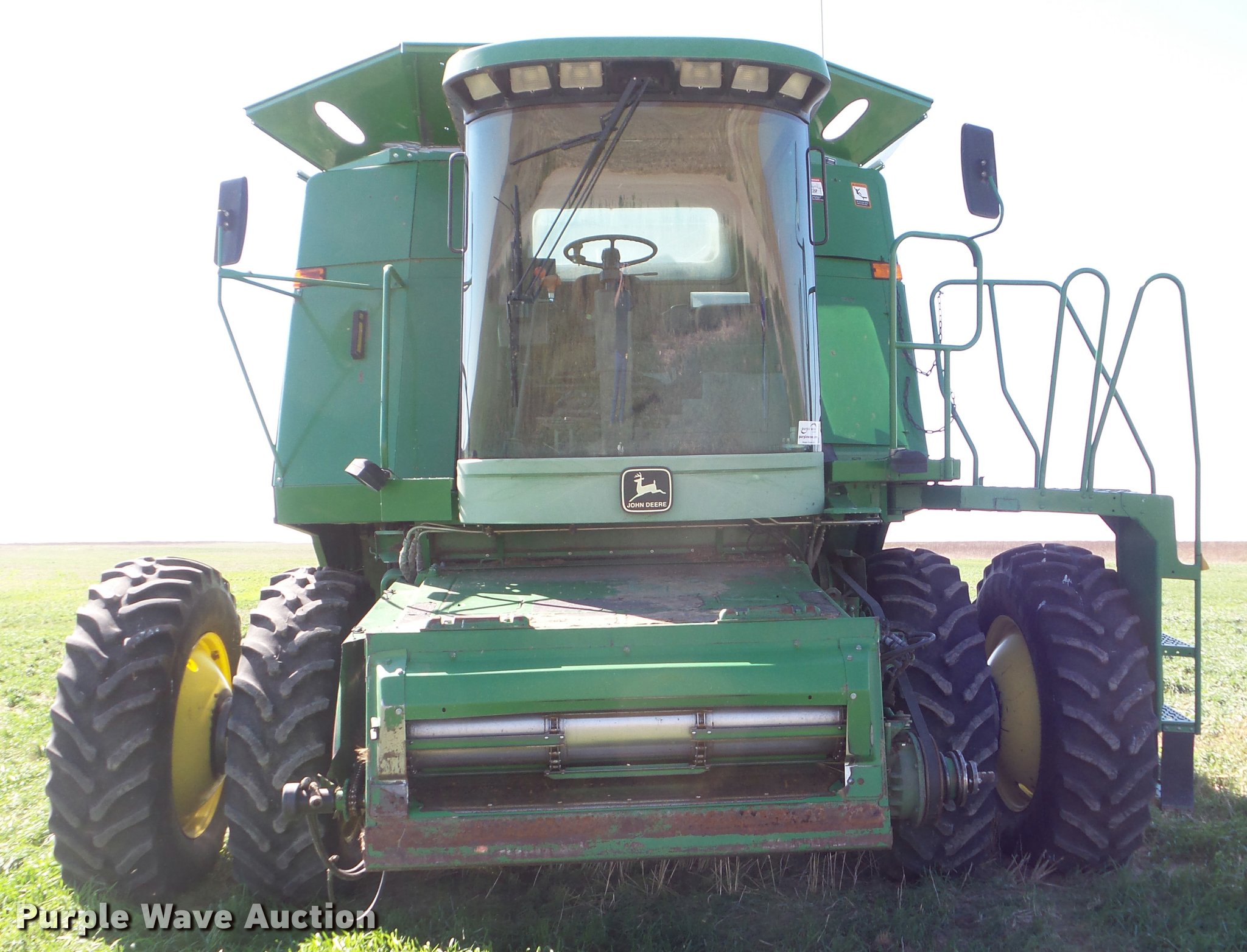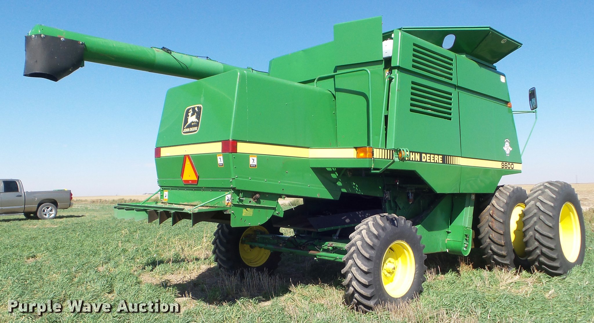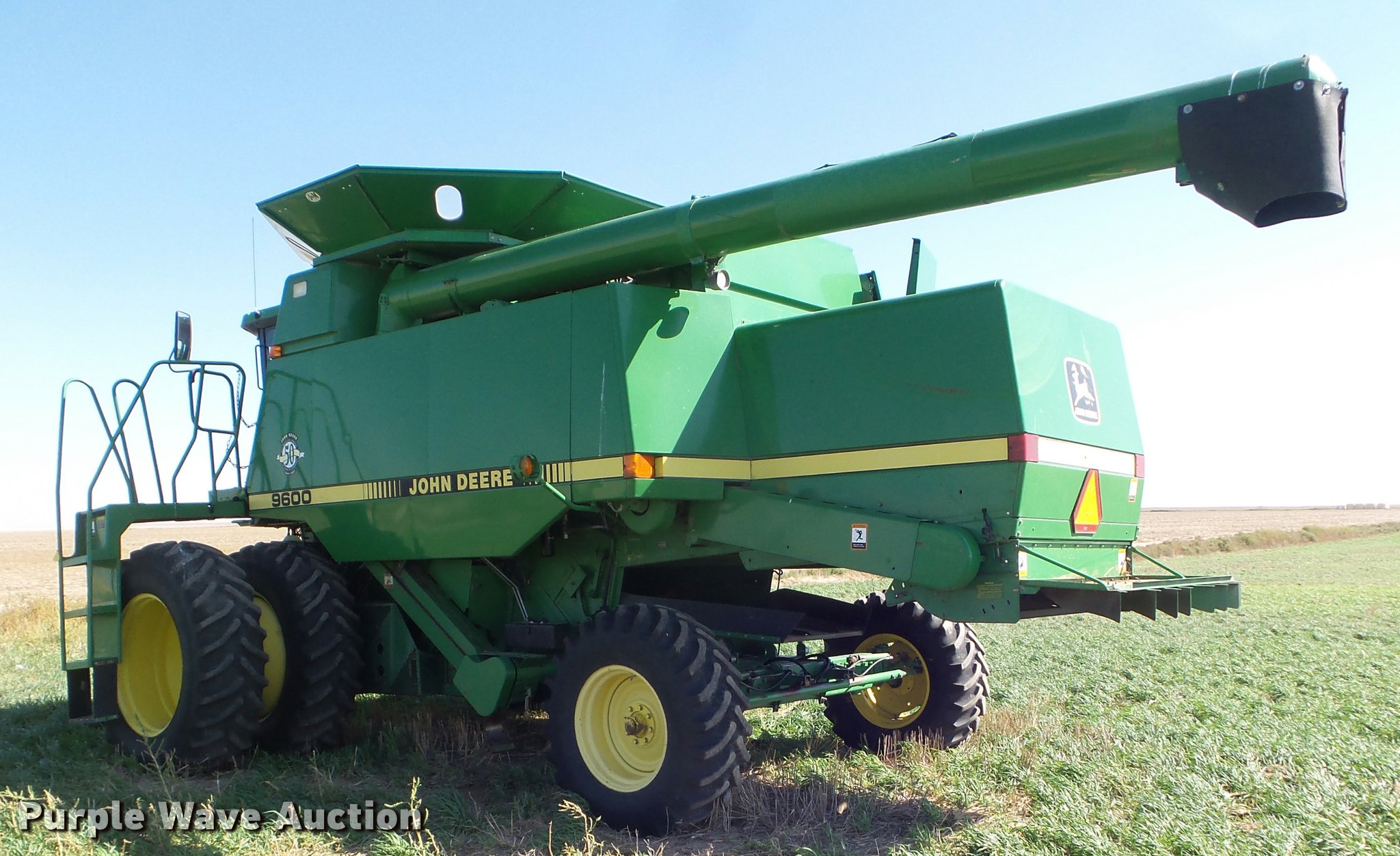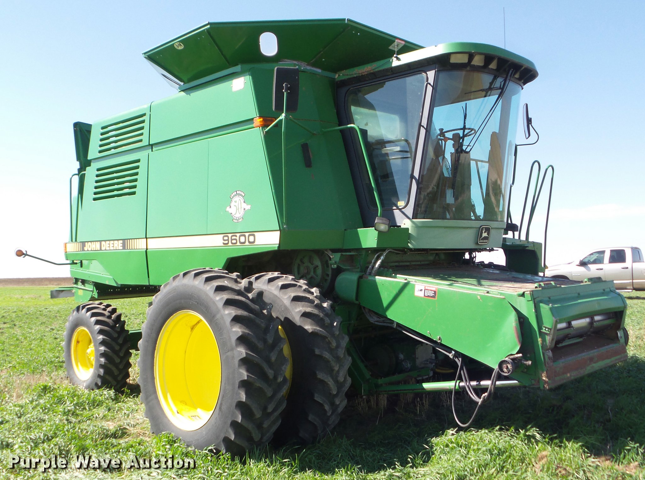 Purple Wave is selling a used Combine in Kansas. This item is a 1997 John Deere 9600 combine with the following: 4,694 engine hours on meter, 3,314 separator hours on meter, John Deere 6076HH03Y six cylinder turbo diesel engine, Serial RG6076H594493, Hydrostatic transmission, 3F-3R gears, Feederhouse, Variable speed, Reverser, AC and heat, Tilt steering wheel, AM/FM, Air suspension seat, Instructor's seat, Straw chopper, Bin extensions, 20'L unloading auger, 480/80R38 dual front tires, 16.9-26 rear tires, Operators manual, Front axle repaired, CB radio not included, Serial H09600X673459