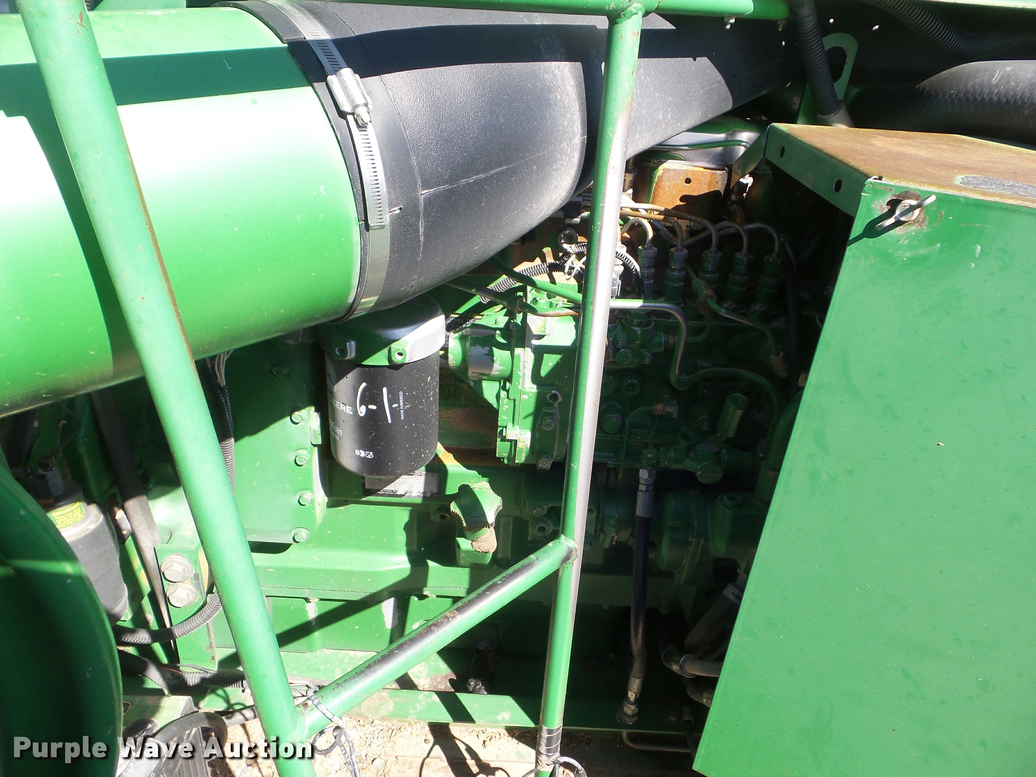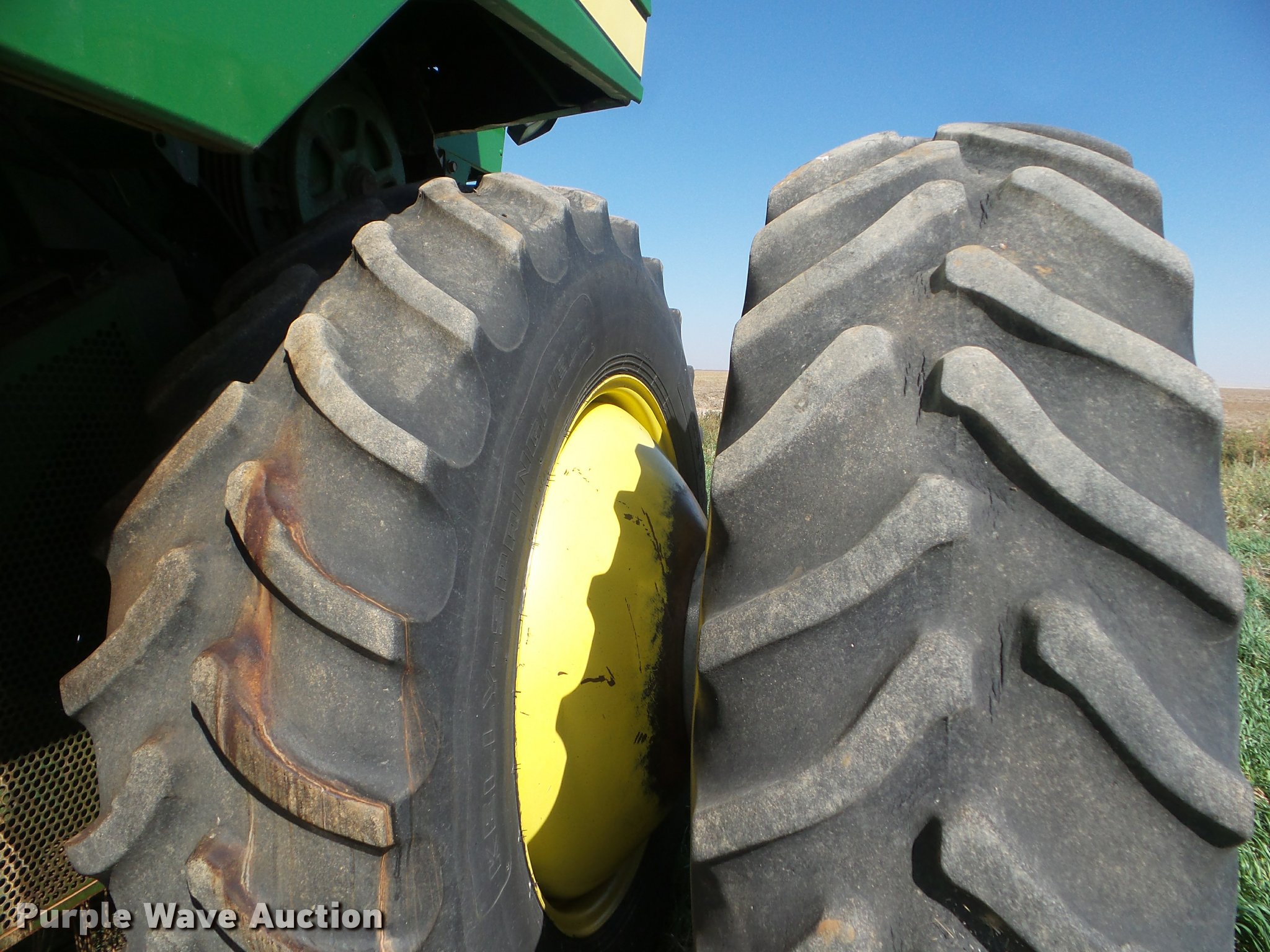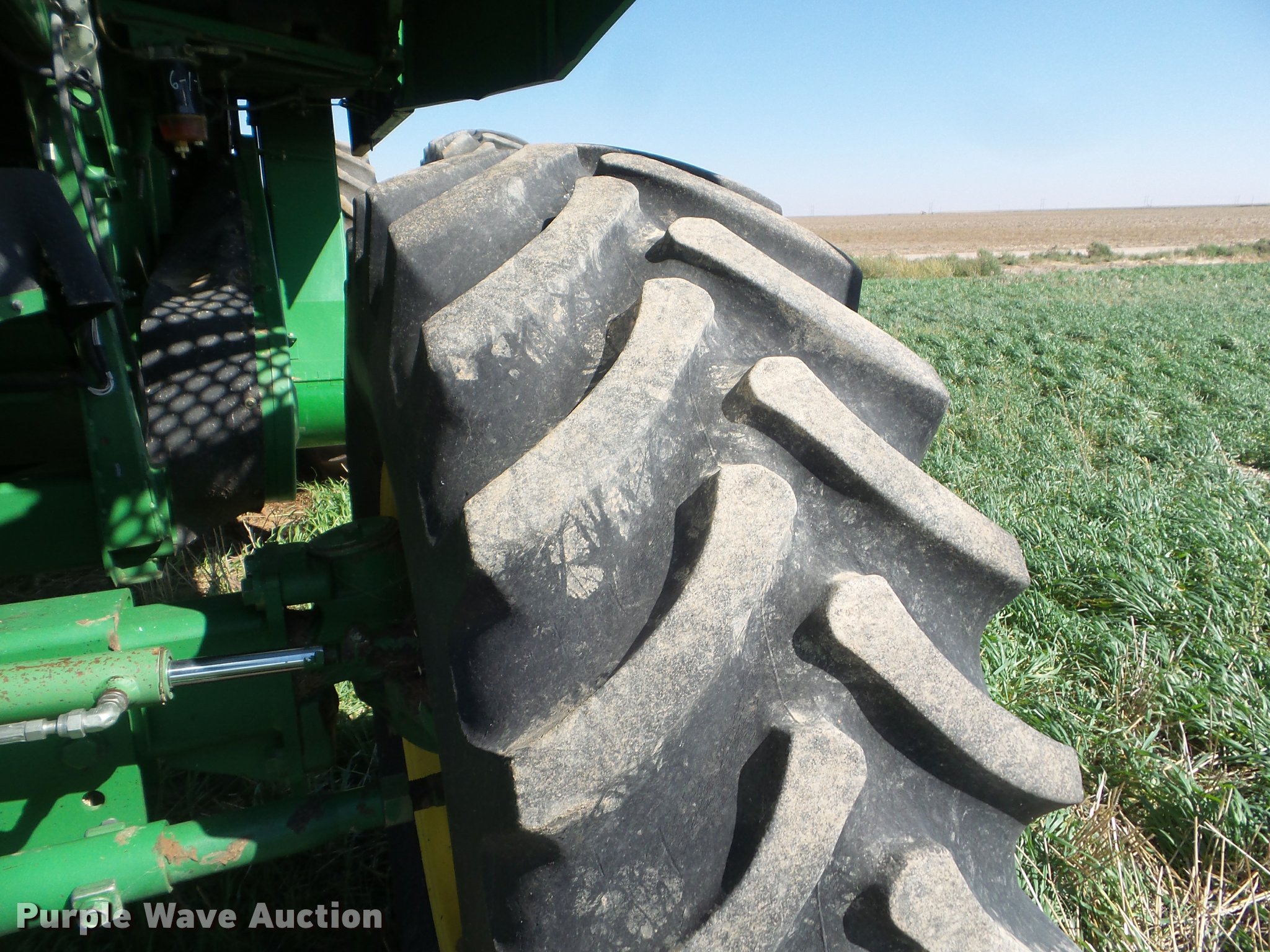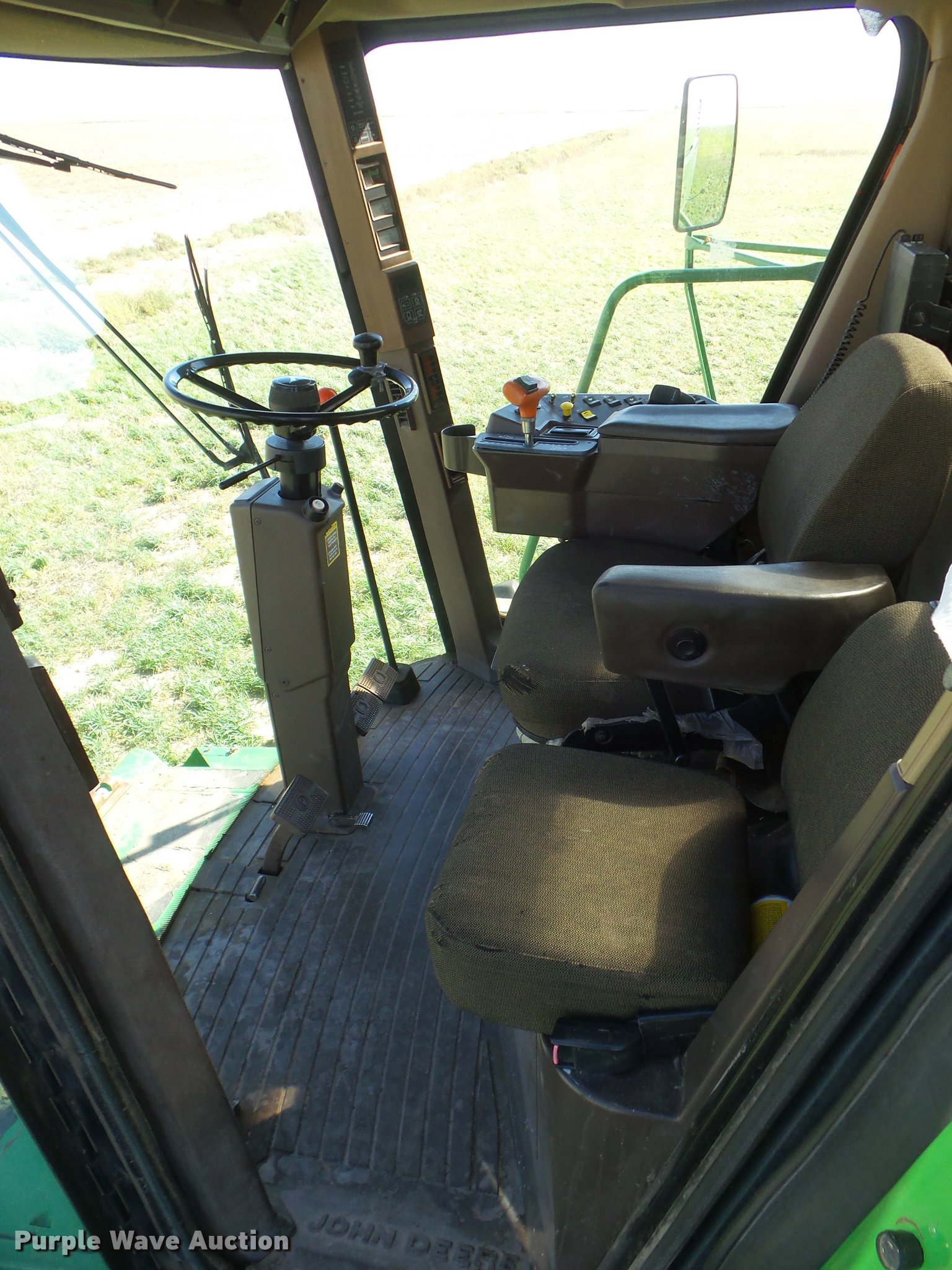 Purple Wave is selling a used Combine in Kansas. This item is a 1997 John Deere 9600 combine with the following: 4,694 engine hours on meter, 3,314 separator hours on meter, John Deere 6076HH03Y six cylinder turbo diesel engine, Serial RG6076H594493, Hydrostatic transmission, 3F-3R gears, Feederhouse, Variable speed, Reverser, AC and heat, Tilt steering wheel, AM/FM, Air suspension seat, Instructor's seat, Straw chopper, Bin extensions, 20'L unloading auger, 480/80R38 dual front tires, 16.9-26 rear tires, Operators manual, Front axle repaired, CB radio not included, Serial H09600X673459