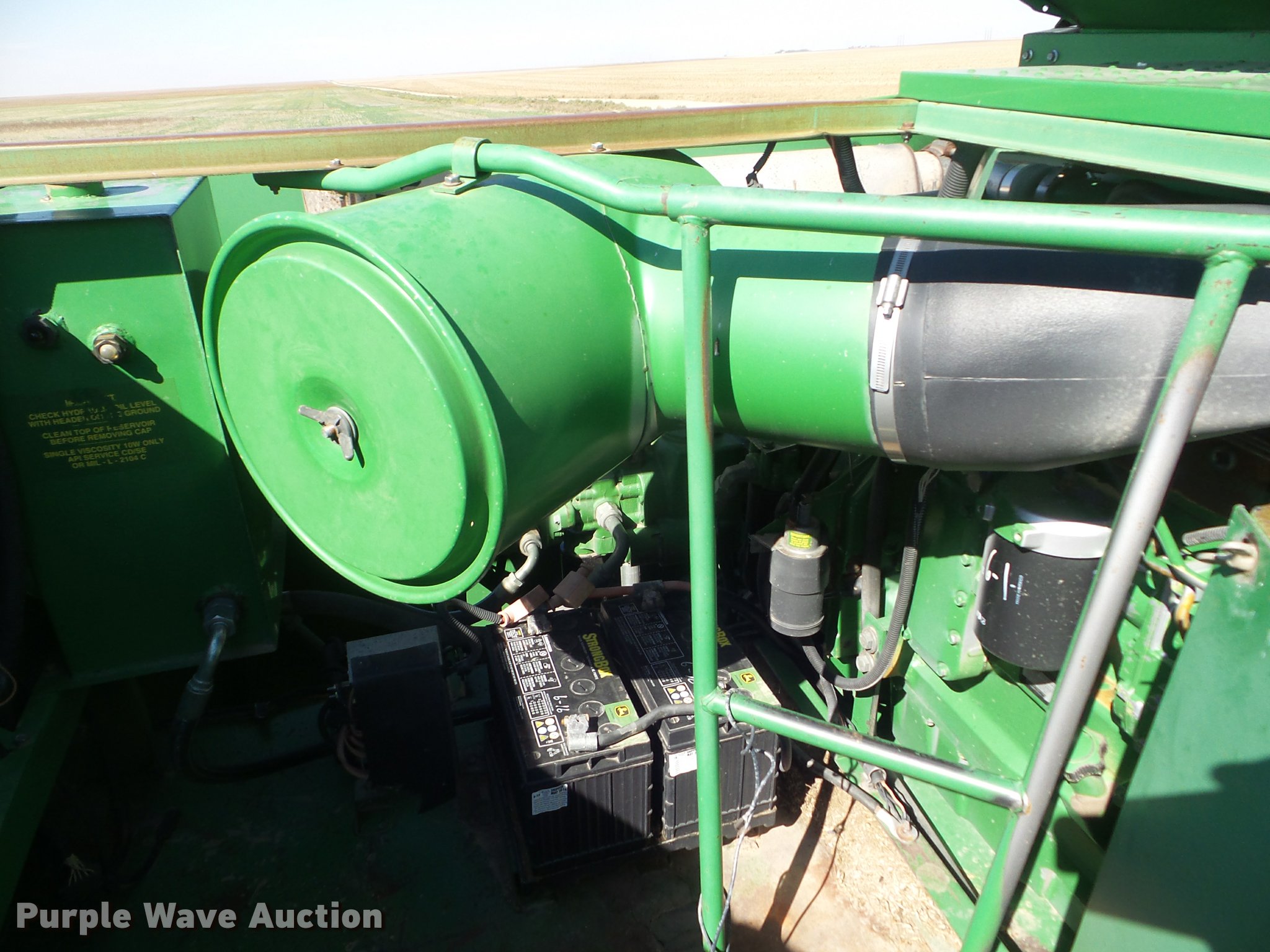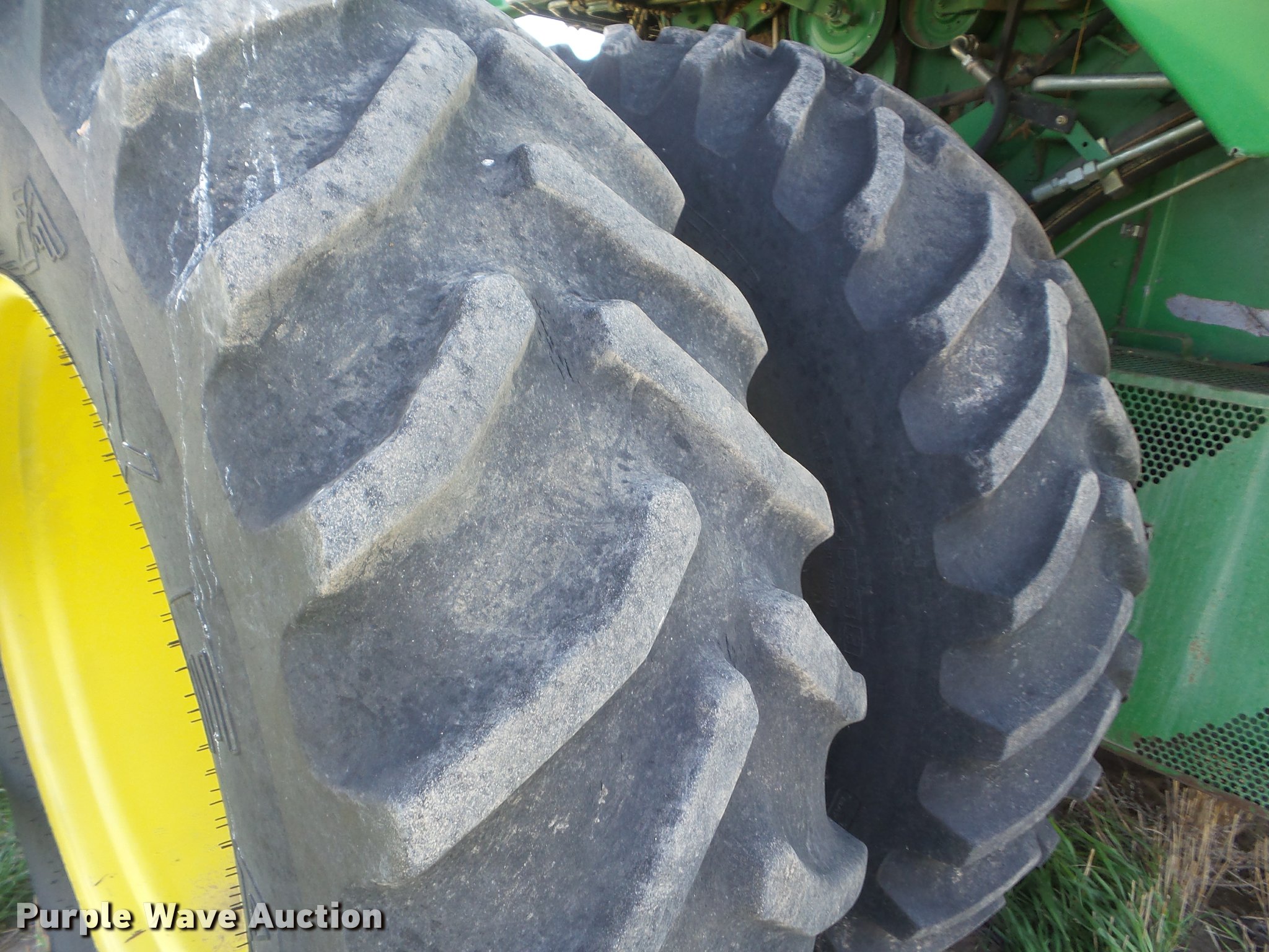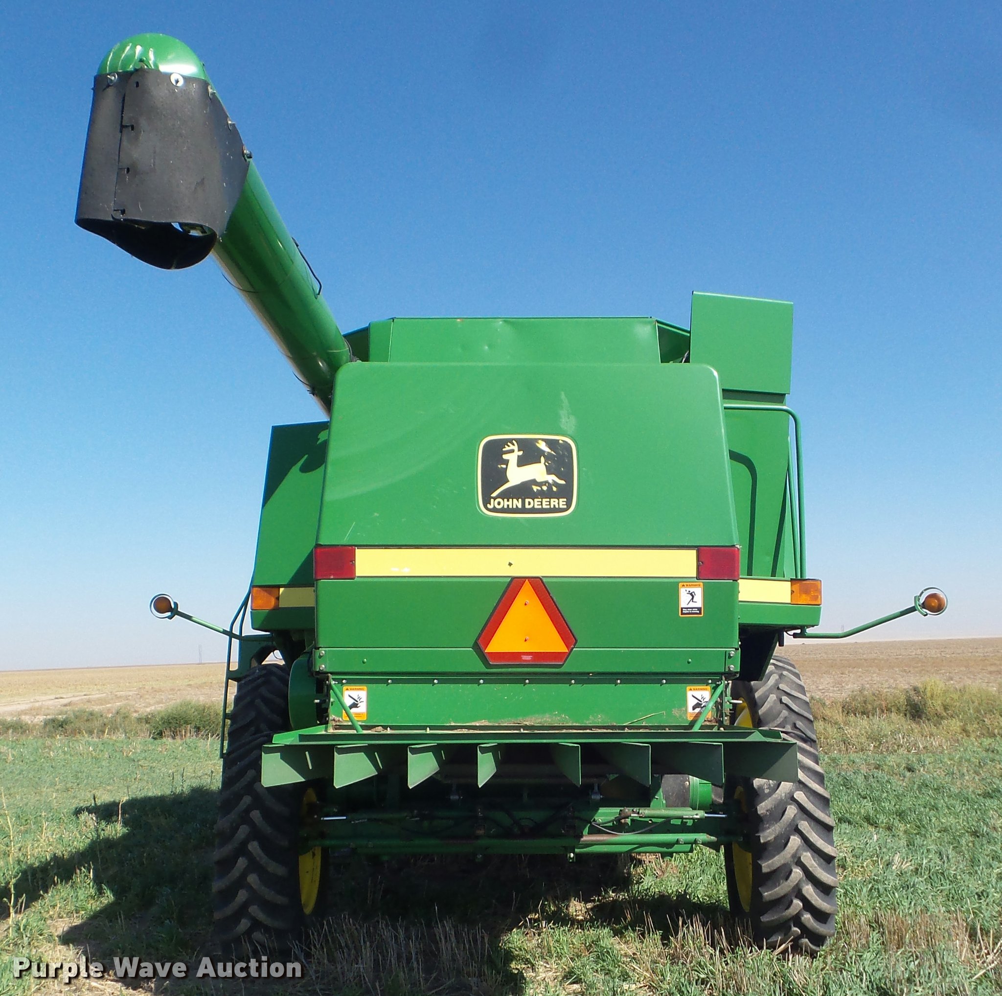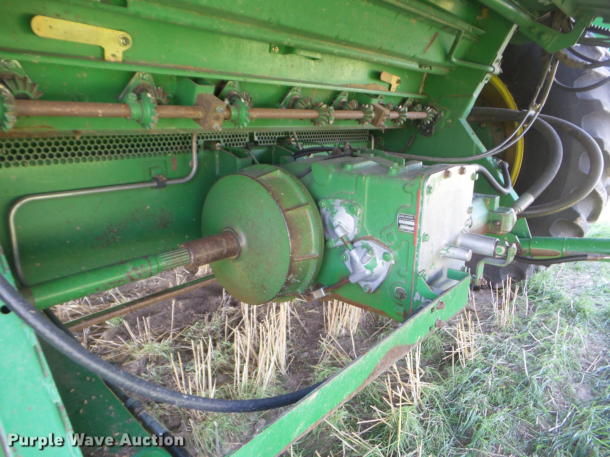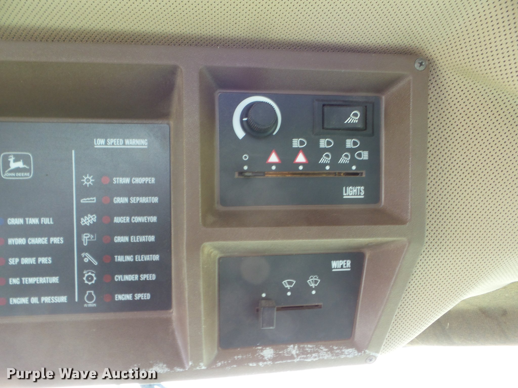 Purple Wave is selling a used Combine in Kansas. This item is a 1997 John Deere 9600 combine with the following: 4,694 engine hours on meter, 3,314 separator hours on meter, John Deere 6076HH03Y six cylinder turbo diesel engine, Serial RG6076H594493, Hydrostatic transmission, 3F-3R gears, Feederhouse, Variable speed, Reverser, AC and heat, Tilt steering wheel, AM/FM, Air suspension seat, Instructor's seat, Straw chopper, Bin extensions, 20'L unloading auger, 480/80R38 dual front tires, 16.9-26 rear tires, Operators manual, Front axle repaired, CB radio not included, Serial H09600X673459