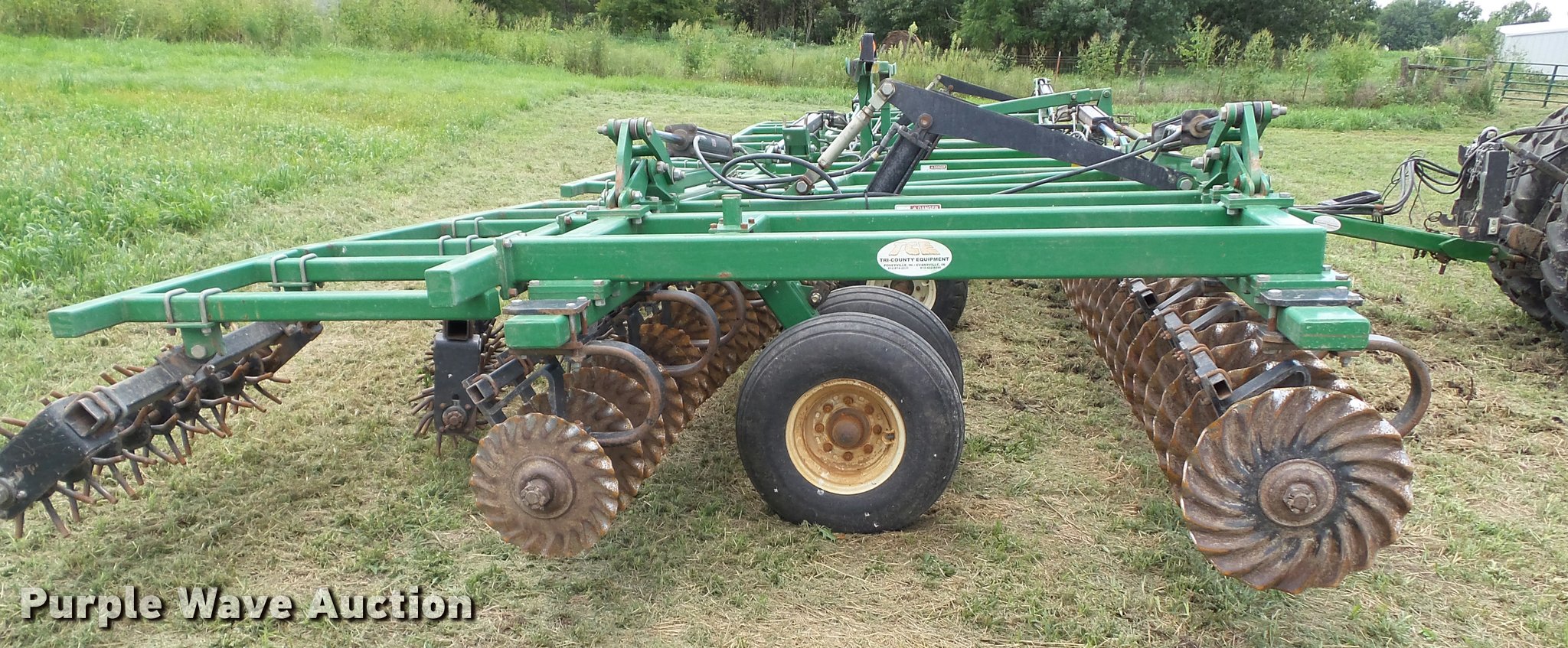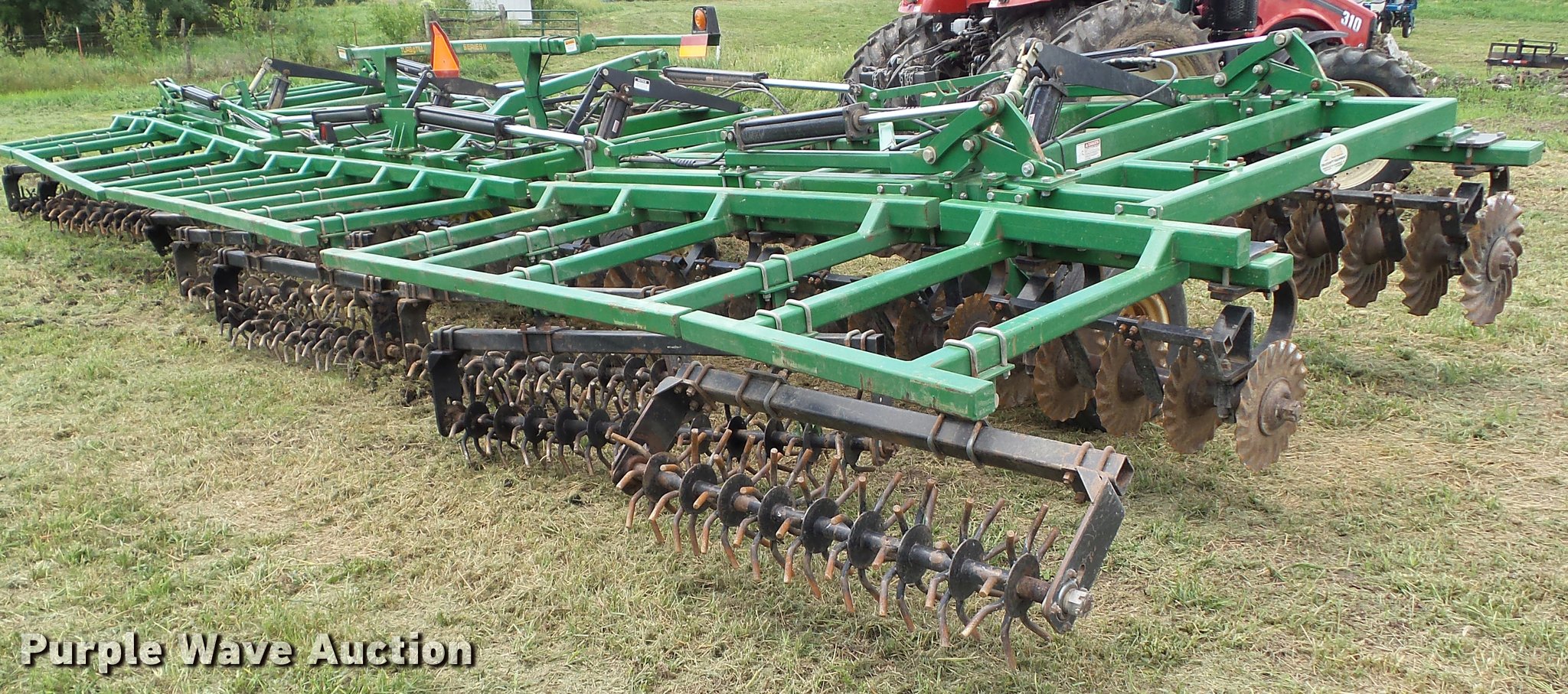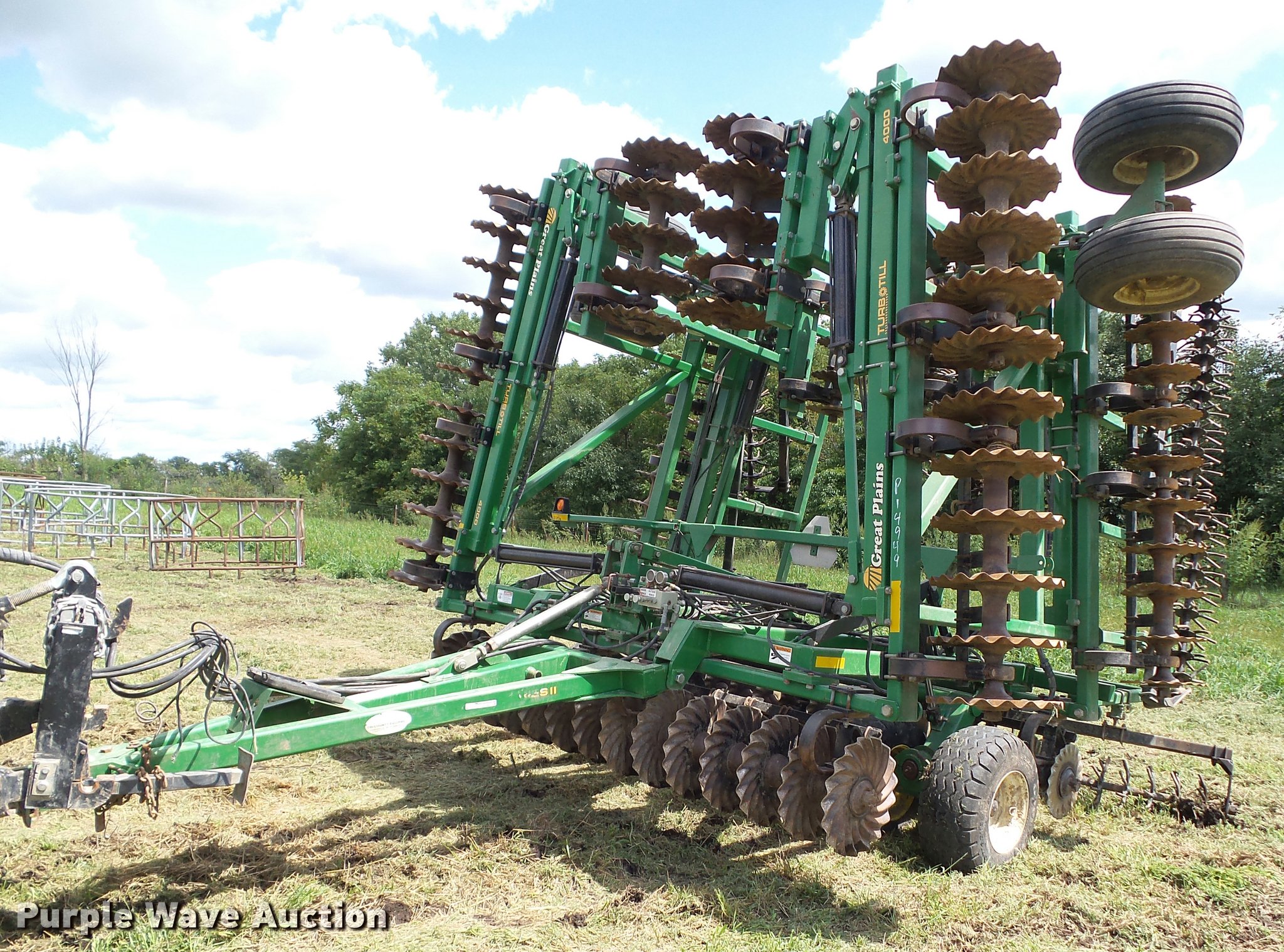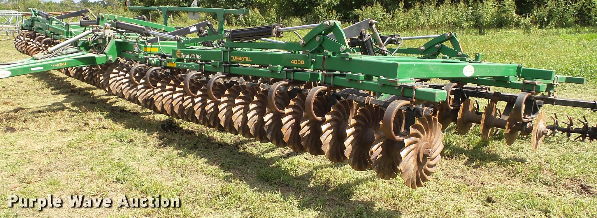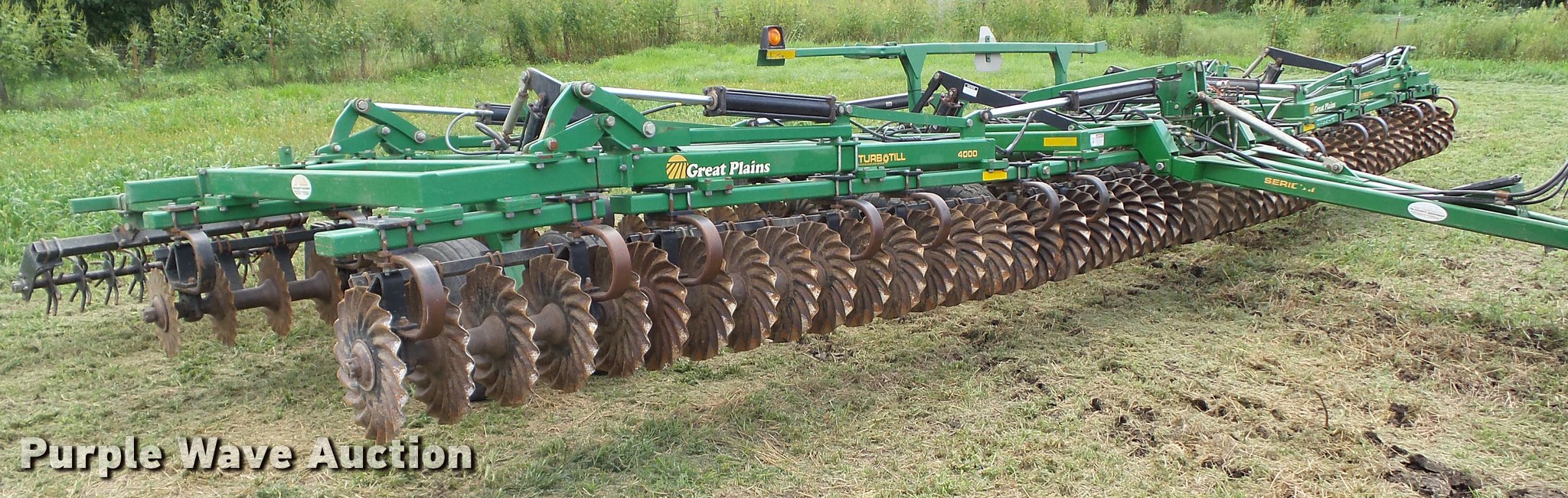 Purple Wave is selling a used Vertical Tillage in Iowa. This item is a 2010 Great Plains 4000TT vertical tillage with the following: 40'W, 23" diameter front blades, 18" diameter rear blades, 10" spacing, Disk scrapers, Spike tooth harrow, Rolling pickers/treader, Hydraulic lift and fold, Transport lights, Pin/clevis hitch, 380/55R16.5 tires, Serial 2843NN