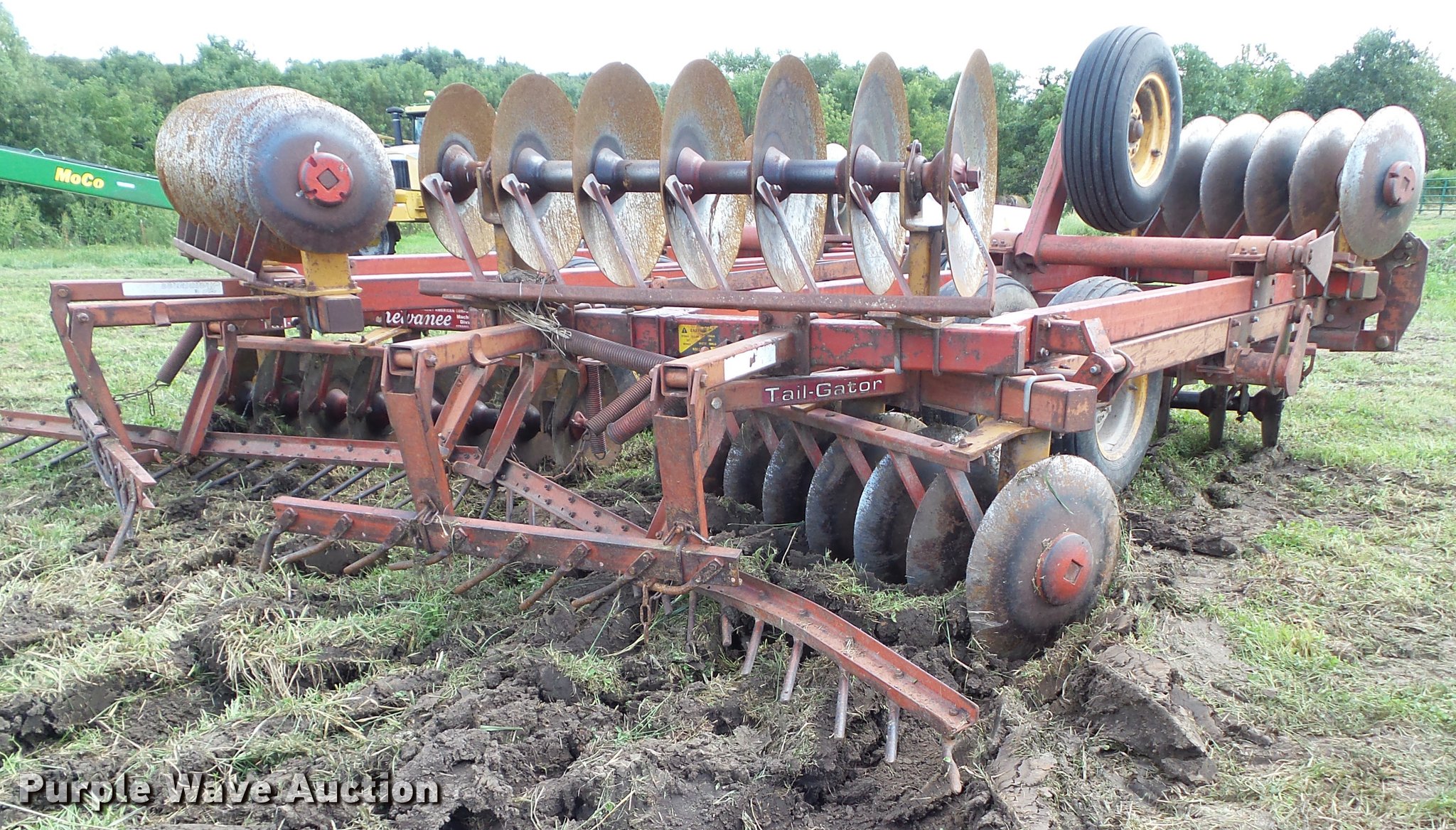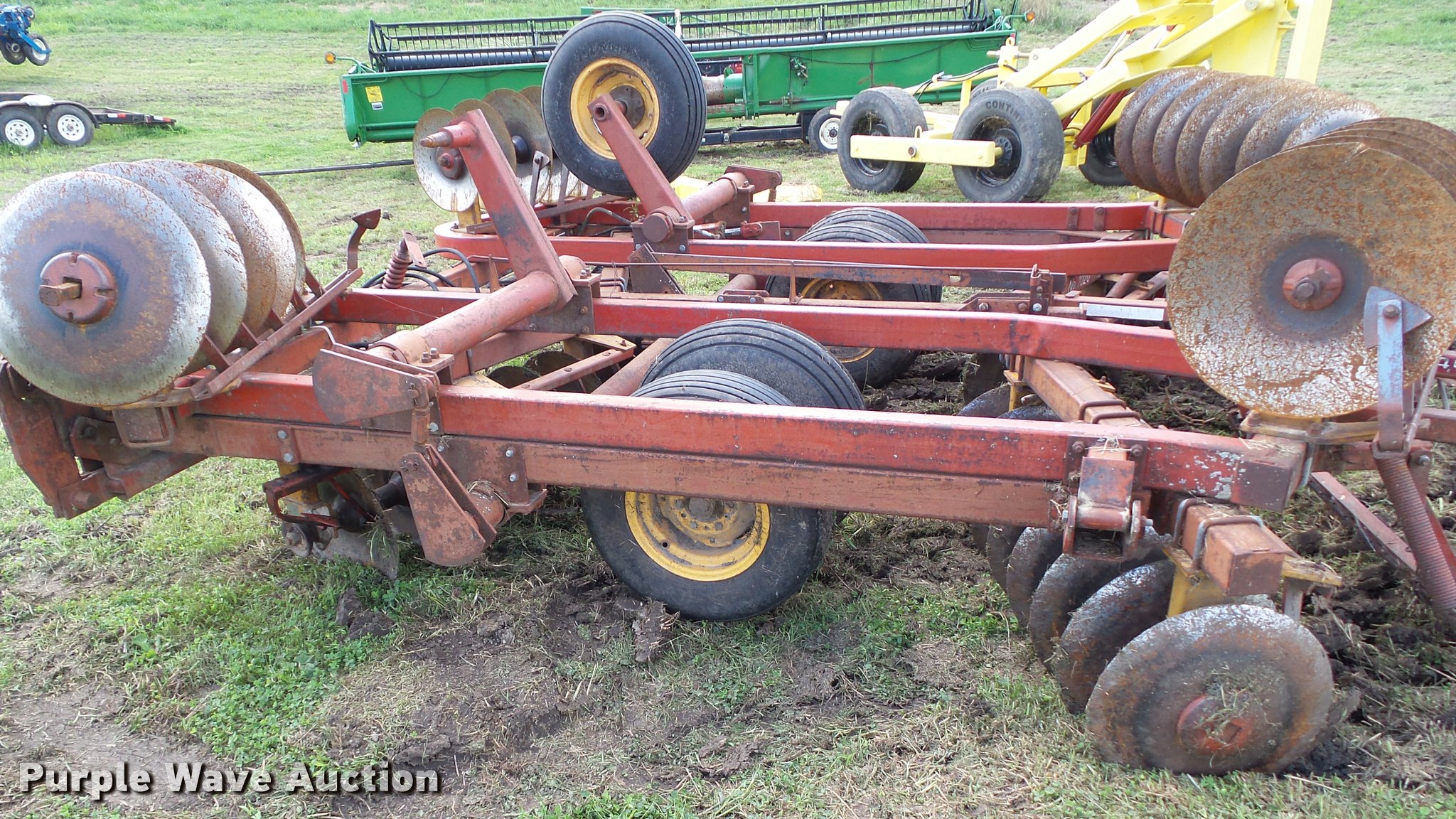 Purple Wave is selling a used Disk in Iowa. This item is a Kewanee 1020 disk with the following: 21" disks, Disk scrapers, Spike harrow, Hydraulic fold, Manual leveler, Draw bar hitch