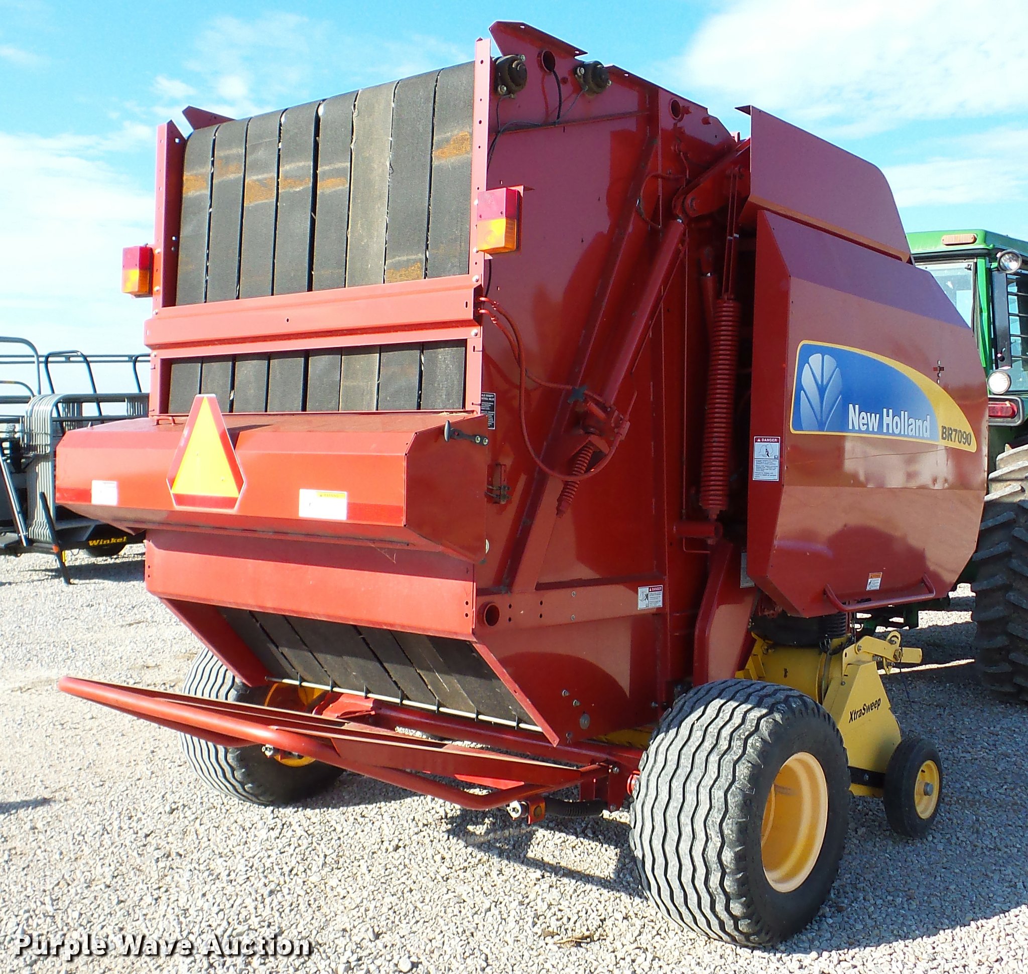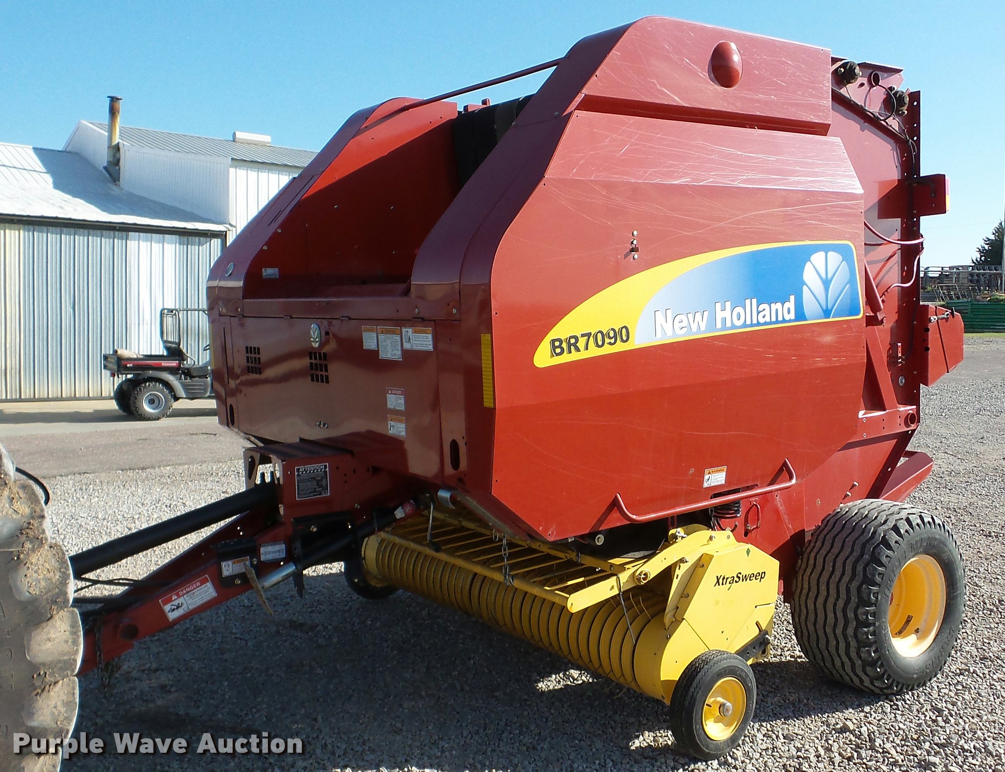 Purple Wave is selling a used Round Baler in Kansas. This item is a 2009 New Holland BR7090 round baler with the following: 1,833 bales on counter, 5' x 6' bale capacity, 81.6"W pickup, Hydarulic pickup lift, 4.80-8 gauge wheels, Net-wrap, Stuffer, New Holland Bale Command Plus monitor, Large 1000 PTO, Pin hitch, 18L-16.1 tires, 10 ply, Serial Y9N042840
