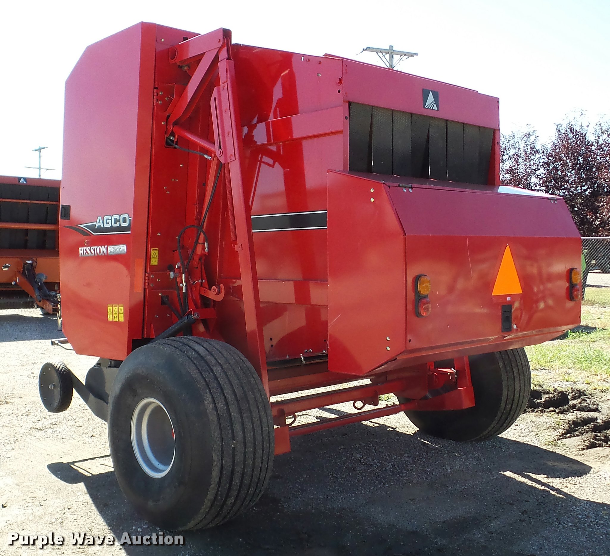 Purple Wave is selling a used Round Baler in Kansas. This item is a 2010 AGCO Hesston 2856A round baler with the following: Approx. 5,000 bales, 5' x 6' bale capacity, 7'W pickup, Hydraulic pickup lift, Gauge wheels, Twine tie or net-wrap, Monitor, Transport lights, Large 1000 PTO, Pin hitch, 21.5L-16.1 tires, Serial AGCG2856AAHR13159