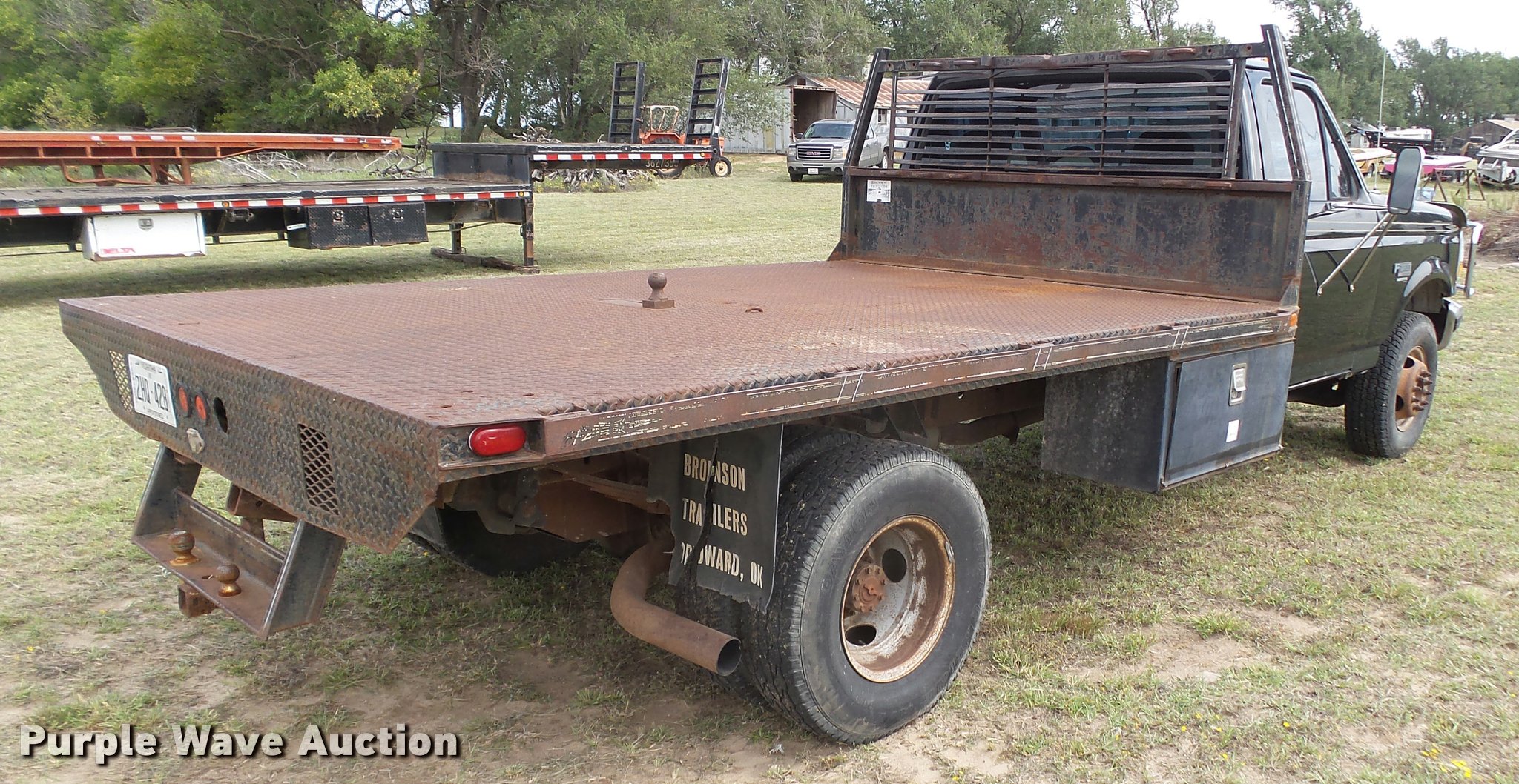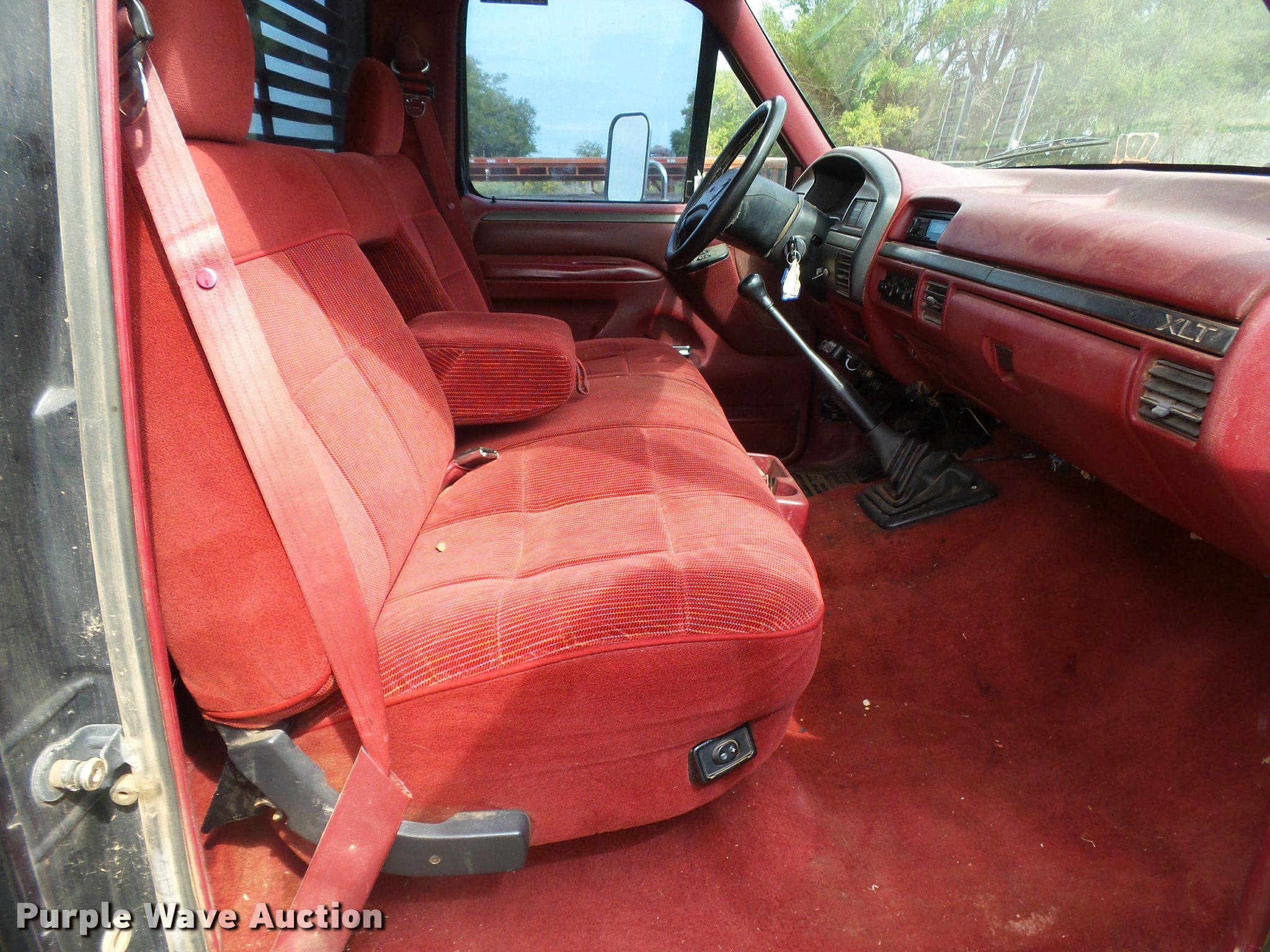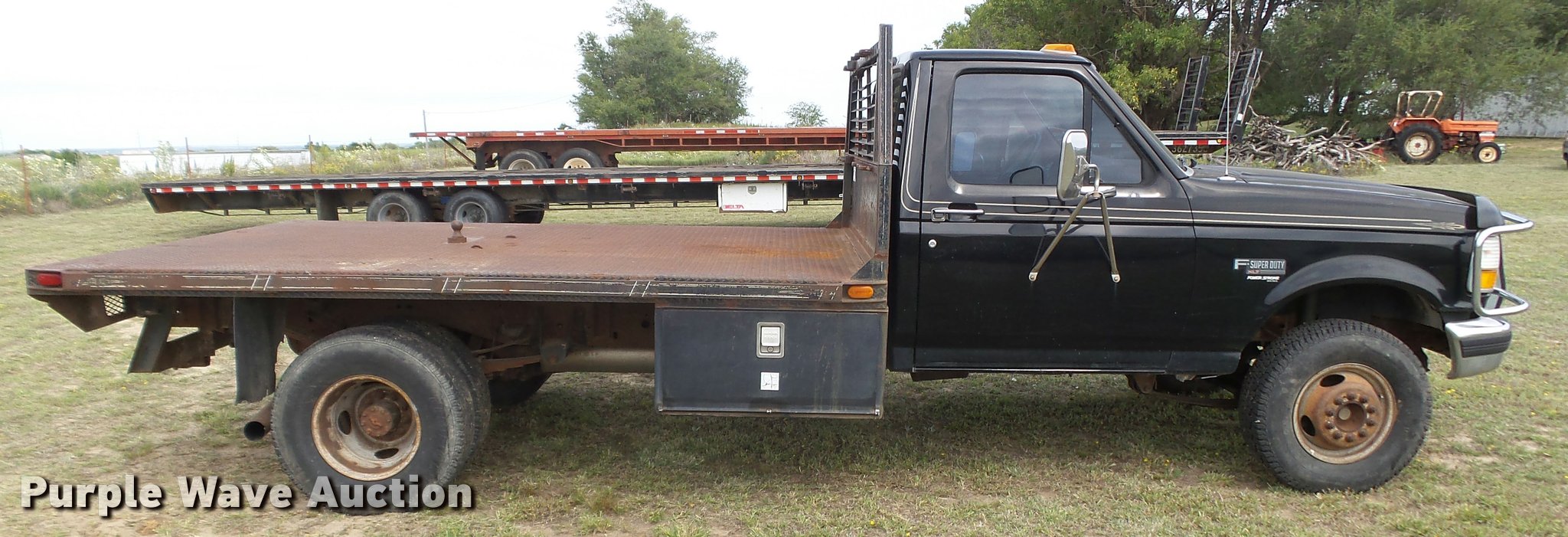 Purple Wave is selling a used Flat Bed Truck in Oklahoma. This item is a 1995 Ford F450 Super Duty XLT flatbed truck with the following: 146,616 miles on odometer, 7.3L V8 OHV 16V diesel engine, Five speed manual transmission, AC and heat, Tilt, Cruise, AM/FM/CD, Power windows and locks, Cloth interior, 11'L x 96"W flatbed, Toolbox, Gooseneck ball, Receiver hitch, Trailer wiring, LT235/85R16 tires