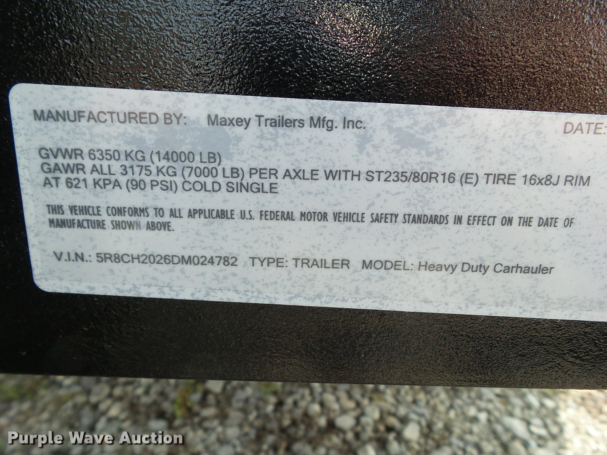 Purple Wave is selling a used Car or Utility Trailer in Iowa. This item is a 2013 Maxey trailer with the following: 22'L x 102"W, 18'L deck, 2'L dovetail, 5'L ramps, 26" floor height, Stake pockets, Rub rail, D-ring tie downs, Steel deck, Steel construction, 2 5/16" ball hitch, Single leg landing gear, Spring suspension, Electric brakes, Tandem axle, Steel wheels, Goodyear Wrangler LT235/85R16 tires, GVWR 14,000 lbs