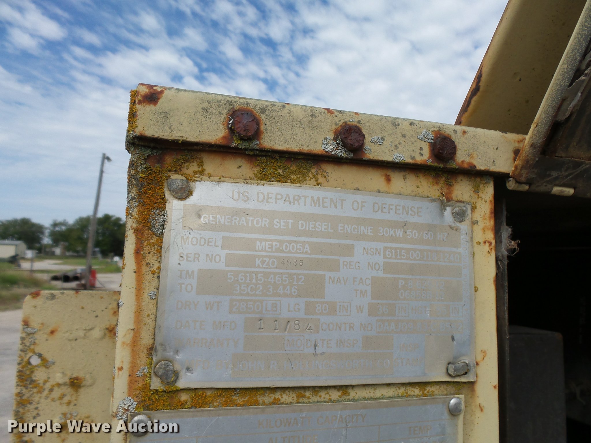 Purple Wave is selling a used Generator Set in Kansas. This item is a 1984 military generator with the following: Model MEP-005A, White six cylinder diesel engine, 30 kW, Three phase, Unit has not been used for several years, Serial KZ04588