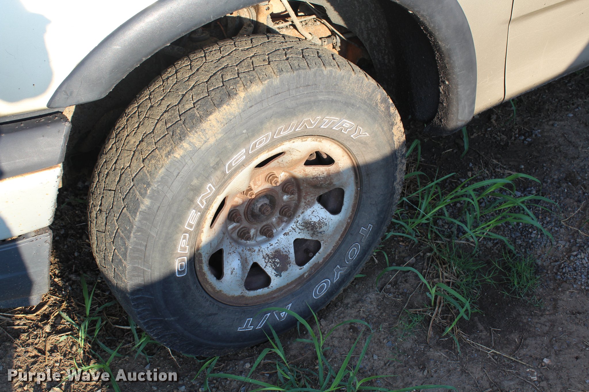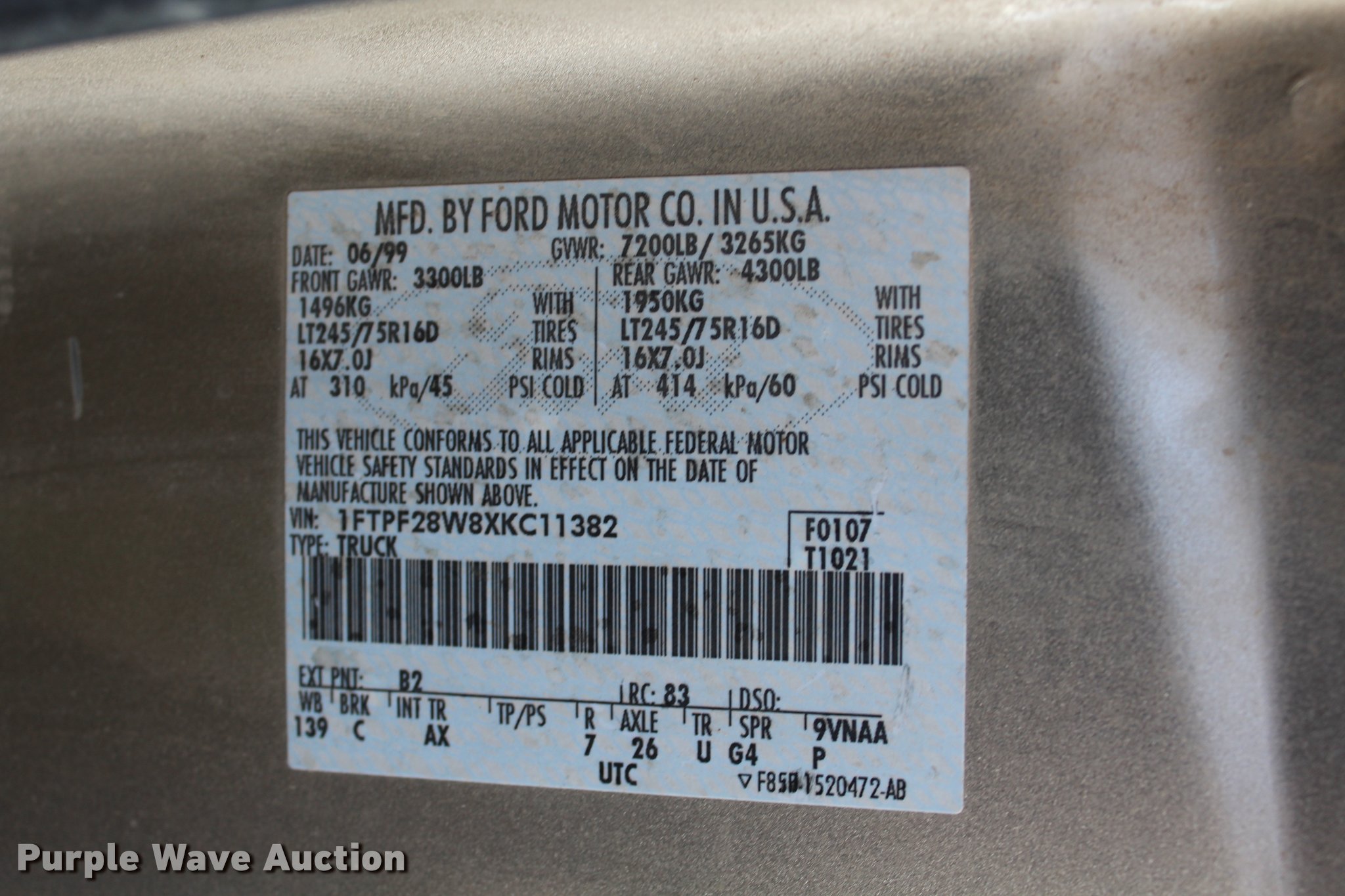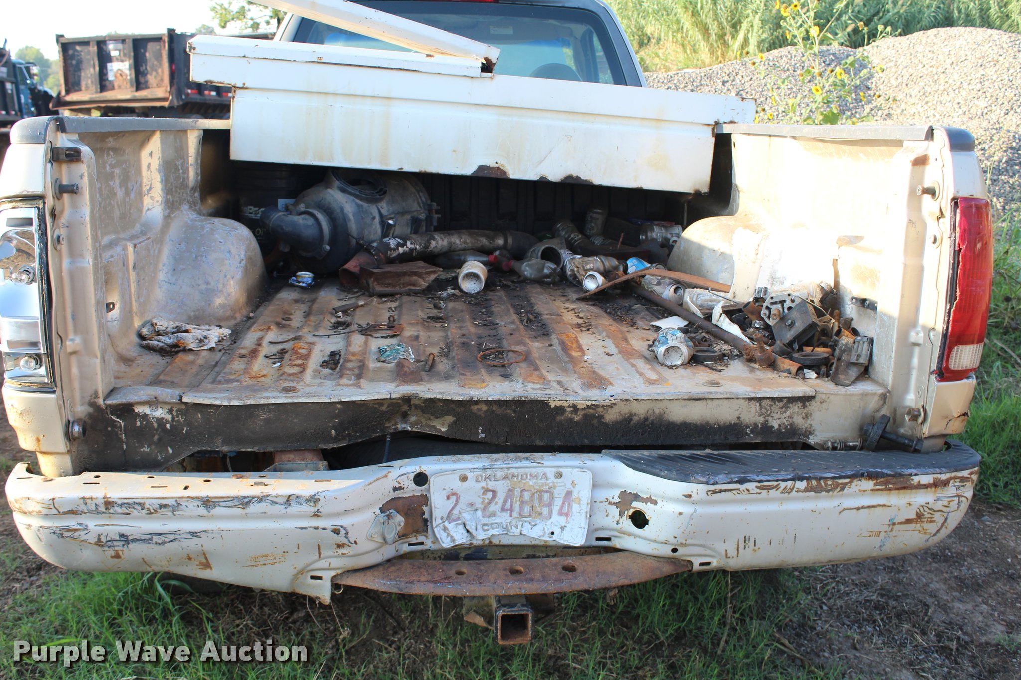 Purple Wave is selling a used 3/4 or 1 Ton Pickup or Van in Oklahoma. This item is a 1999 Ford F250 pickup truck with the following: Unknown miles on odometer, 4.6L V8 SOHC 16V gas engine, Automatic transmission, Four wheel drive, AC and heat, AM/FM, Manual windows and locks, Vinyl interior, (2) toolboxes, Receiver hitch, Trailer wiring, LT245/75R16 tires, Flat tires, Taillight lenses missing, Cracked windshield, Unknown operating condition