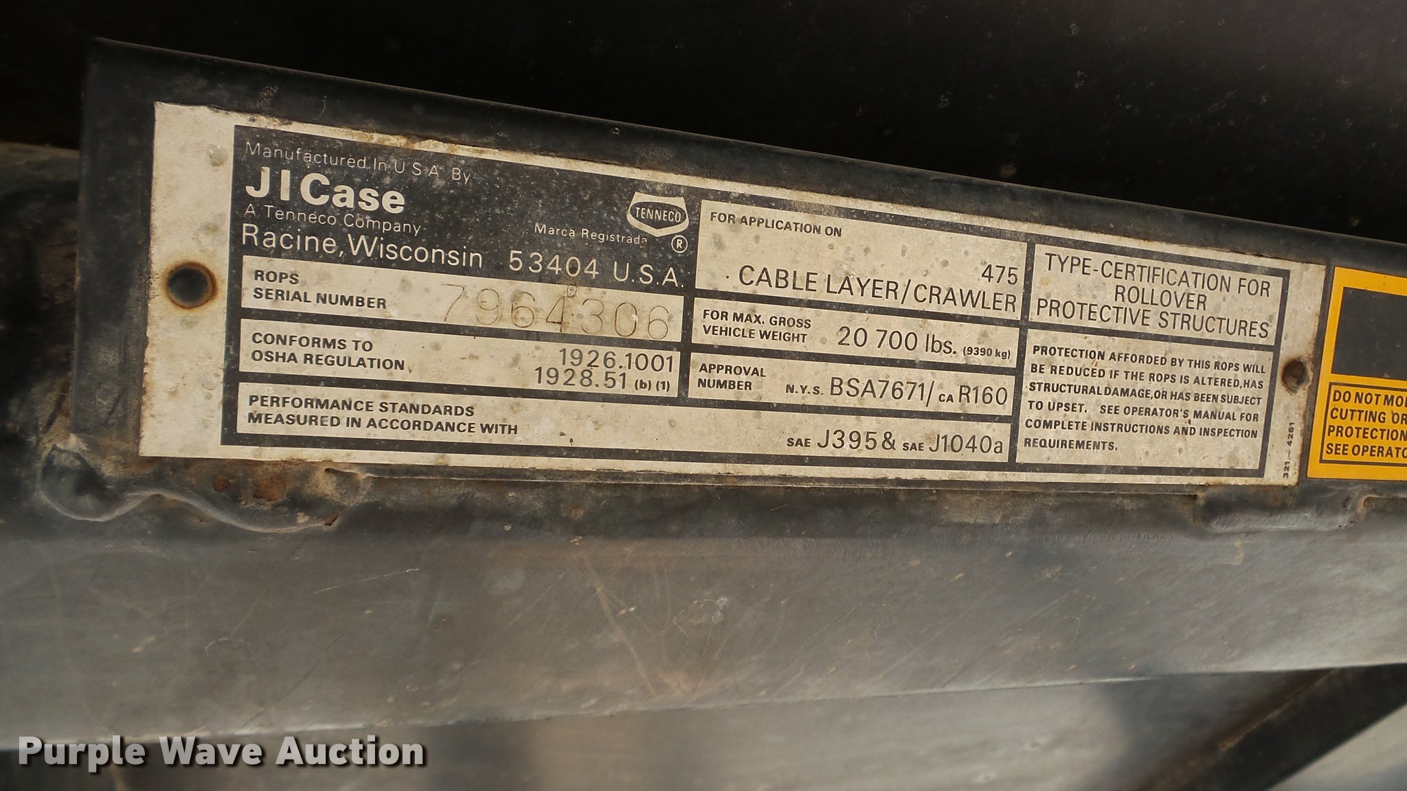 Purple Wave is selling a used Crawler Cable Plow in Kansas. This item is a 1978 Case 475 cable plow with the following: 334 hours on meter, Four cylinder diesel engine, Model A3365, Serial 101540, Hydrostatic transmission, OROPS, Vibratory plow, Hydraulic swing, Hydraulic lift, No plow blade, 55" reel carrier, 20"W x 2"H single grouser track pads, Additional vibratory plow parts, Owner's manual, Reel carrier cylinder leak, Fluid leak, possible transmission leak, Serial 3068058