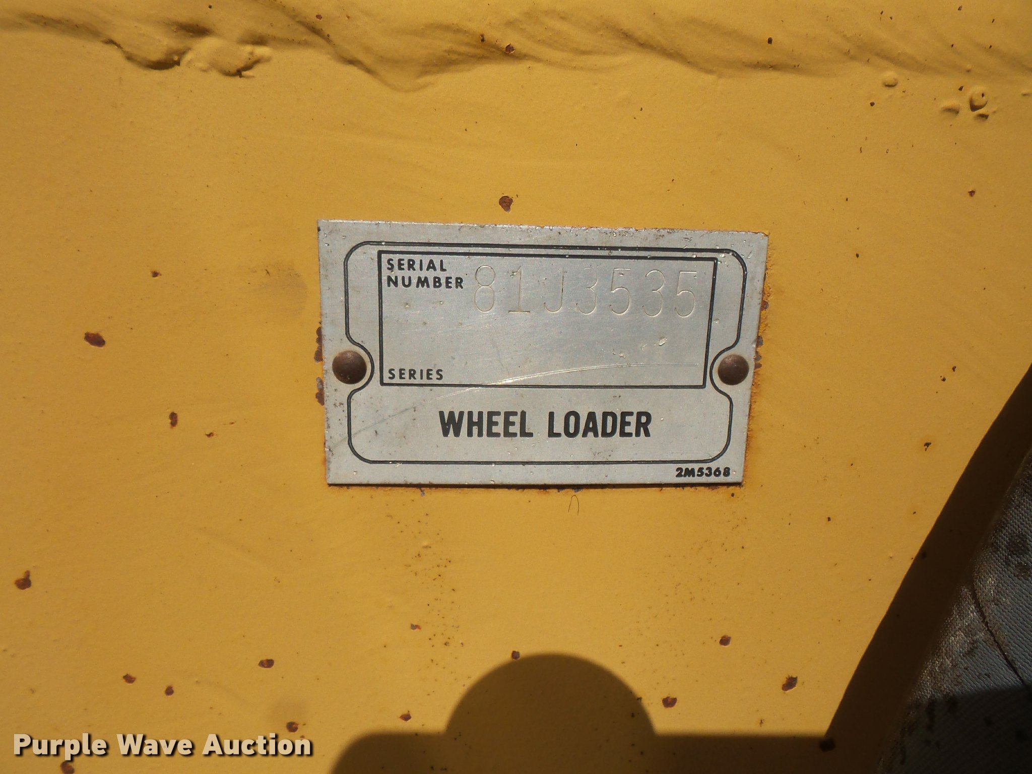 Purple Wave is selling a used Wheel Loader in Kansas. This item is a 1971 Caterpillar 950 wheel loader with the following: 3,902 hours on meter, Caterpillar four cylinder diesel engine, Powershift transmission, 4F-4R gears, EROPS, Two-lever bucket controls, 106"W general purpose bucket, Bolt-on cutting edge, 20.5-25 tires, Windows cracked, Brakes need work, Serial 81J3535