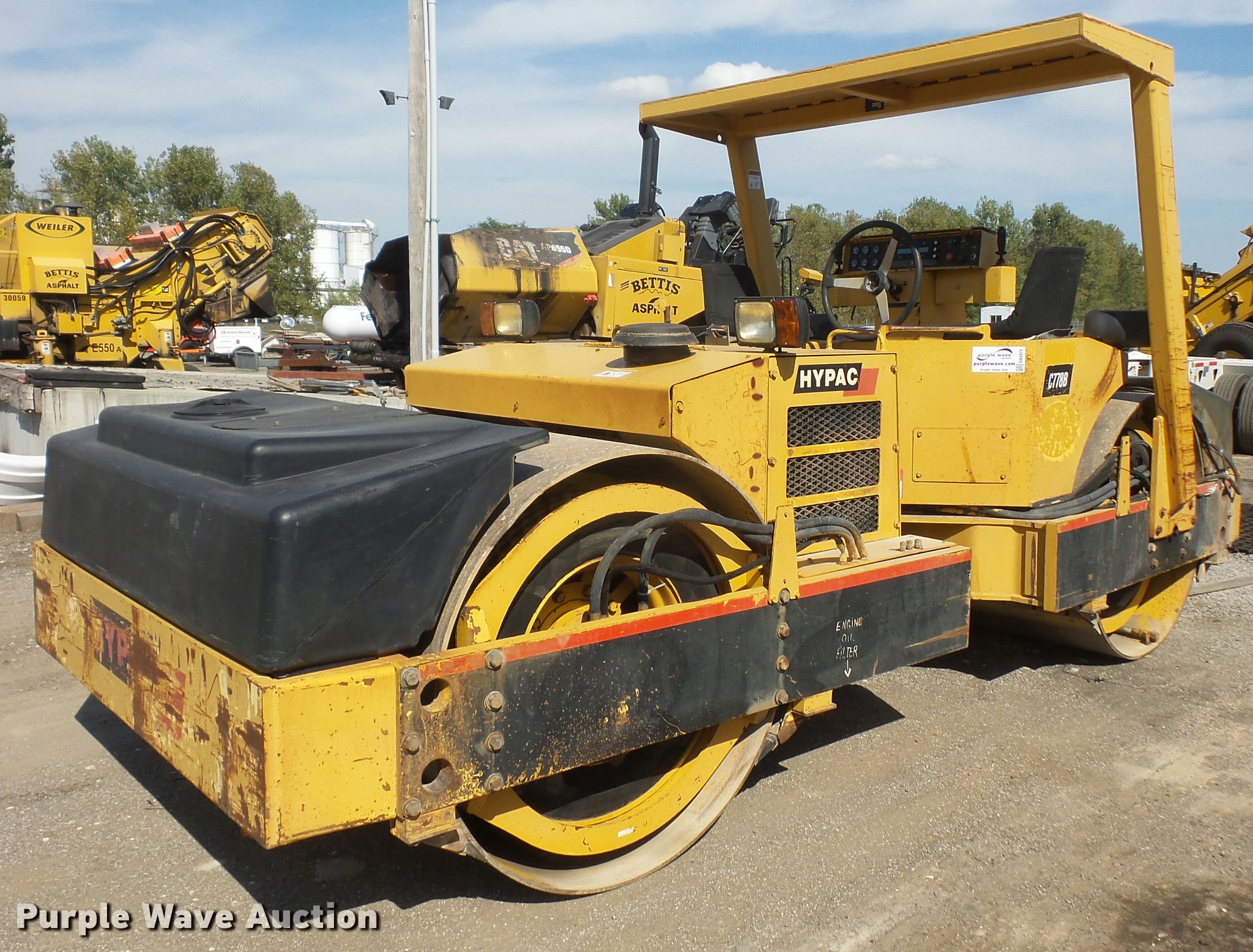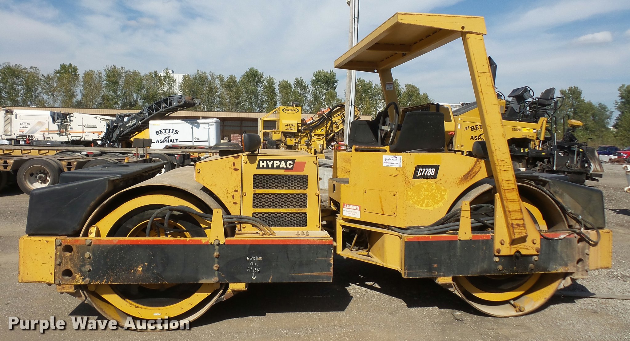 Hypac C778B double drum vibratory roller. 9,061 hours on meter, Cummins 3.9L four cylinder diesel engine, Hydrostatic transmission, Canopy, 78"W x 48" diameter smooth drums Double vibratory system, Independent drum controls, Drum scrapers, Serial B215C1565V. Bettis Asphalt. 1800 NW Brickyard Road. Topeka, KS 66601