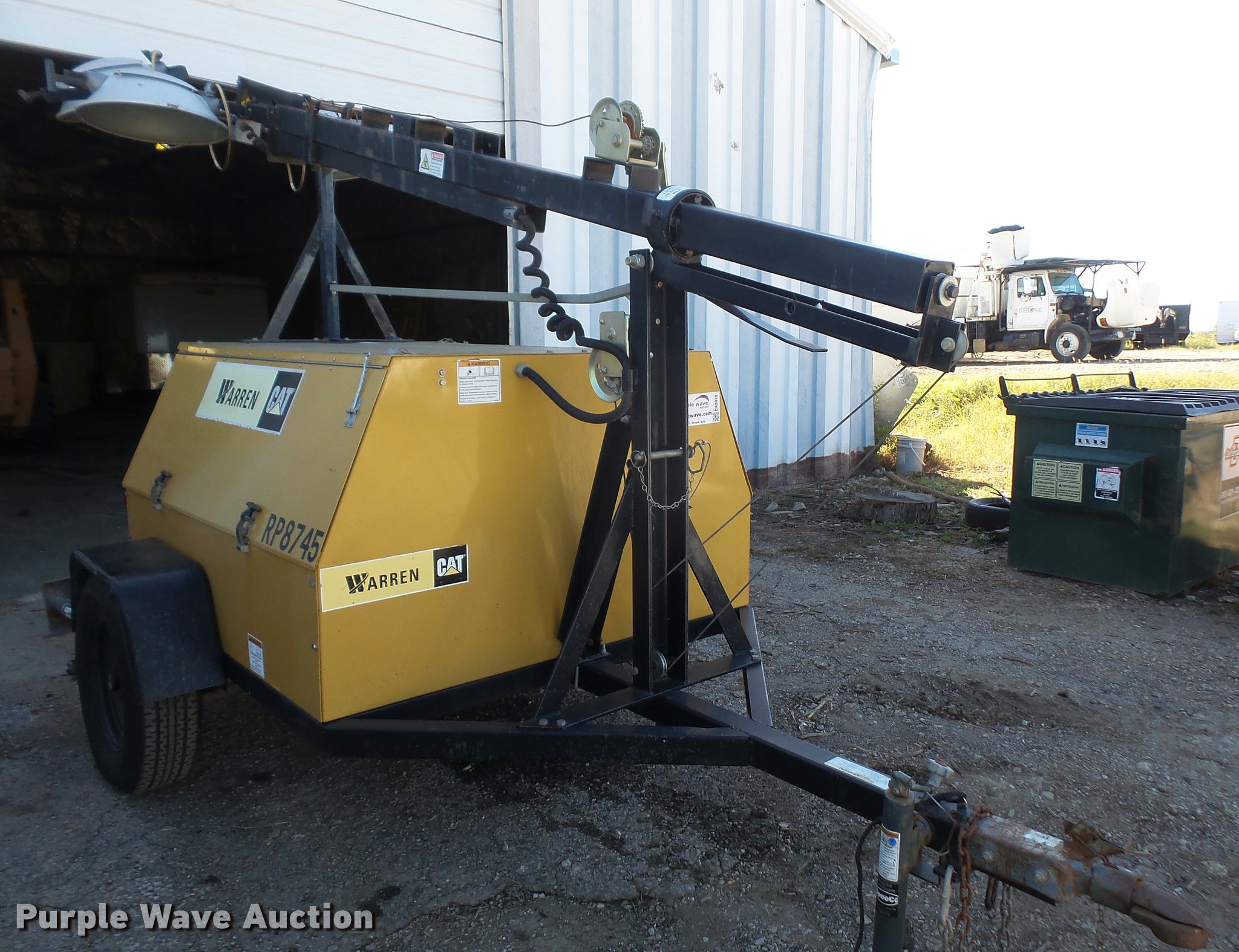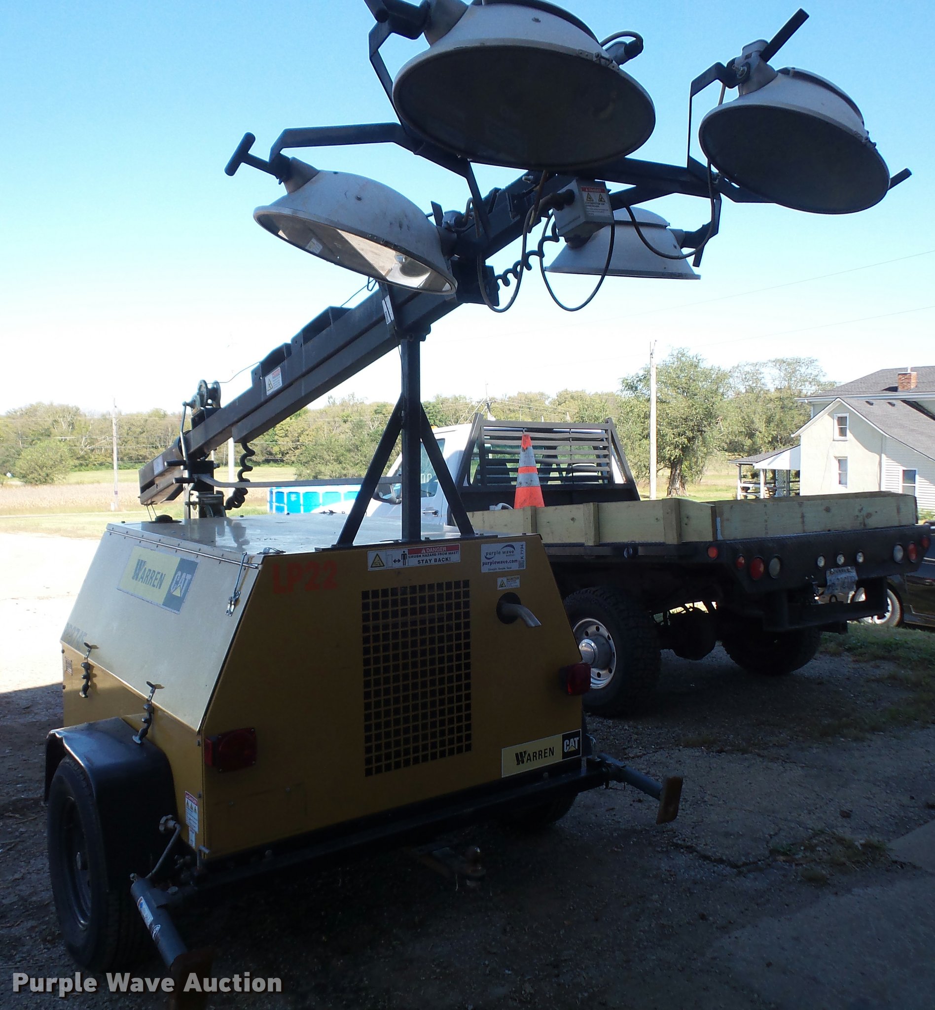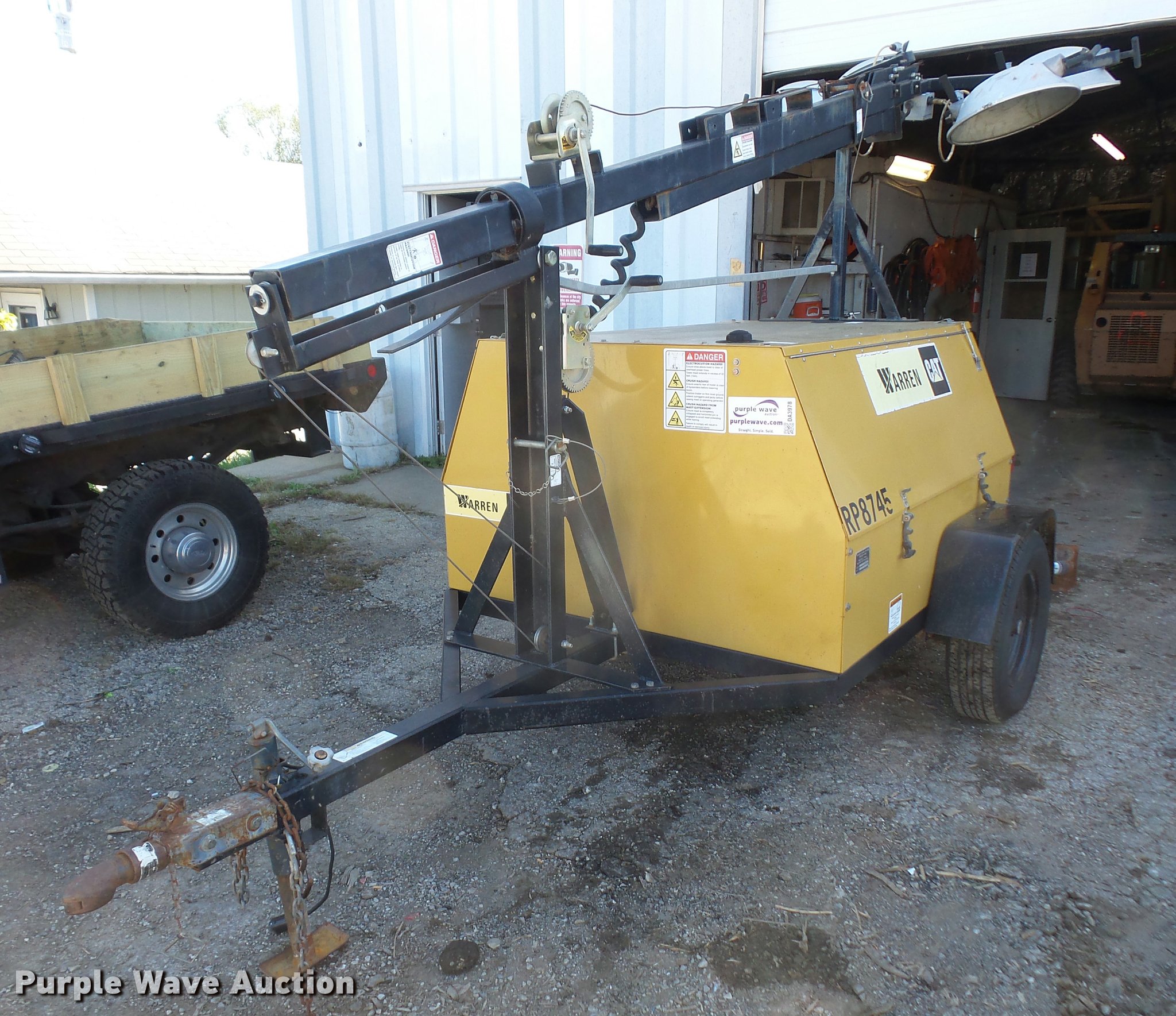 Purple Wave is selling a used Light Plant in Kansas. This item is a Warren Power Systems WCW64MH light plant with the following: Caterpillar 9H3XL1.13LCS 1.3L three cylinder diesel engine, Single phase, 120/240V, (4) bulbs, 1,000 watts, Manual hoist, Stabilizers, 2" ball hitch, 205/75R15 tires