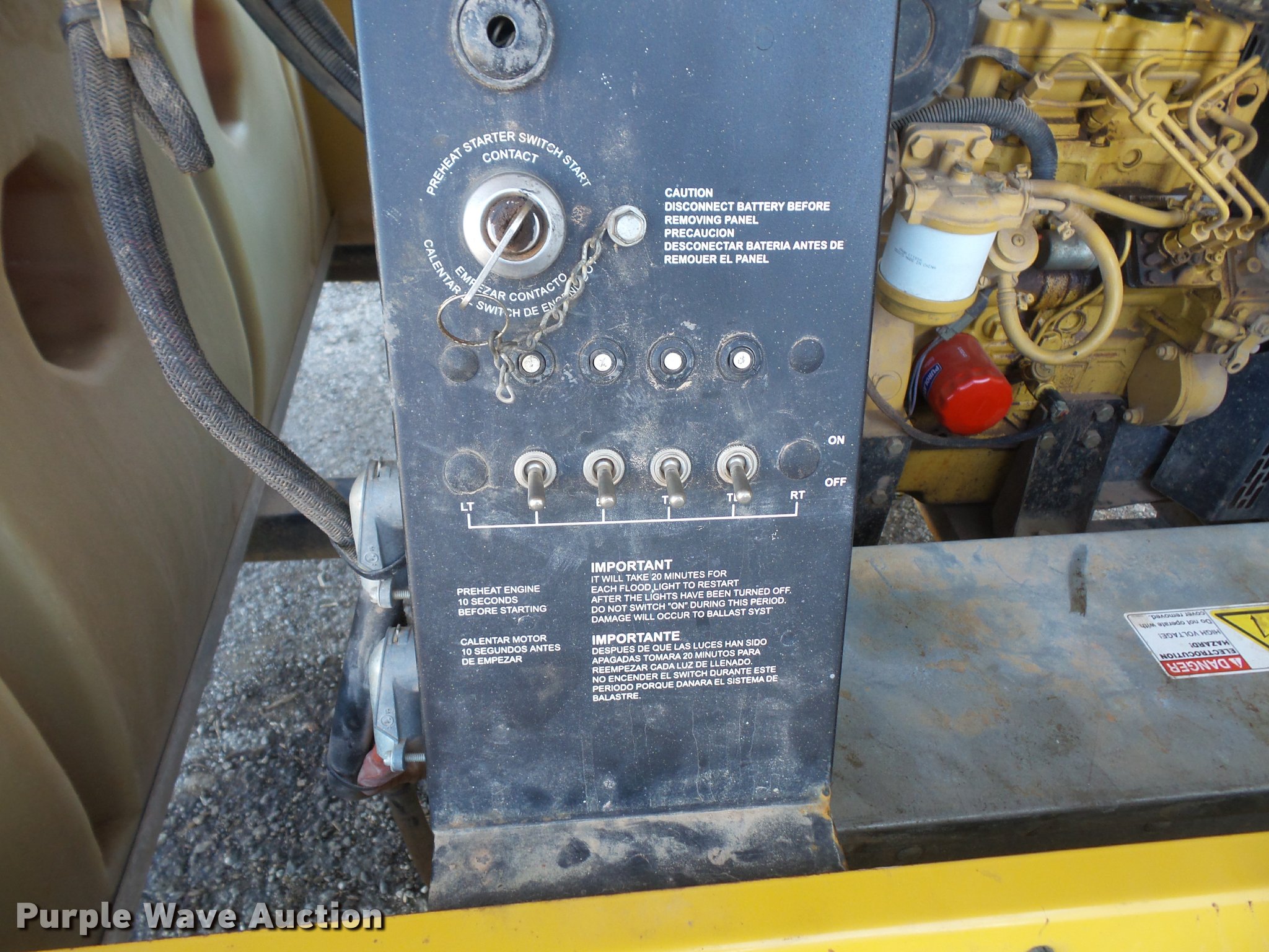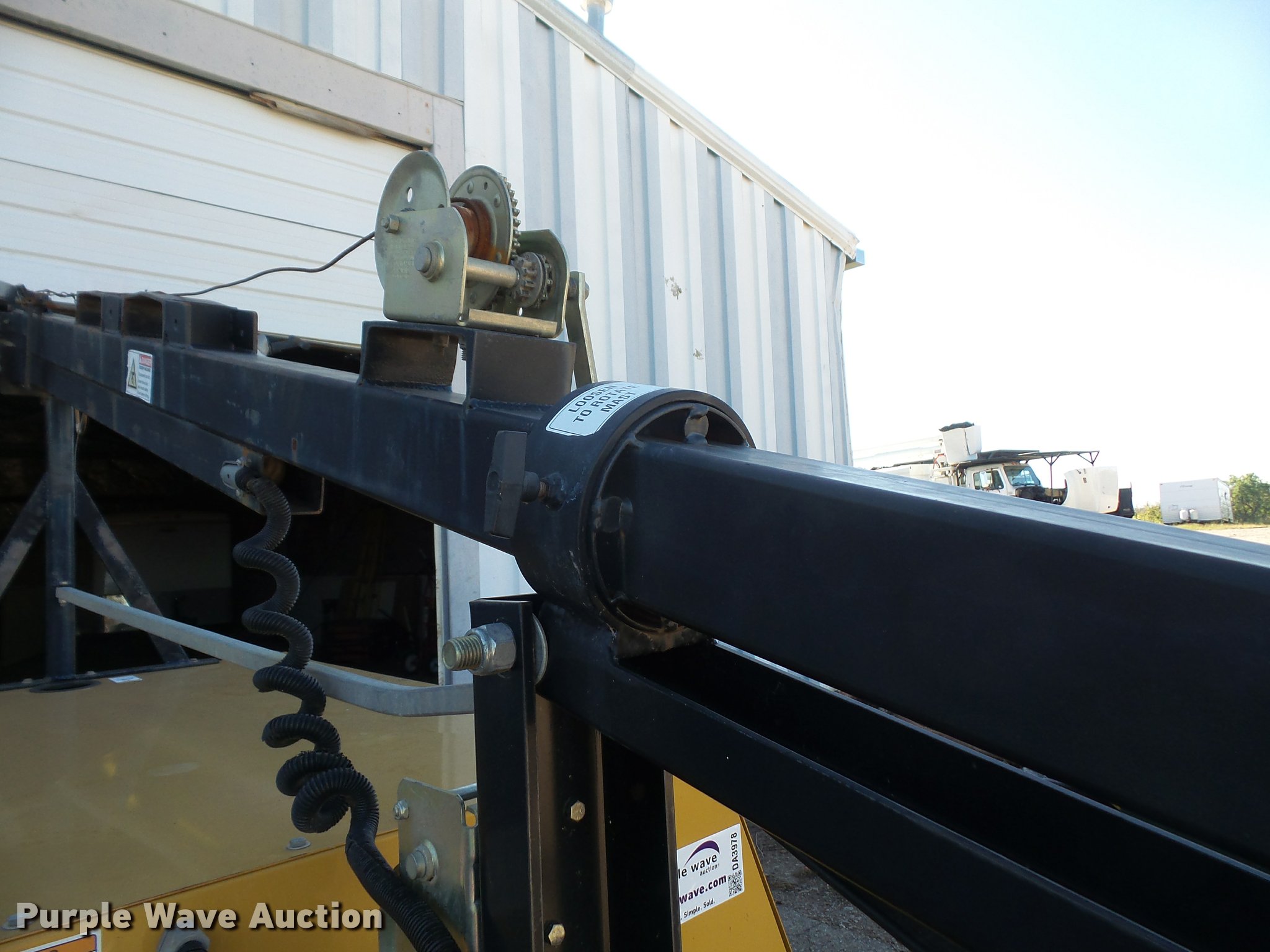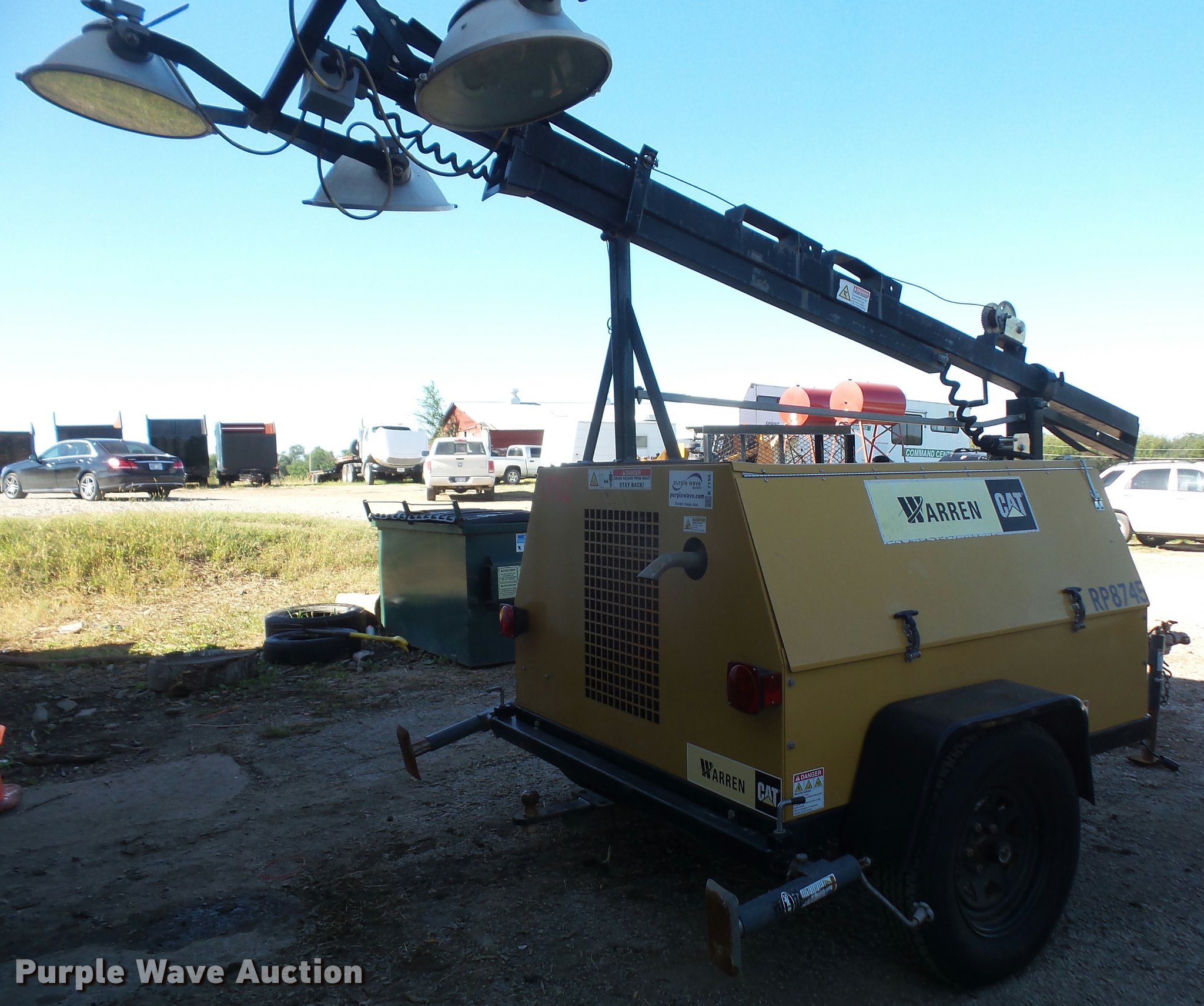 Purple Wave is selling a used Light Plant in Kansas. This item is a Warren Power Systems WCW64MH light plant with the following: Caterpillar 9H3XL1.13LCS 1.3L three cylinder diesel engine, Single phase, 120/240V, (4) bulbs, 1,000 watts, Manual hoist, Stabilizers, 2" ball hitch, 205/75R15 tires