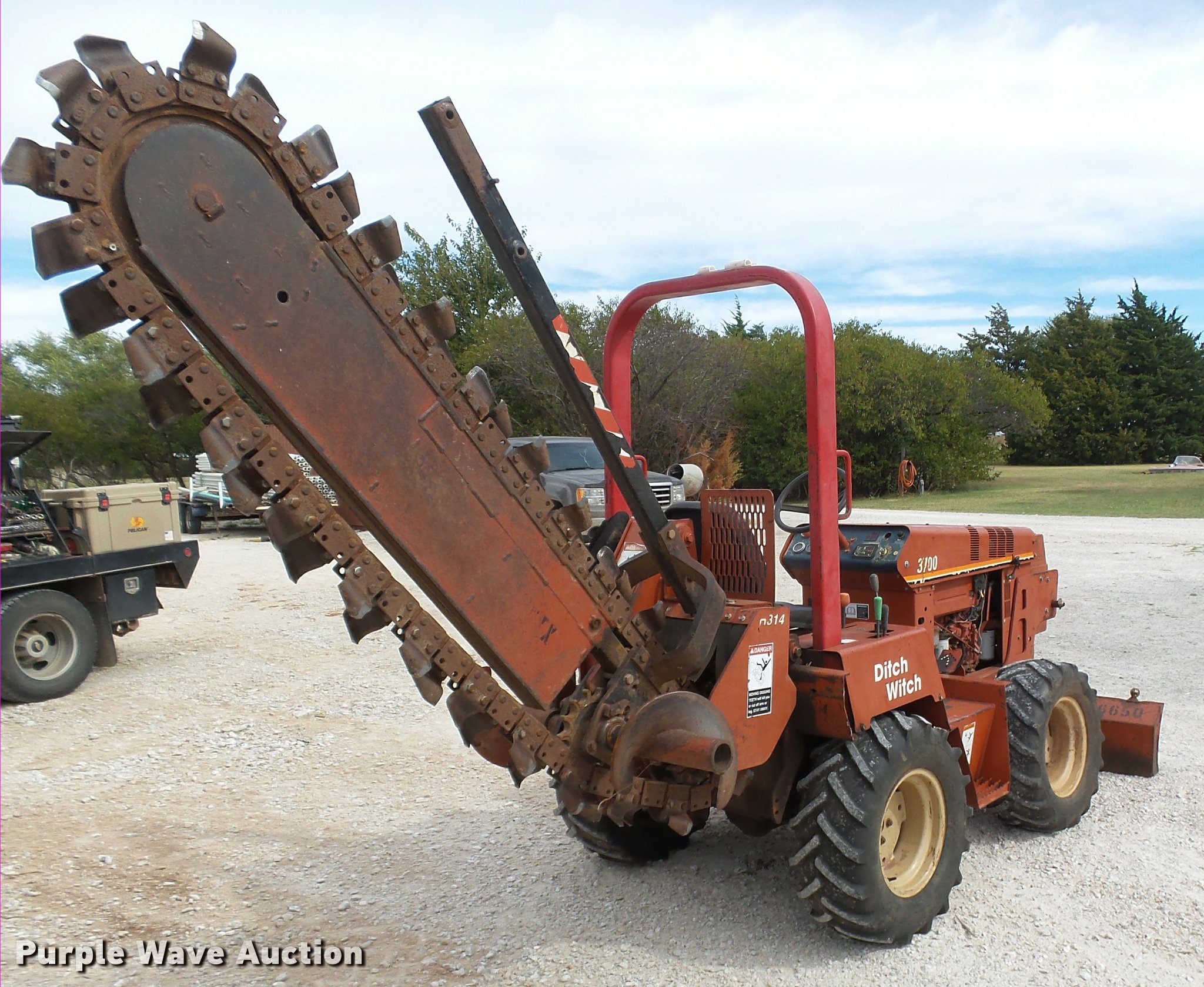 Purple Wave is selling a used Trencher or Rock Saw in Oklahoma. This item is a 2004 Ditch Witch 3700 trencher with the following: 914 hours on meter, Hours may vary, unit is still in use, Deutz F3L1011F diesel engine, Creep control transmission, Four wheel drive, Suspension seat, 64" four-way back fill blade, Trencher model H314 trencher, 5' maximum digging depth, 5" cutting width, Crumber shoe, Hydraulic side shift, 29 x 12.50-15 tires, Hydraulic cylinders leak, Serial 3Y0193